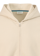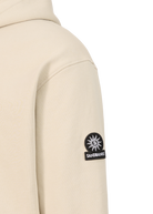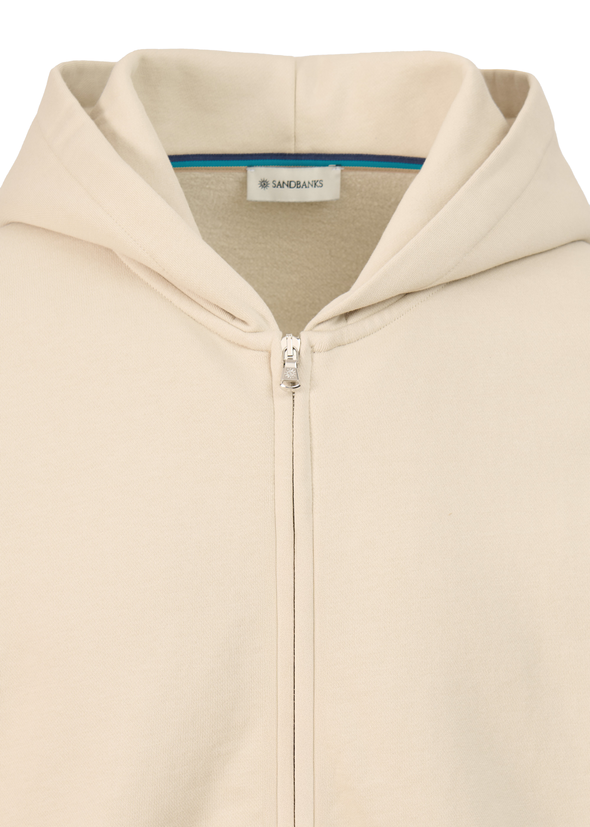 Our men's Sandbanks badge logo zip hoodie in stone is constructed with a 400gsm diagonal knitted fabric that features a slight brushed back for a superior soft feeling and warmth, whilst remaining breathable. Made from 100% BCI Cotton with a sleeve embroidered badge logo and a silver Lampo two way zip.