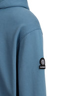 Our men's Sandbanks badge logo zip hoodie in teal is constructed with a 400gsm diagonal knitted fabric that features a slight brushed back for a superior soft feeling and warmth, whilst remaining breathable. Made from 100% BCI Cotton with a sleeve embroidered badge logo and a silver Lampo two way zip.