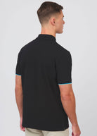Sandbanks men's badge logo zip polo shirt in black, made from 100% organic cotton. This classic fitting zip polo shirt features an embroidered badge logo on the chest, tri-colour tipped knitted cuff and back neck binding.