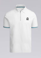 Sandbanks men's badge logo zip polo shirt in white, made from 100% organic cotton. This classic fitting zip polo shirt features an embroidered badge logo on the chest, tri-colour tipped knitted cuff and back neck binding.