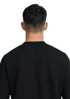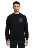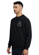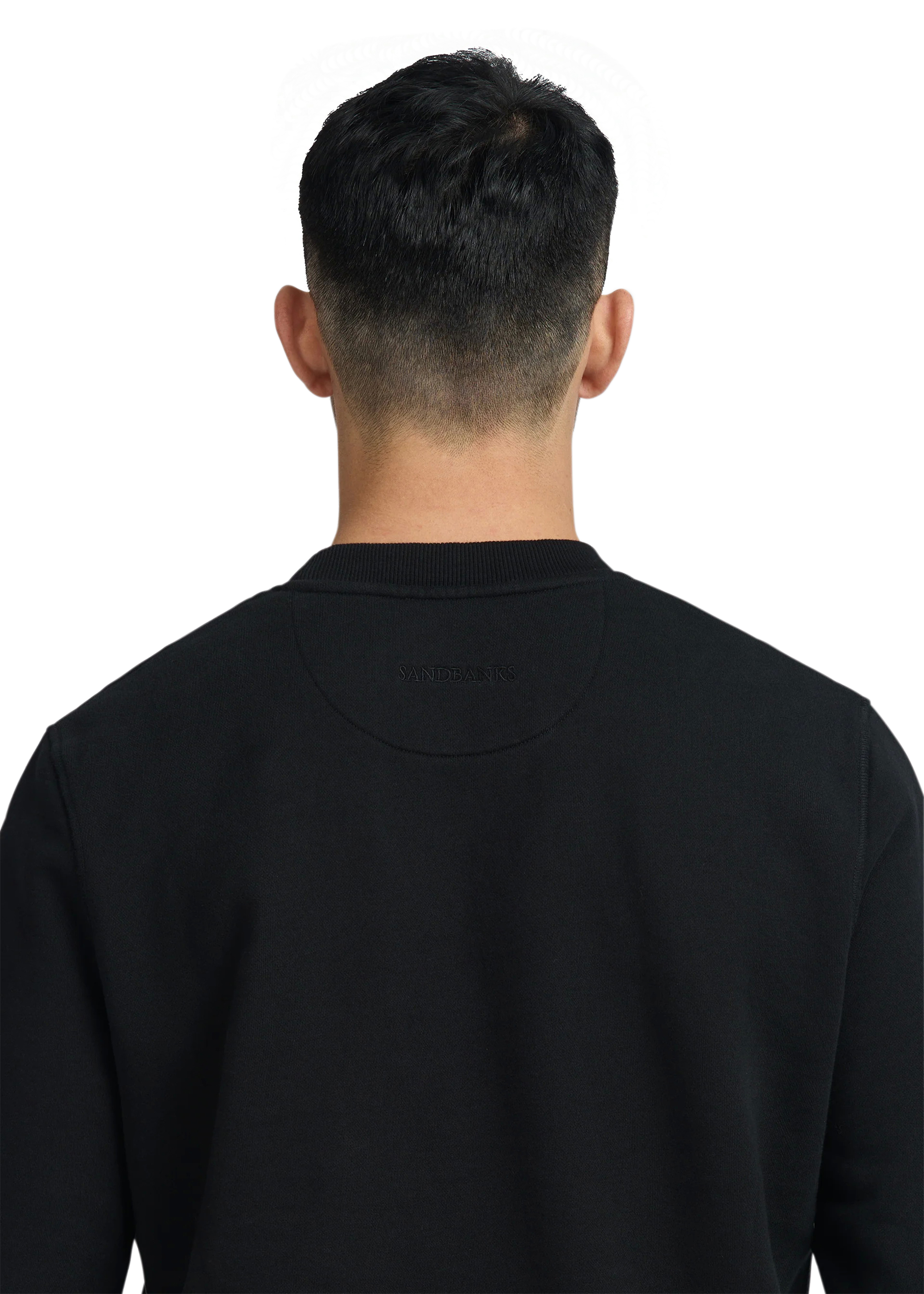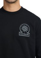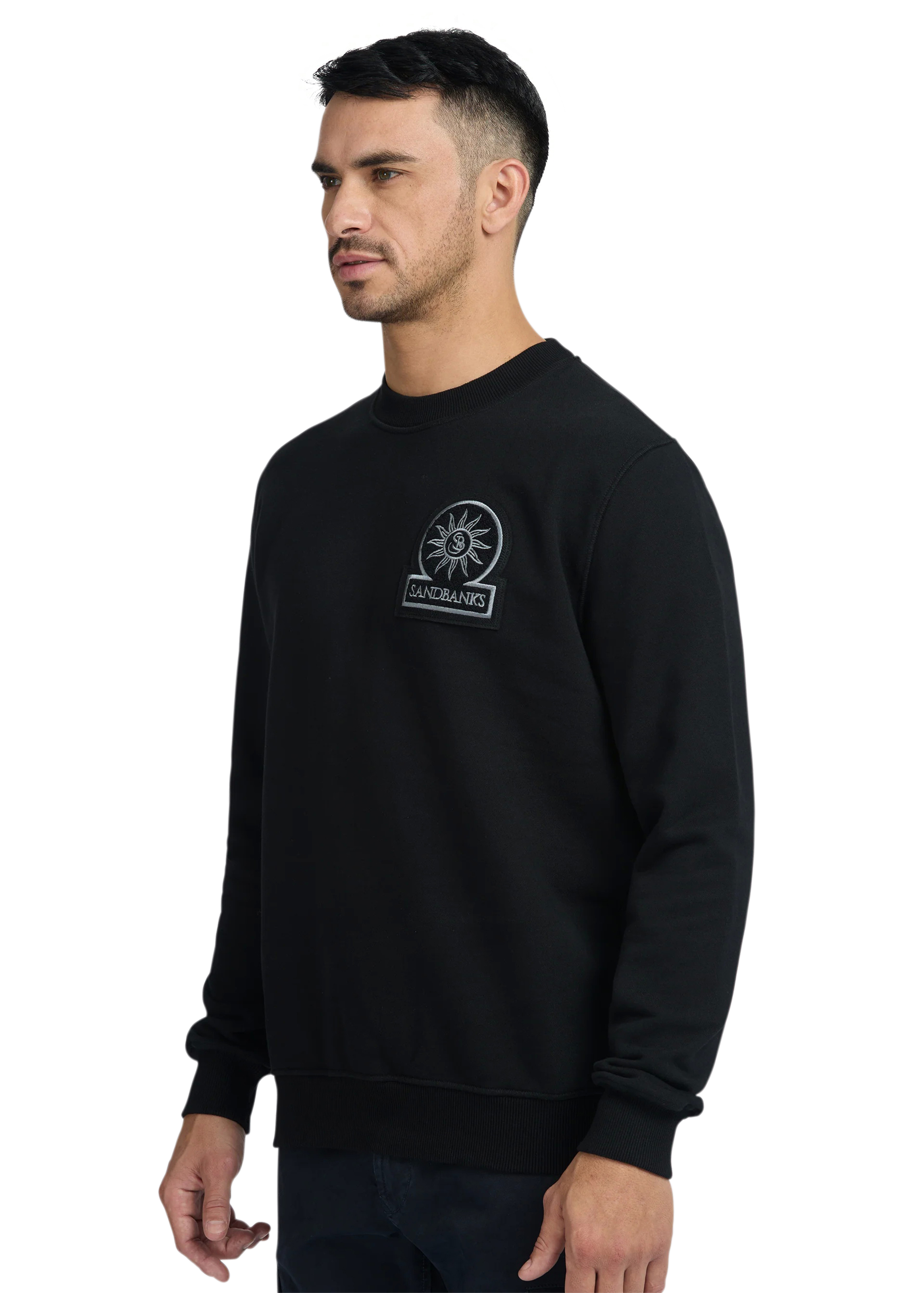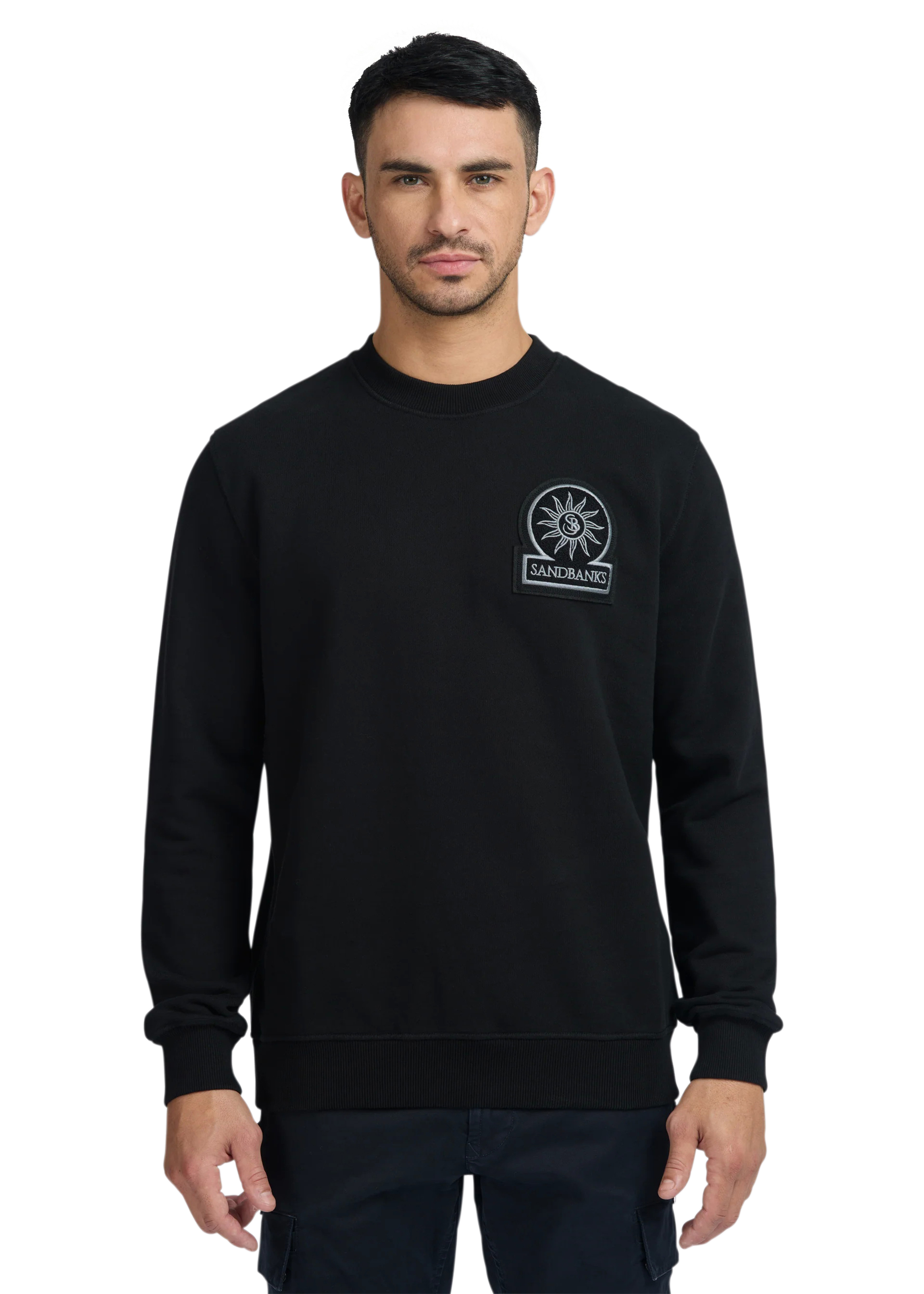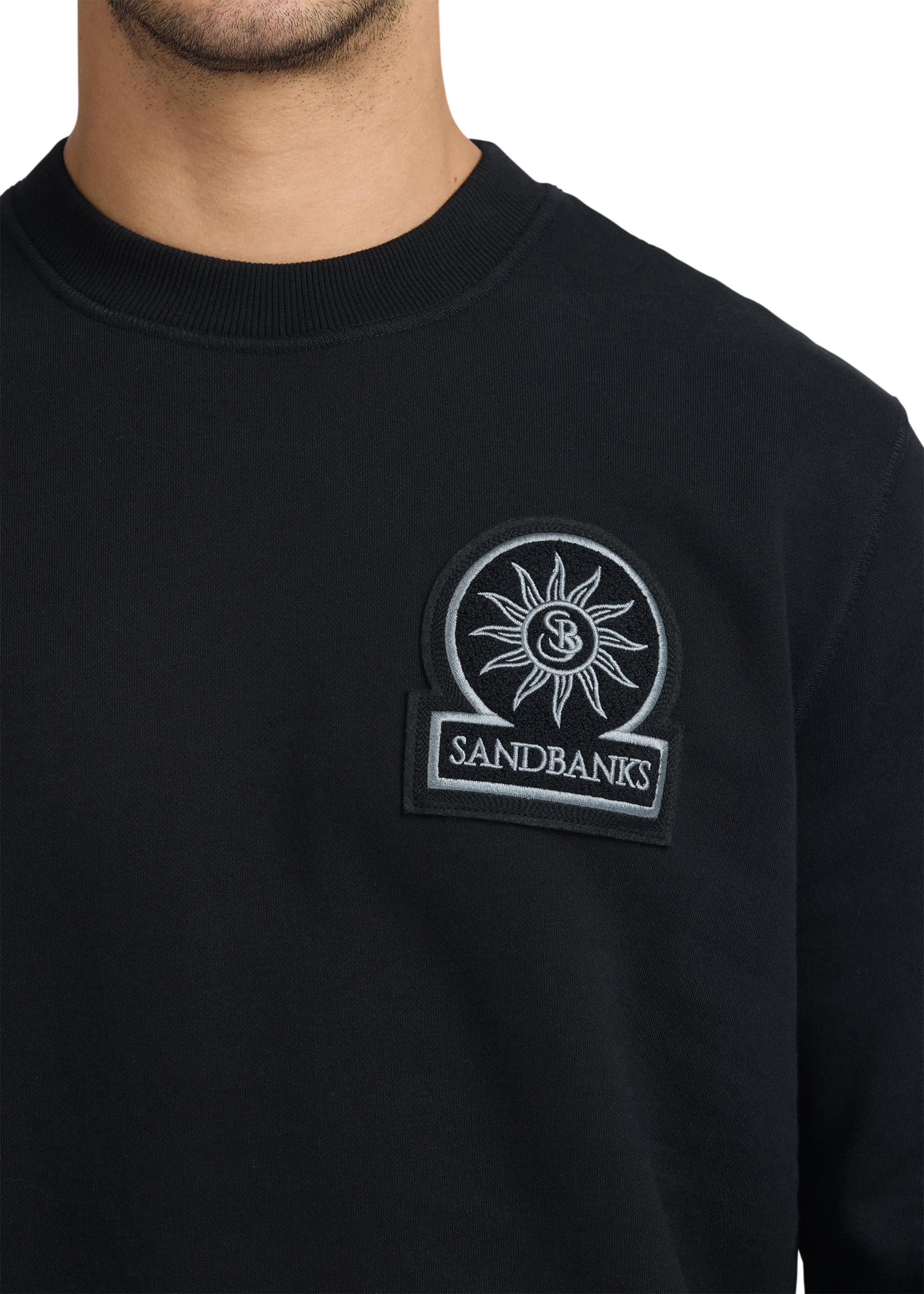 Sandbanks men's boucle badge sweatshirt in black, made from 100% organic cotton diagonal weave knit that is brushed internally for a soft and warm feel. This sweatshirt features a Sandbanks large boucle badge logo on chest (chenille), tri-colour neck binding, ribbed cuff and hem.