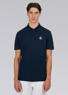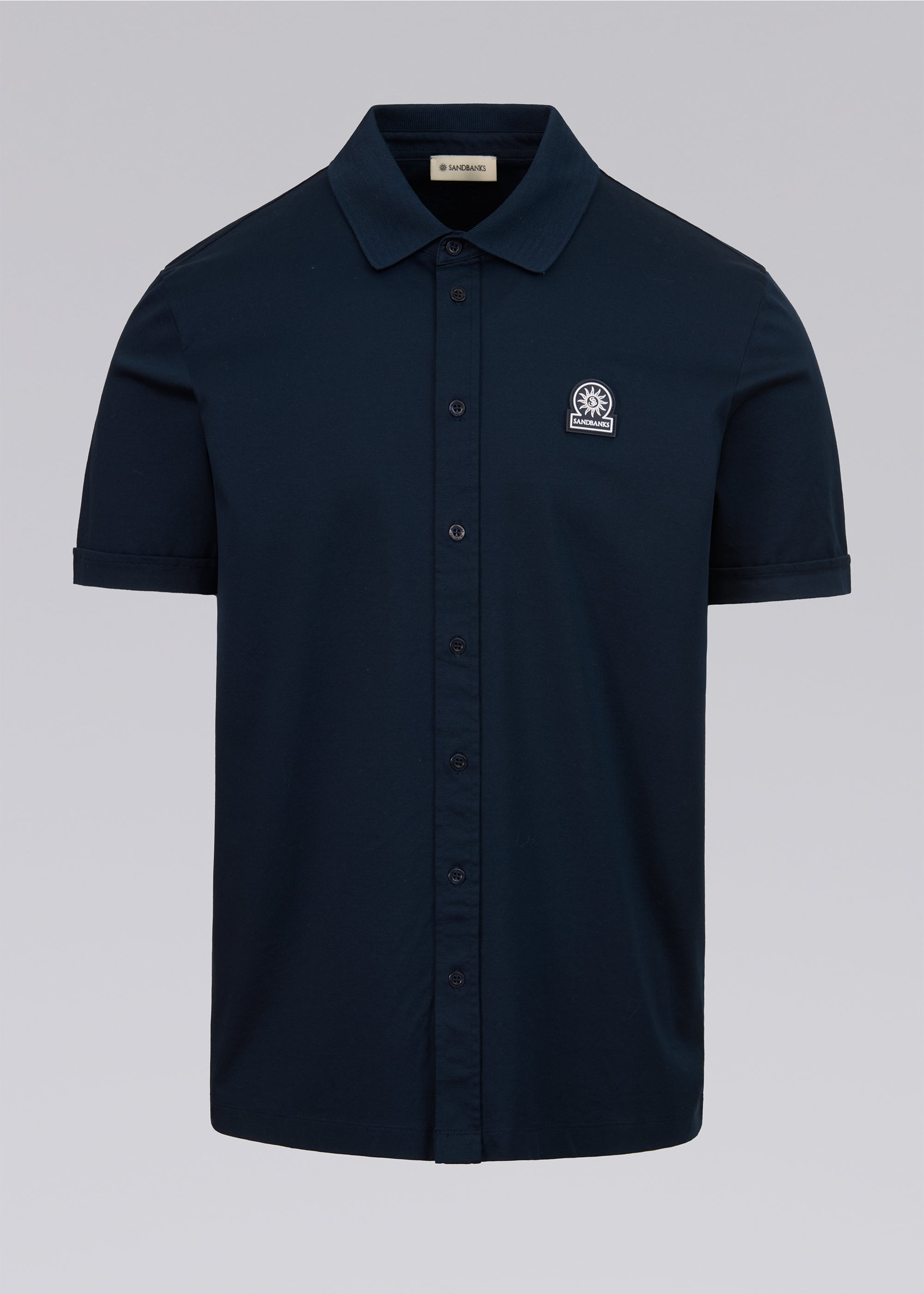Sandbanks men's full button Interlock polo shirt in navy, made from 100% mercerised interlock bci cotton for a soft and luxurious handle. This polo shirt features a rubber Sandbanks badge logo on the chest with visible branding, tri-colour neck binding and navy opaque Sandbanks branded buttons.
