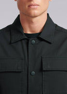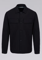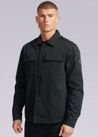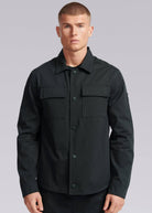 Sandbanks men's gabardine button down overshirt in black, made from a cotton stretch gabardine with a soft and luxurious handle. This overshirt features a Sandbanks logo badge embroidery on the sleeve, tri-colour neck binding, 2 chest pockets, and black rubberised buttons at centre front and cuff.