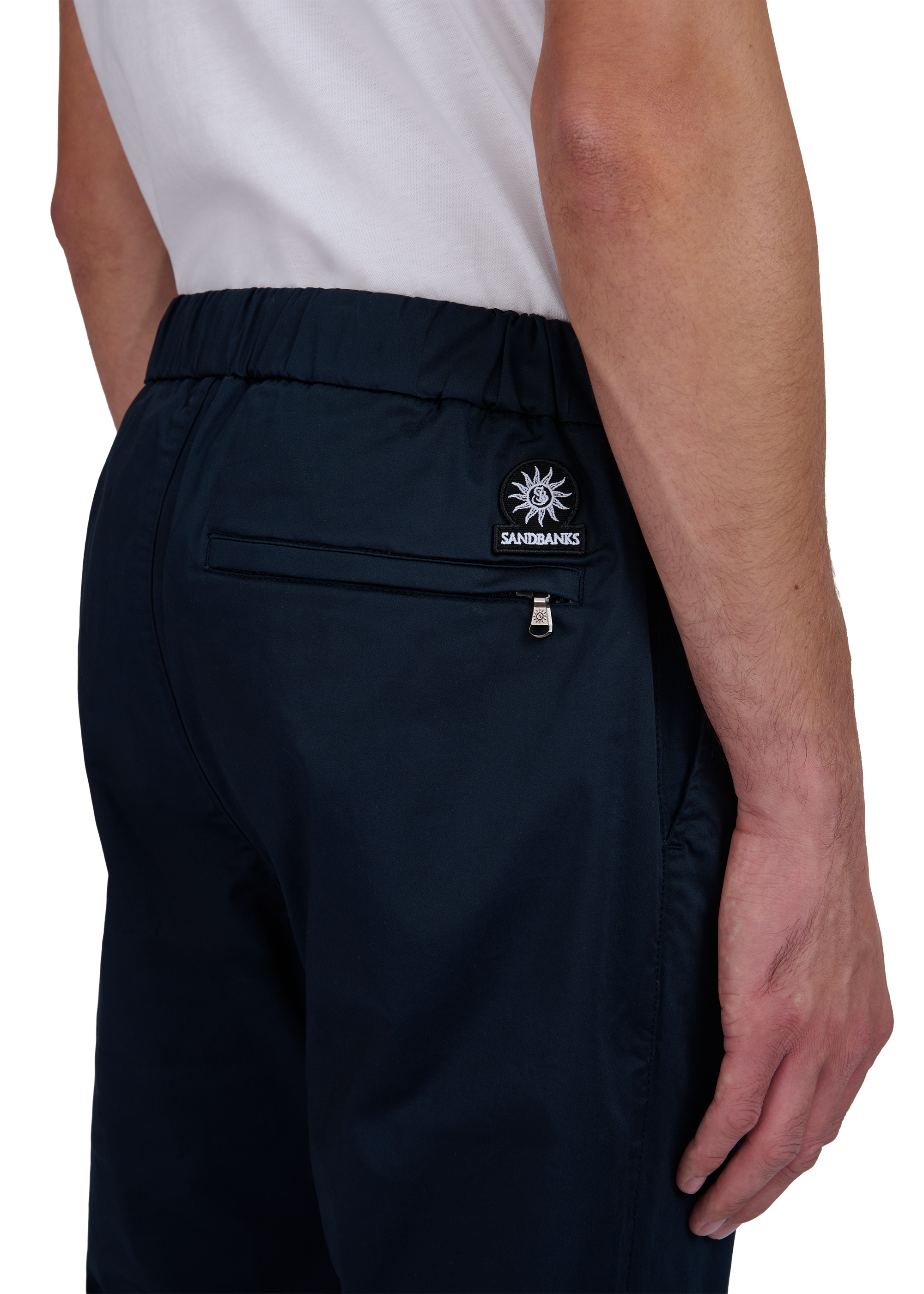 Sandbanks men’s gabardine jogger trousers in navy blend refined style with functional design. Crafted for both elegance and performance, these trousers draw inspiration from utilitarian wear that meets leisure.