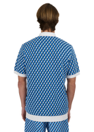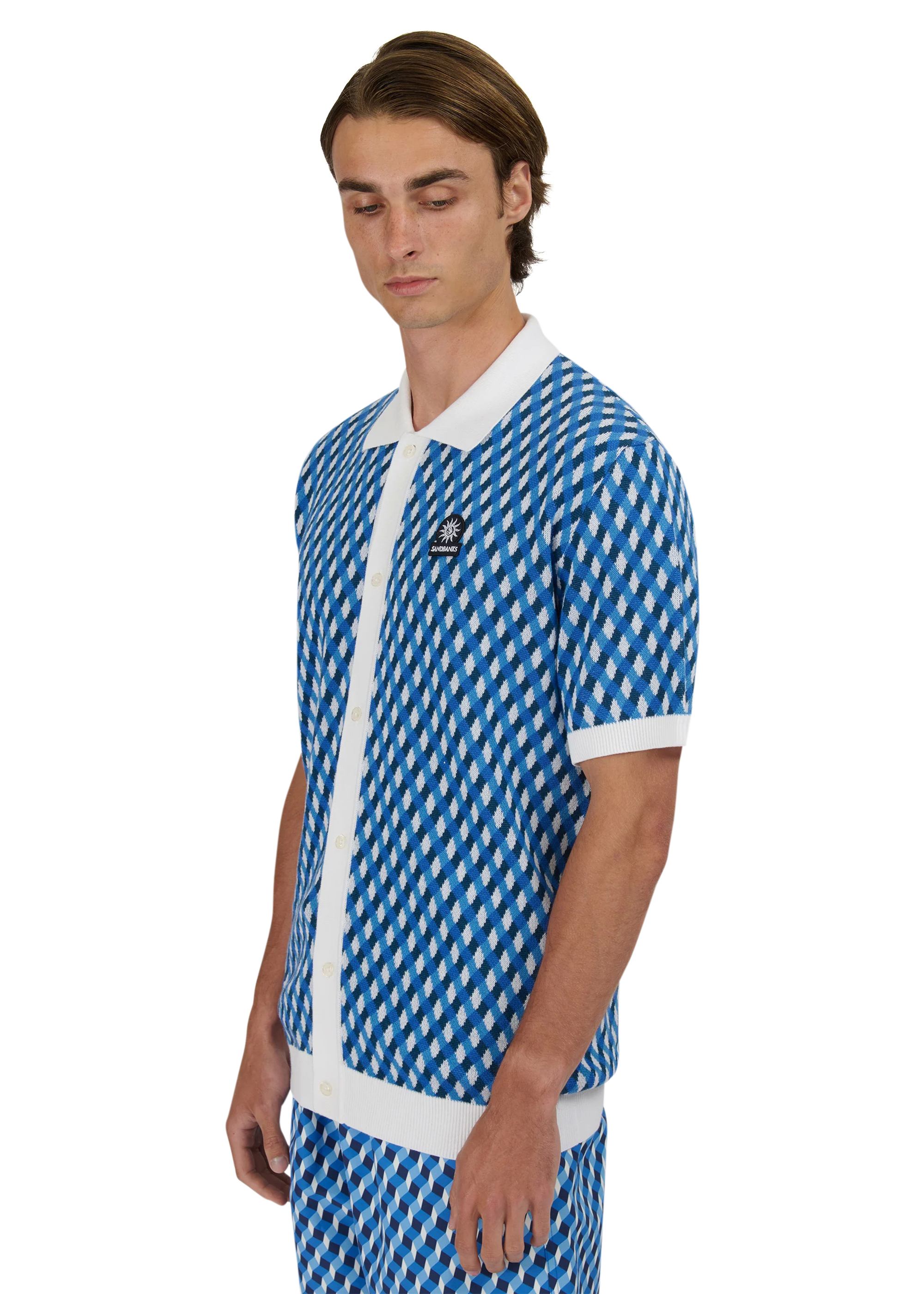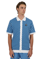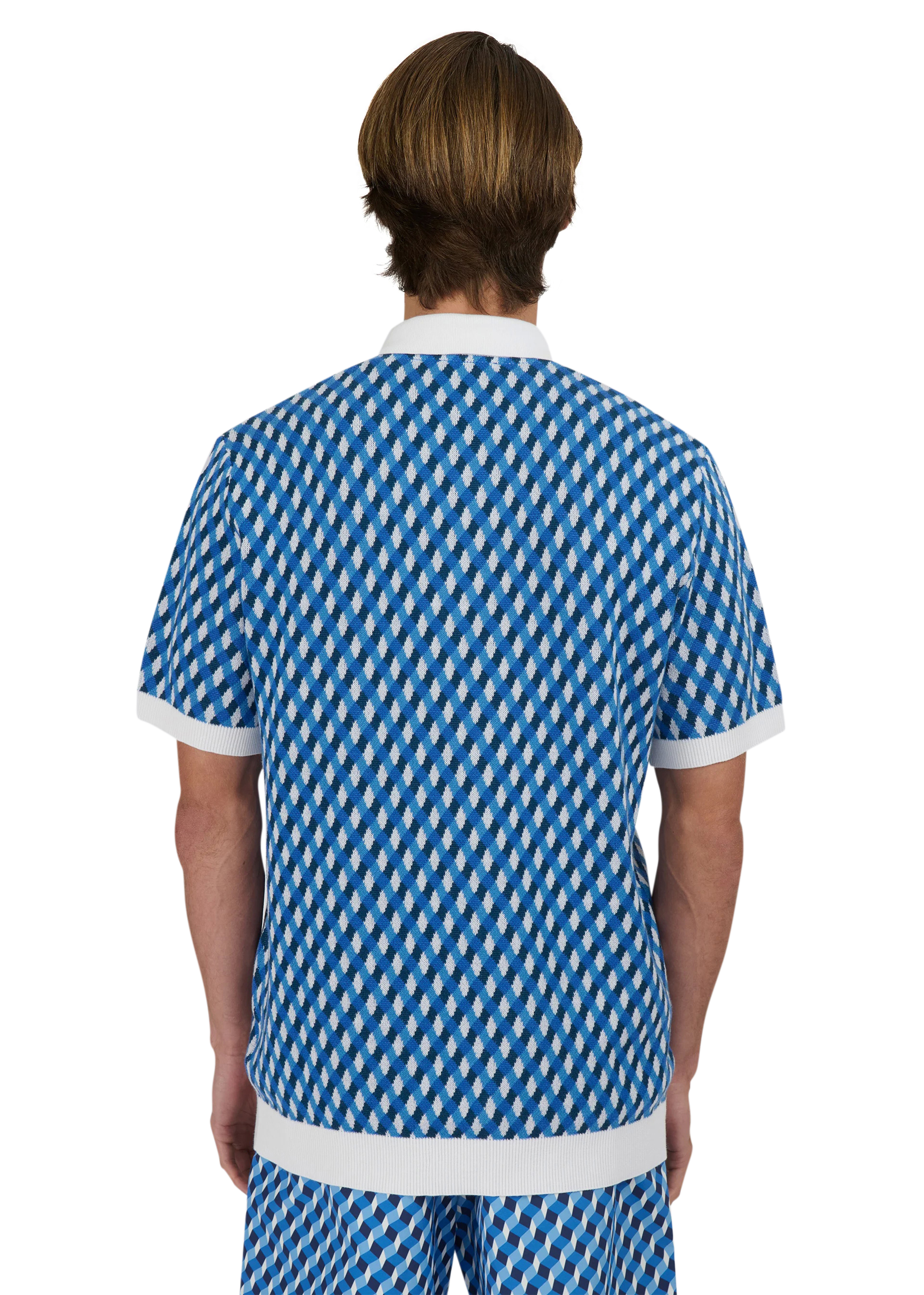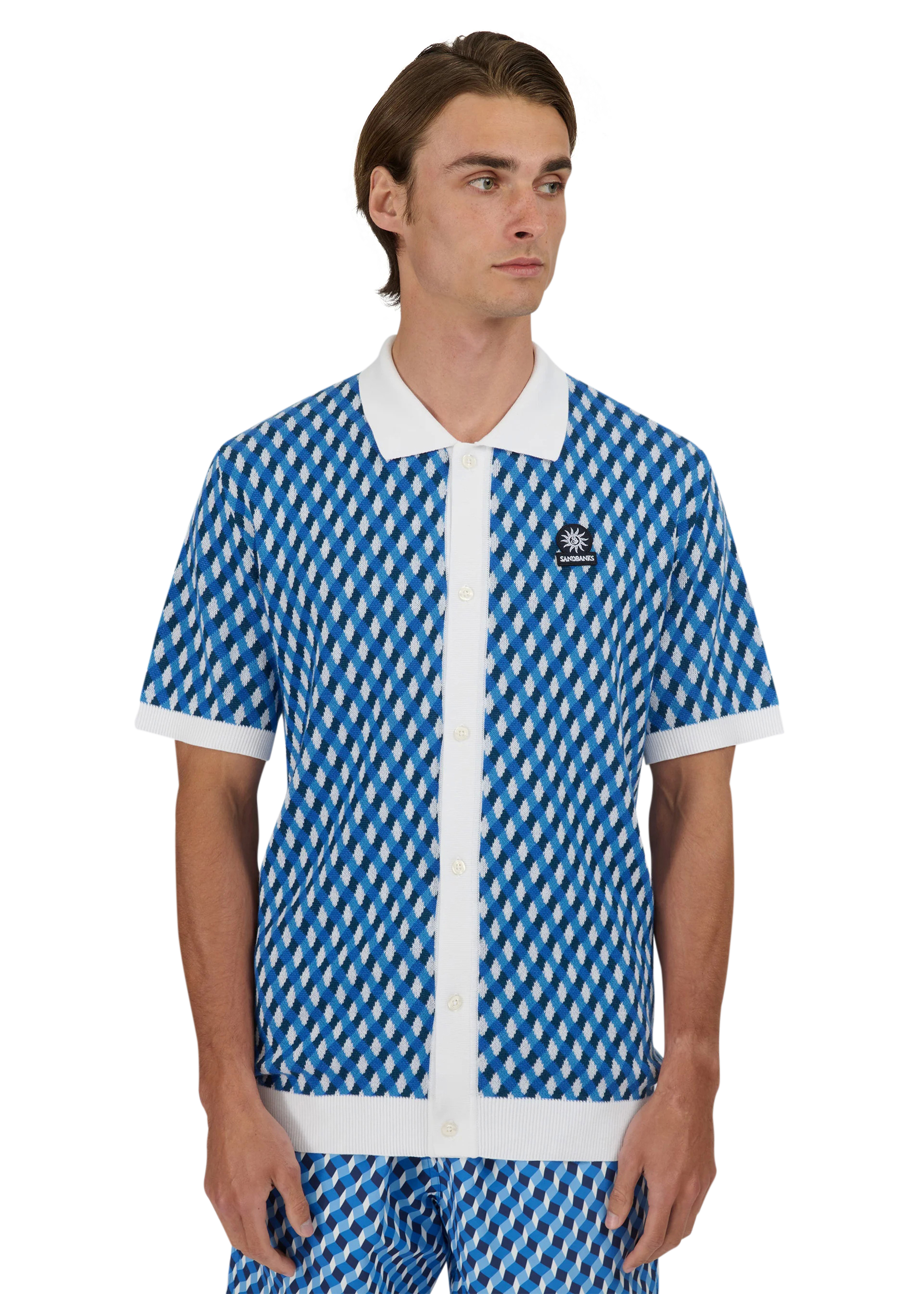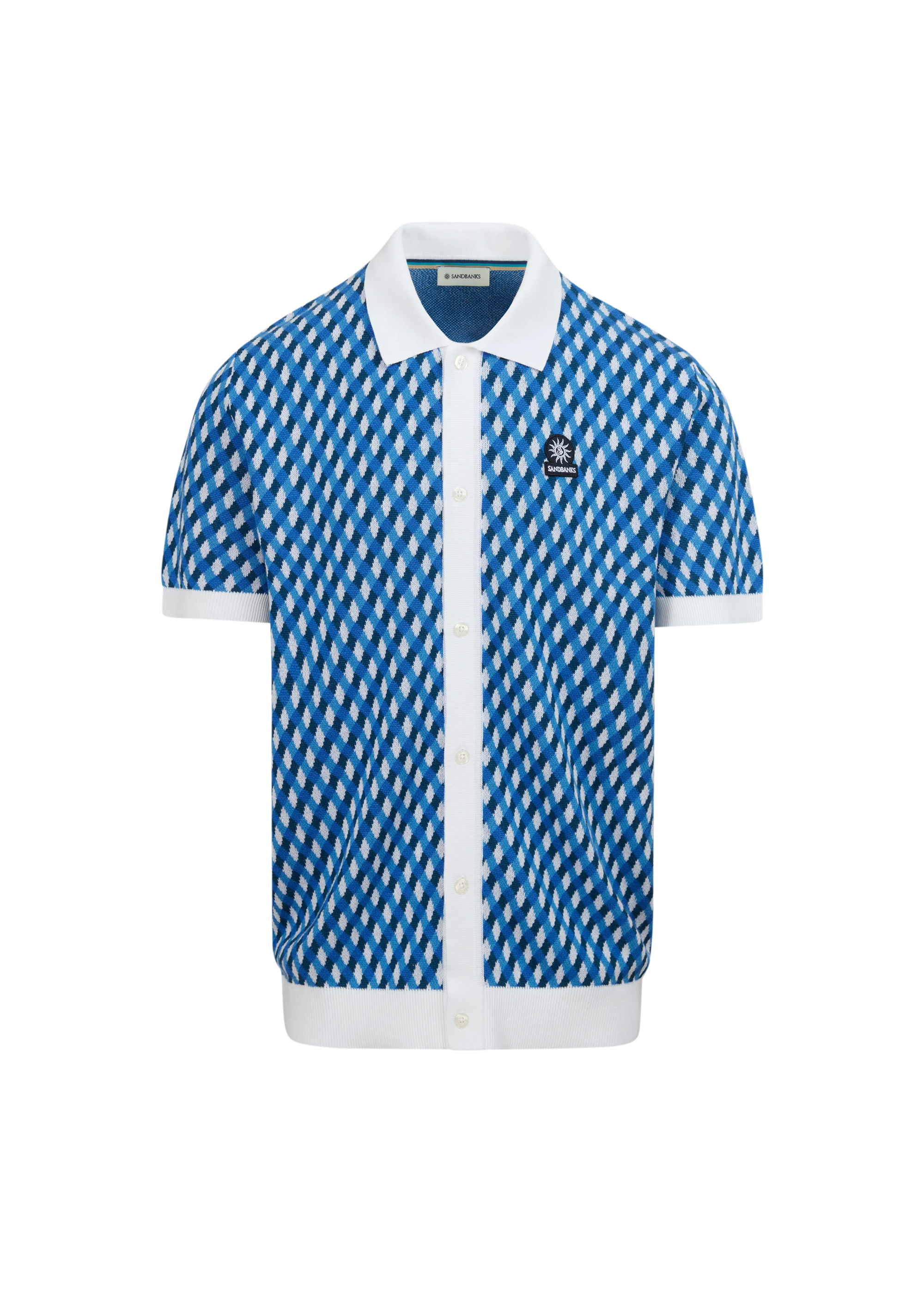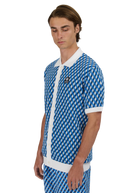Sandbanks men's fine gauge geometric knitted full button polo shirt in blue with contrast ribbed collar, placket, cuffs and hem in white. This knitted shirt features a geometric knitted pattern made from 100% organic cotton and features a full button placket and Sandbanks embroidered badge.