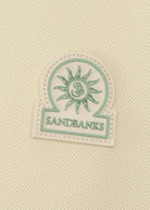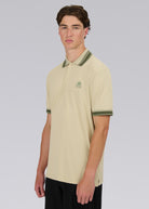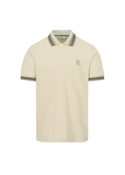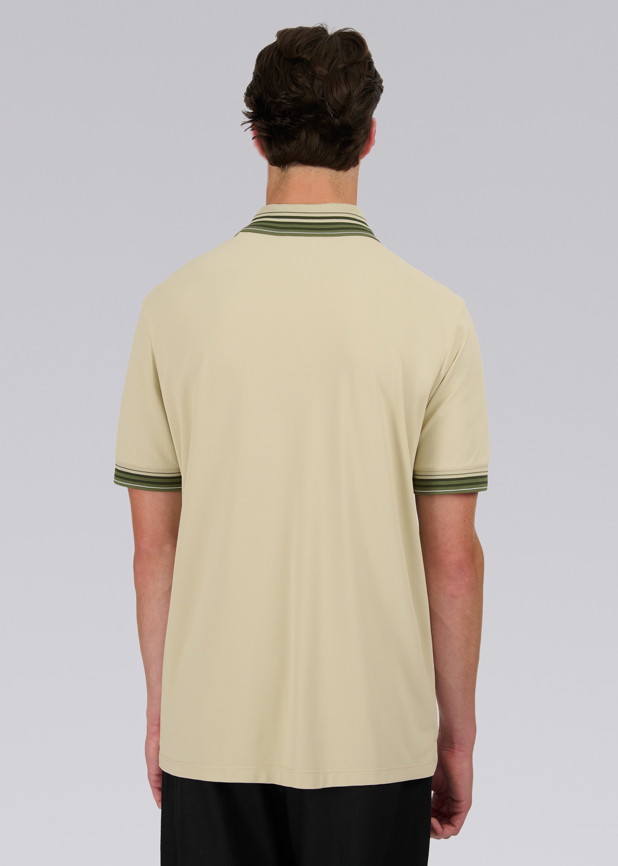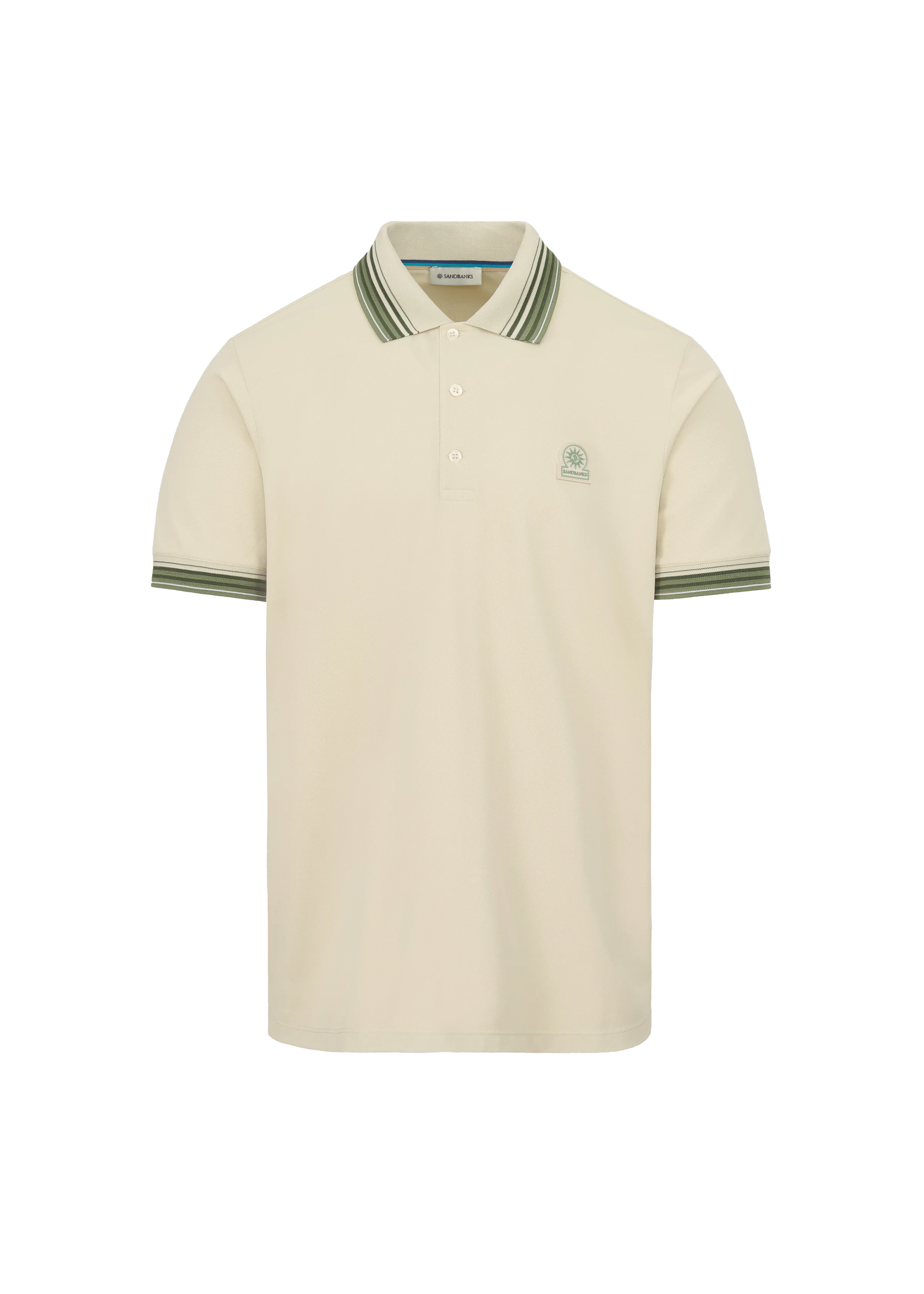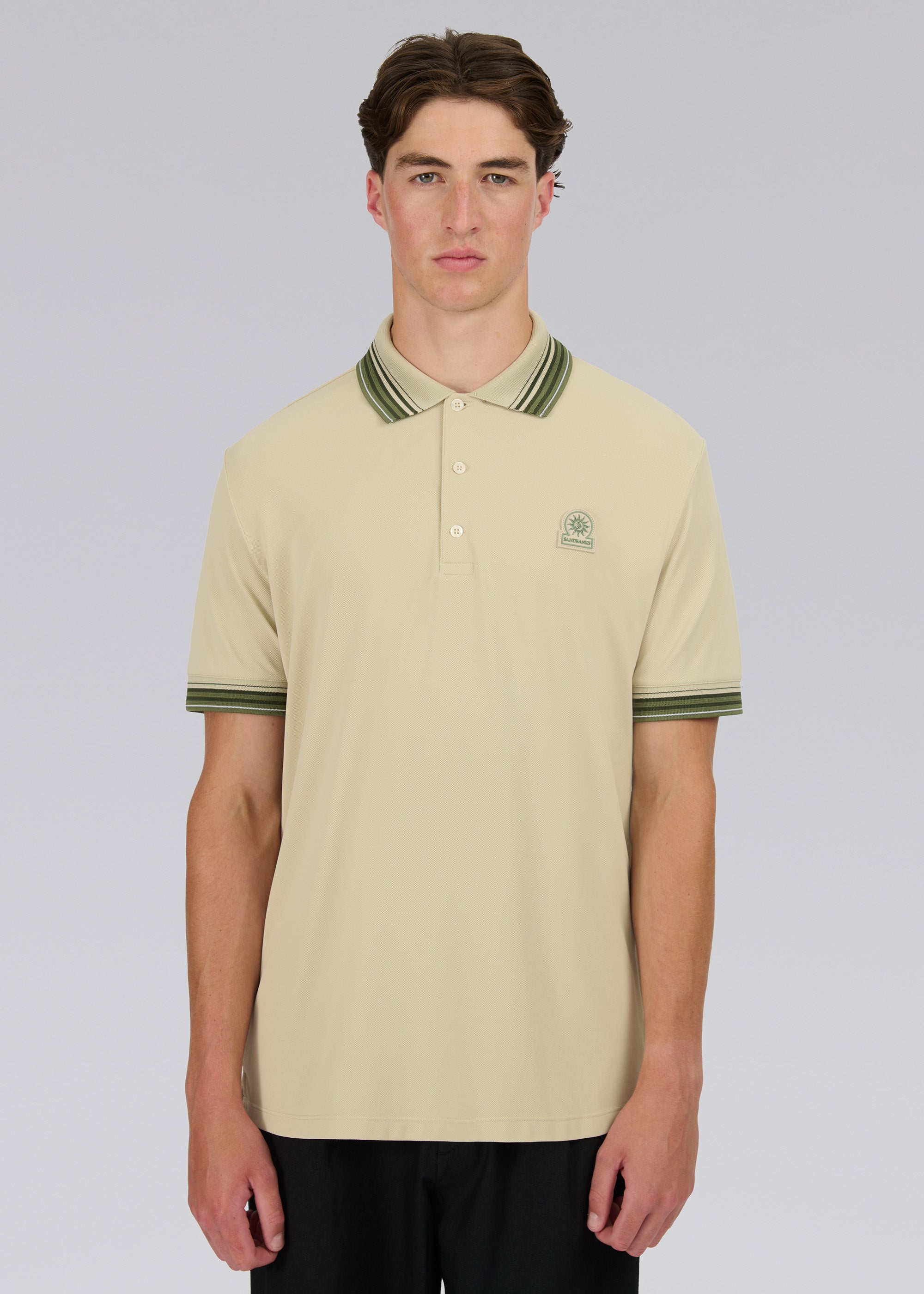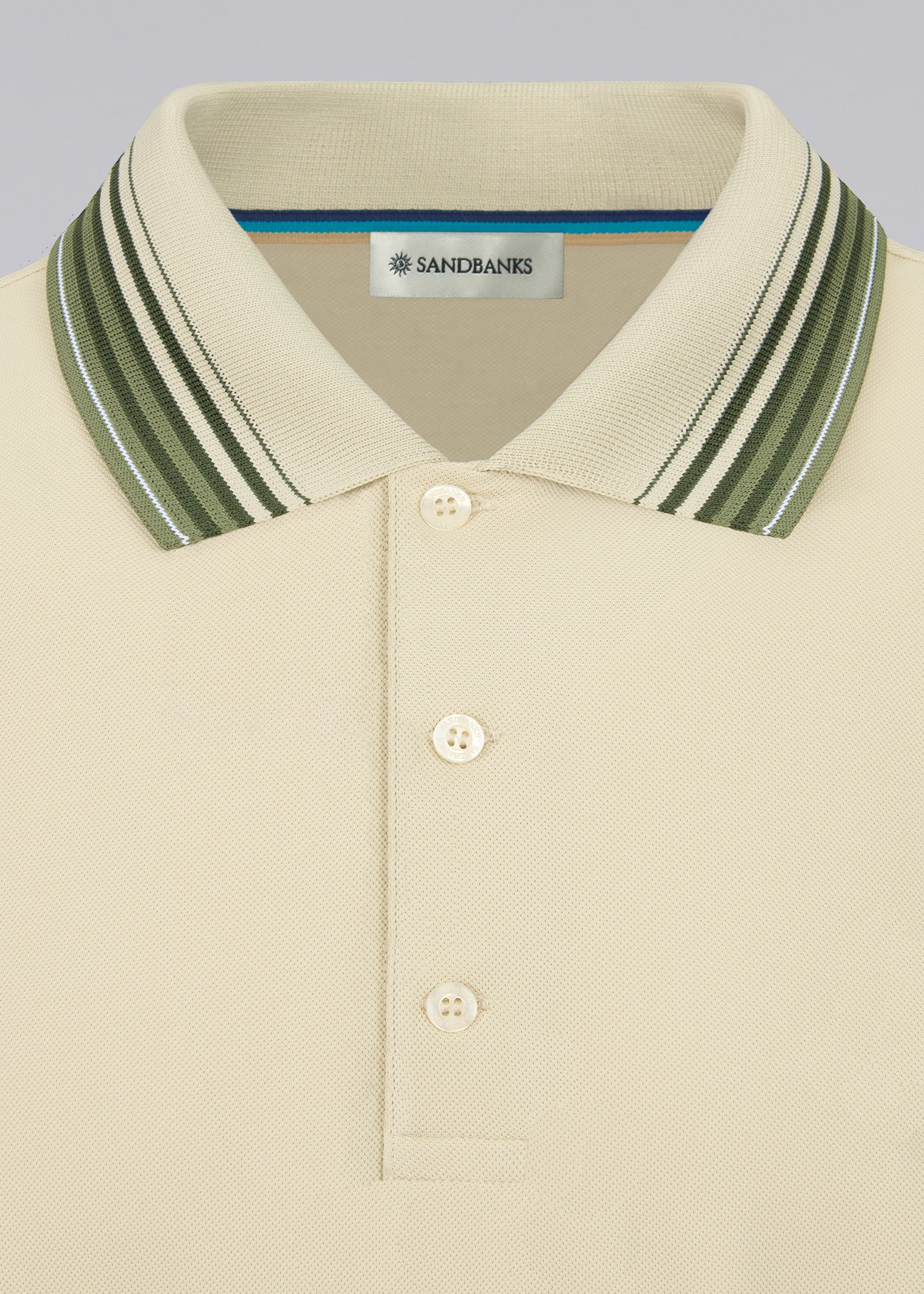 The Sandbanks Gradient Rib Polo Shirt in Stone is crafted from a polyamide micro pique material, providing a sporty texture. It boasts a 3-button placket and is adorned with a rubber badge in matching stone and sage tones.
