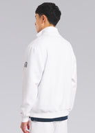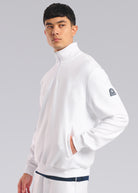 Sandbanks badge logo interlock quarter zip sweatshirt in white. This classic fitting garment is made from an interlock fabric for a superior smooth finish, featuring tonal neck zip, engraved sandbanks puller, and white rubber badge with contrast navy branding.
