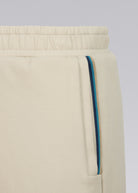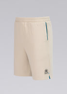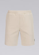 Sandbanks men's badge logo interlock shorts in stone. This classic fitting garment is made from an interlock fabric for a superior smooth finish, featuring navy rubber badge with contrast white branding, and engraved gunmetal cord ends.