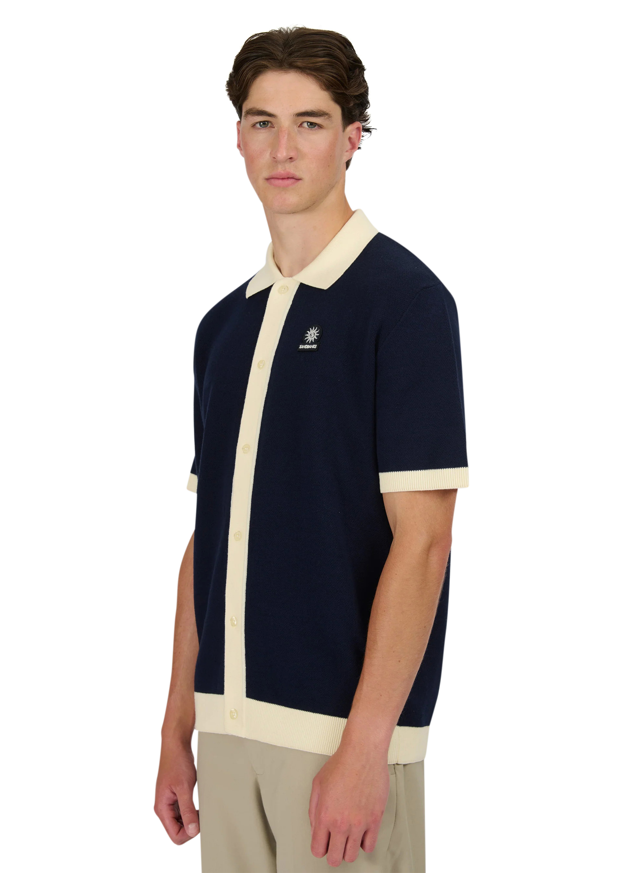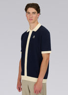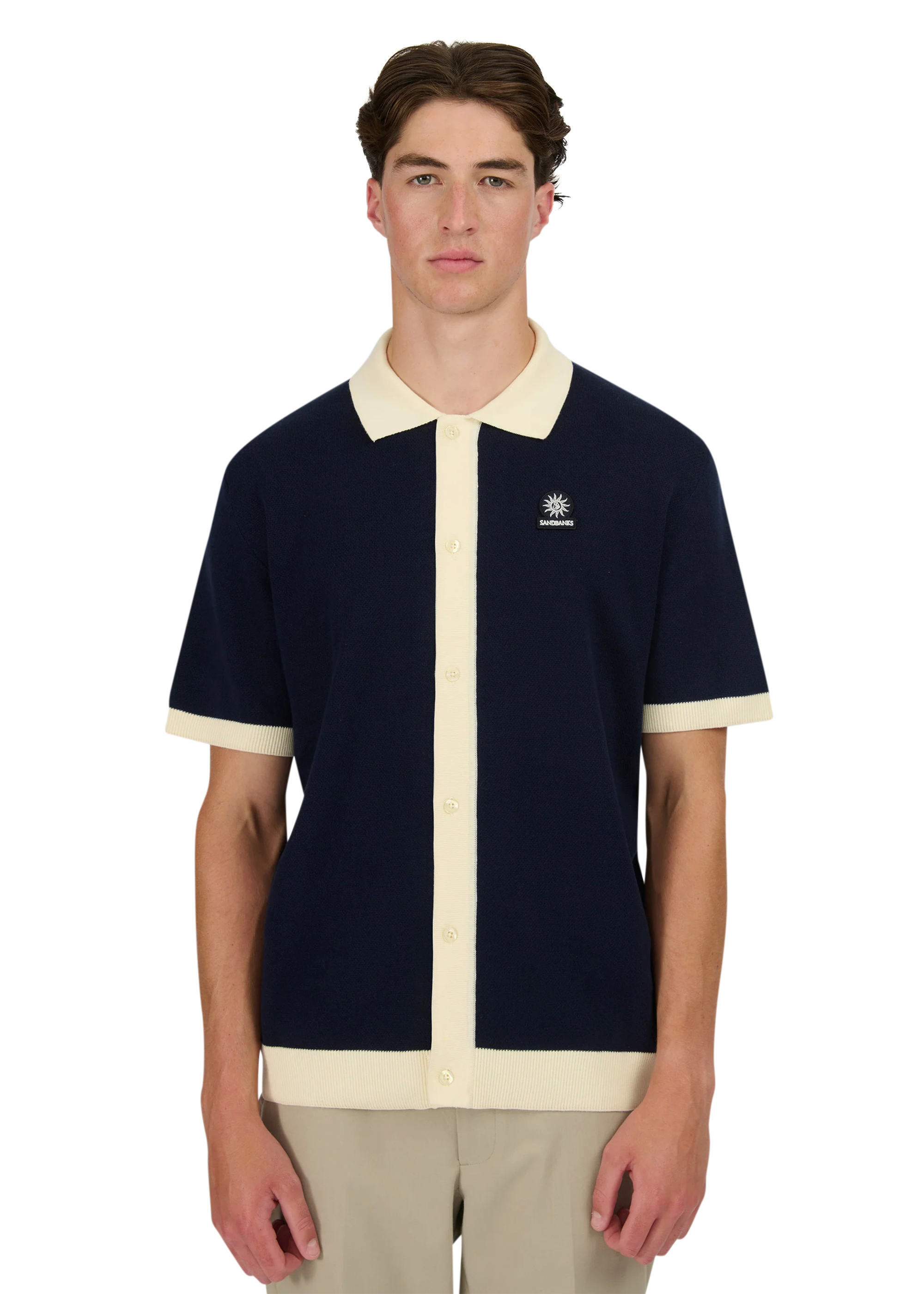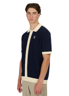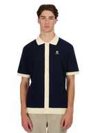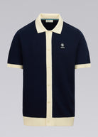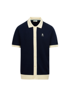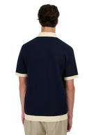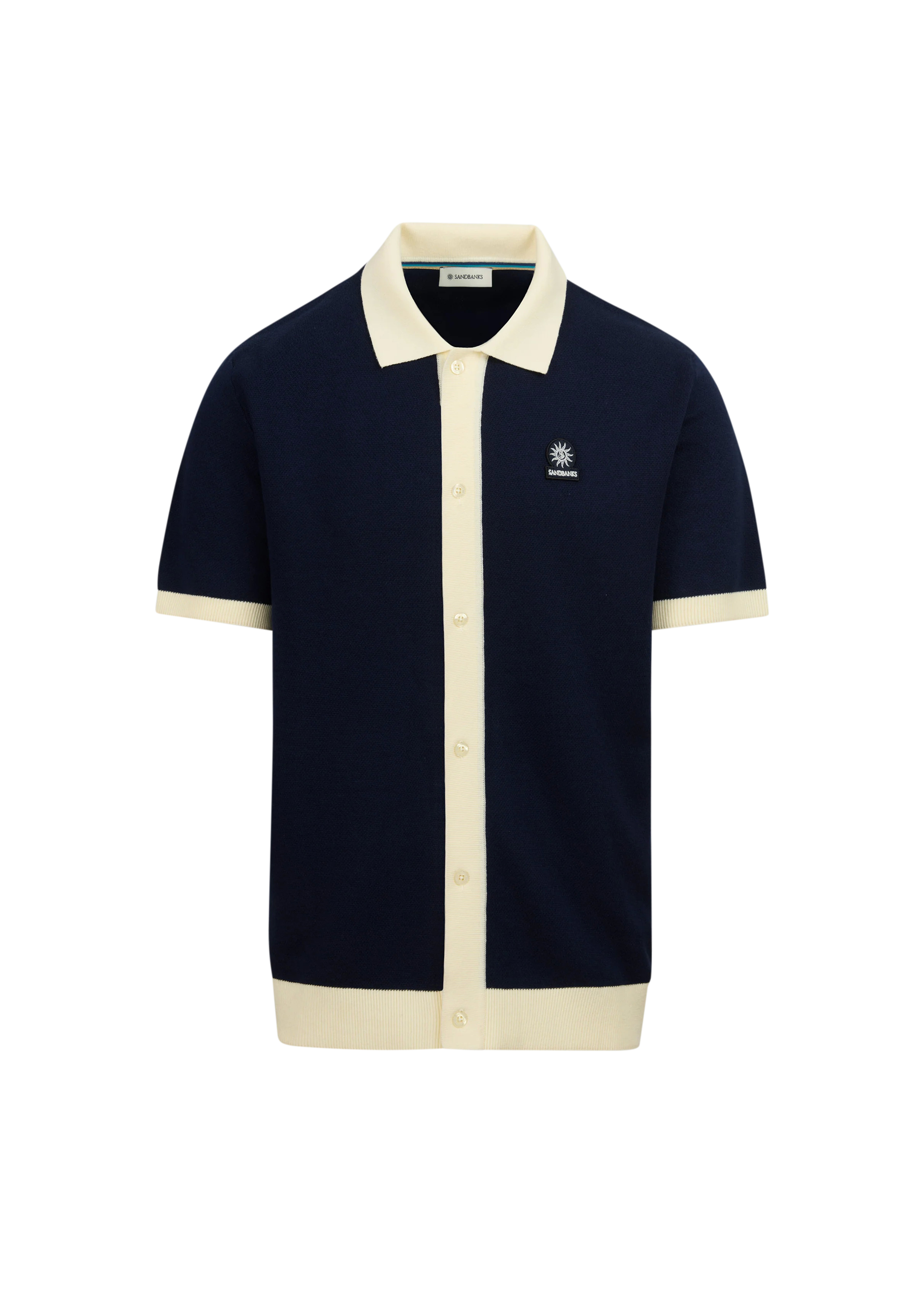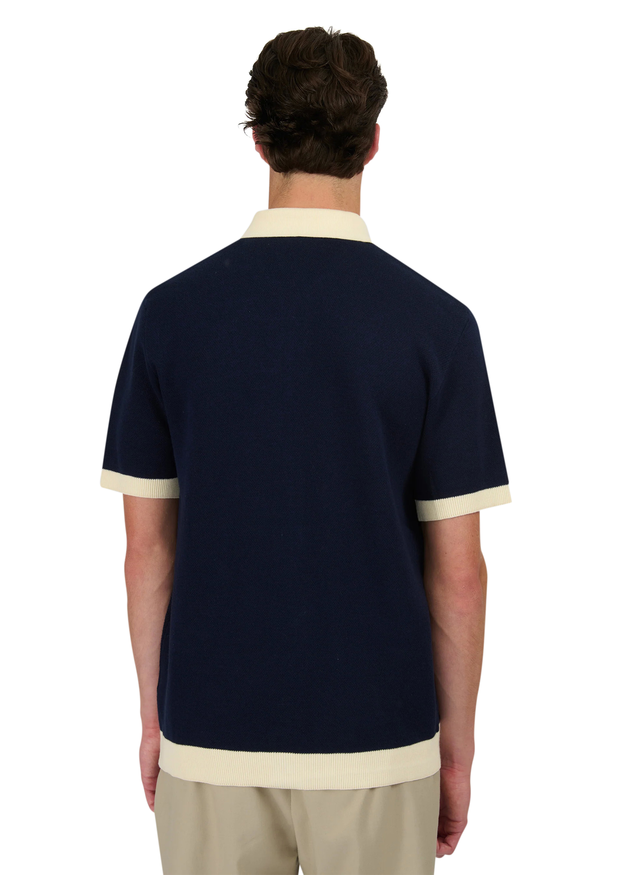 Sandbanks men's fine gauge knitted full button polo shirt in navy with contrast ribbed collar, placket, cuffs and hem in off white. This knitted shirt is made from 100% organic cotton and features a full button placket and Sandbanks embroidered badge.