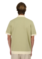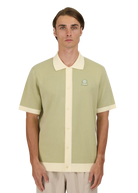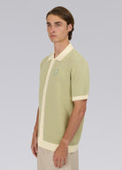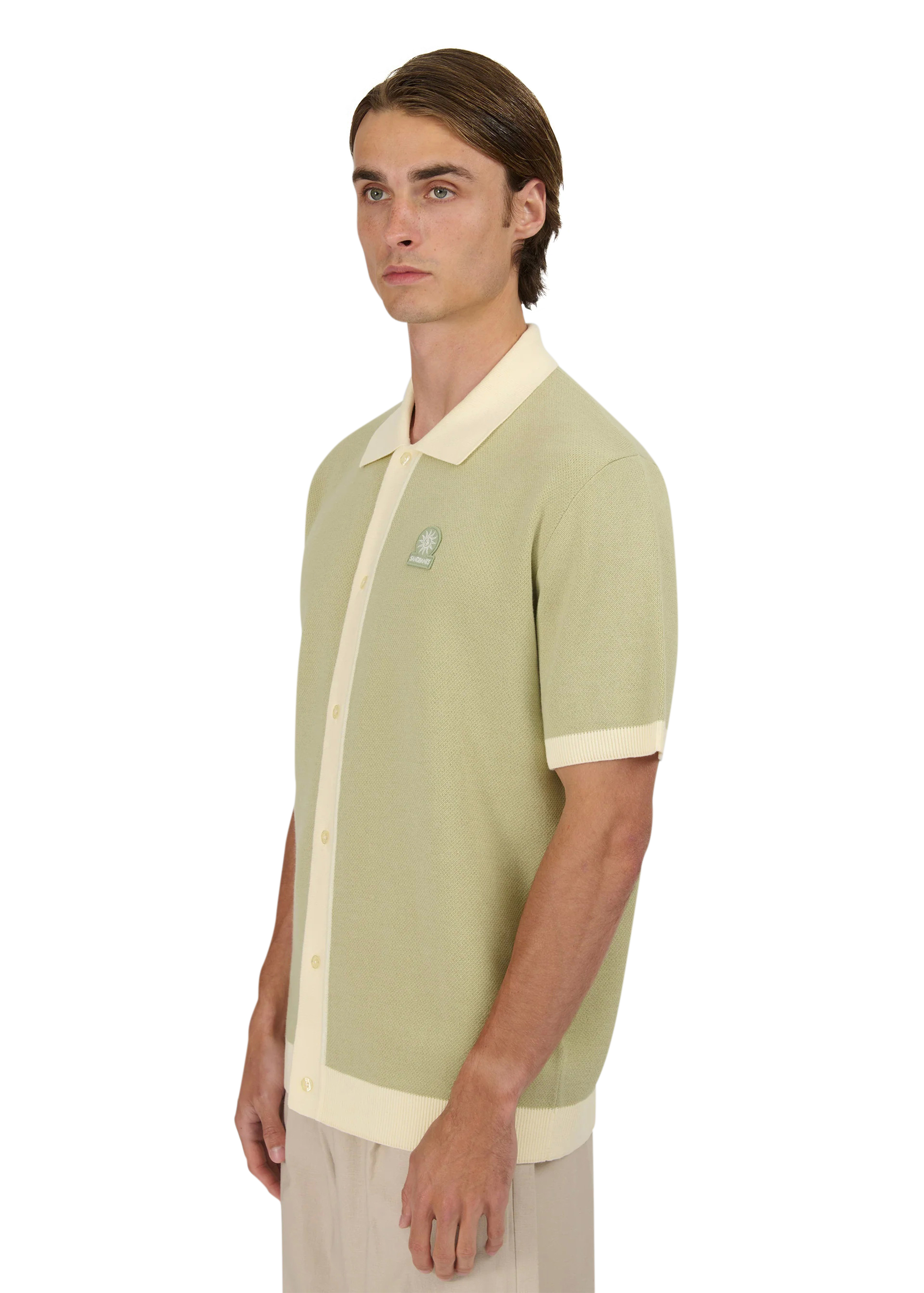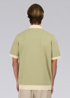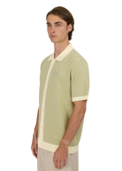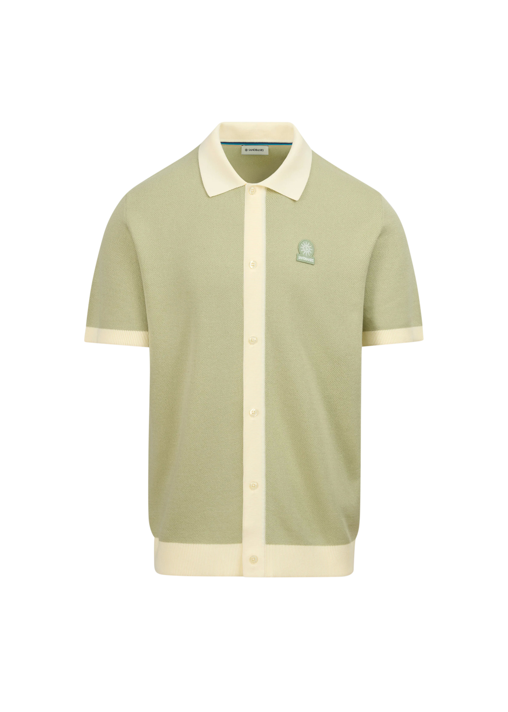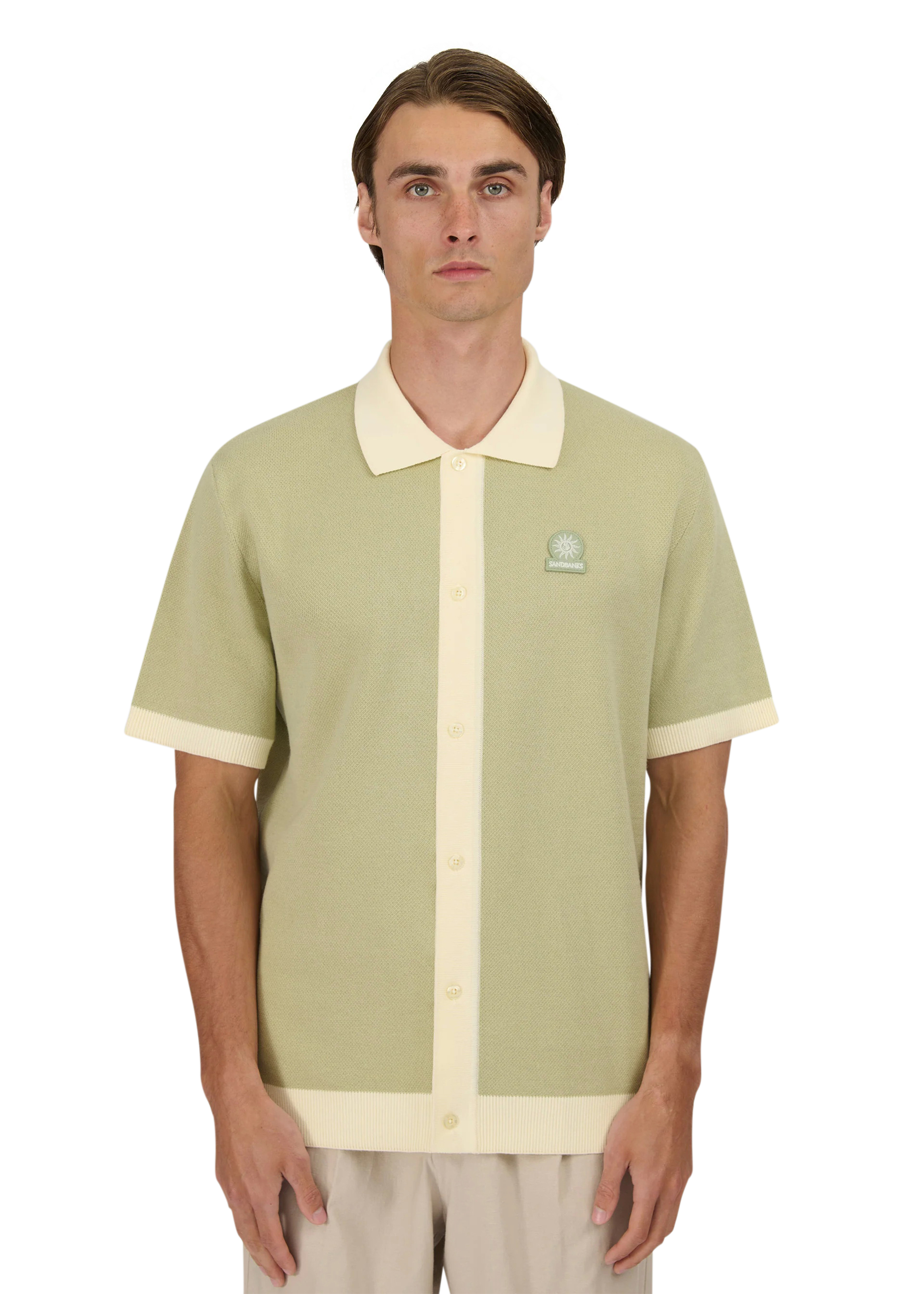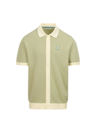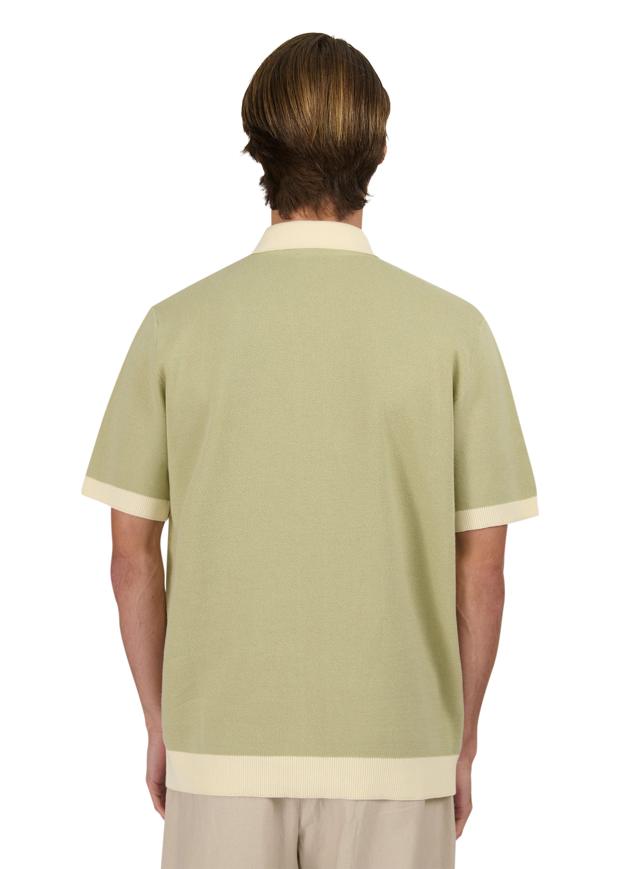 Sandbanks men's fine gauge knitted full button polo shirt in sage with contrast ribbed collar, placket, cuffs and hem in off white. This knitted shirt is made from 100% organic cotton and features a full button placket and Sandbanks embroidered badge.