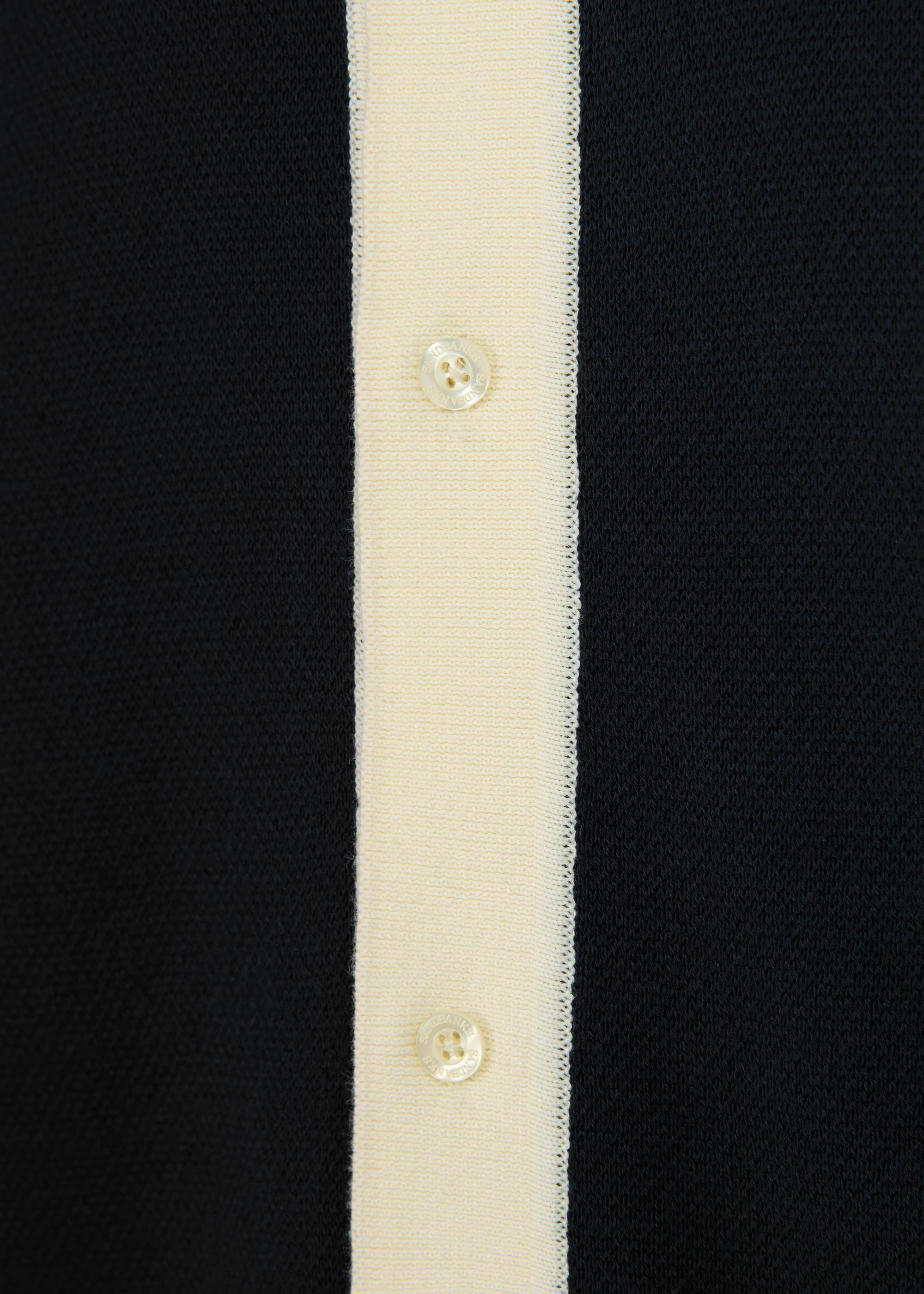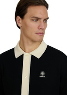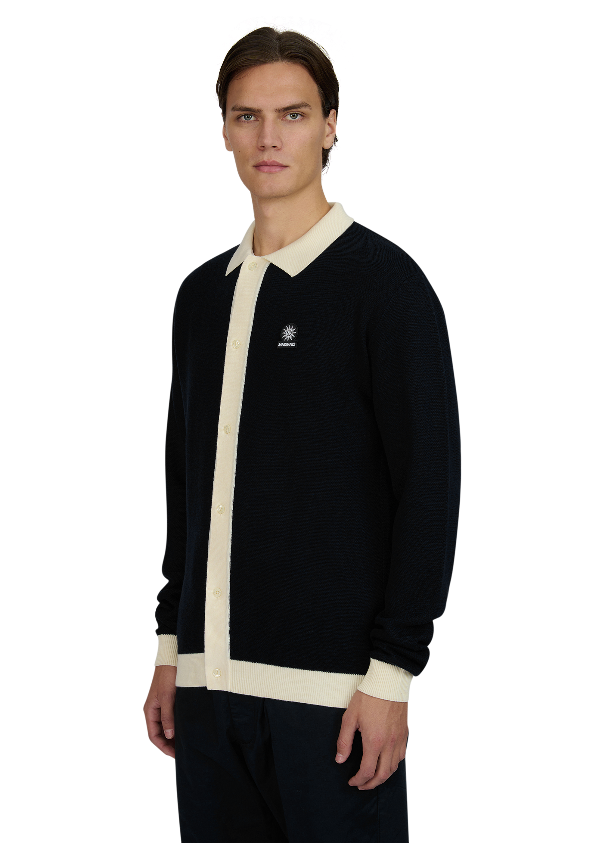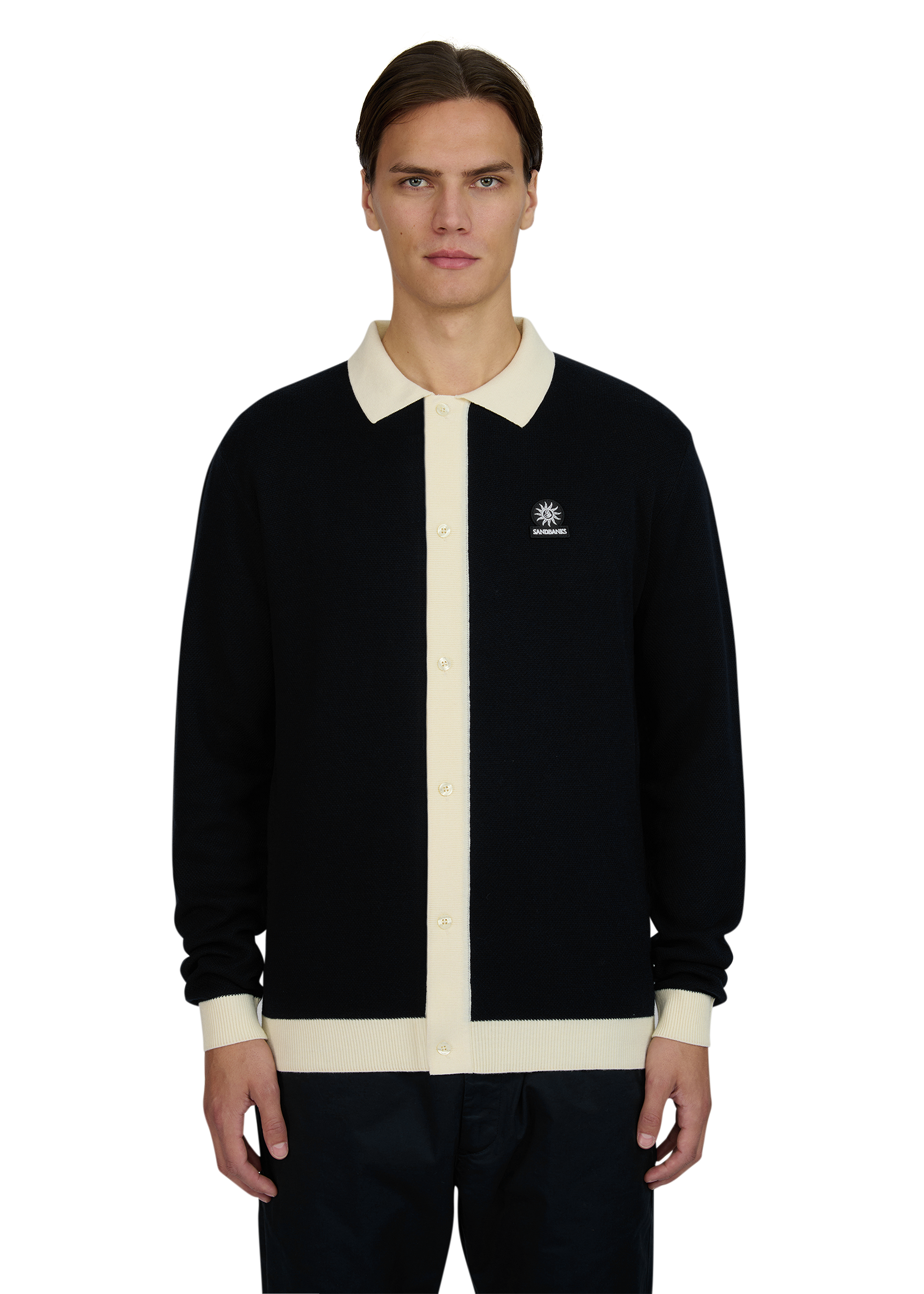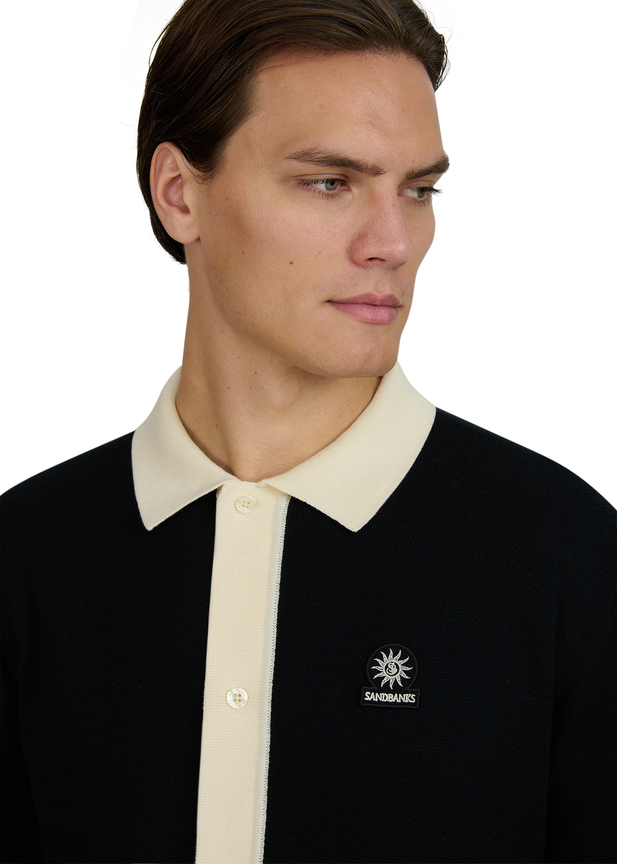 Sandbanks men’s fine gauge knitted long sleeve full button polo shirt in black, featuring a contrast ribbed collar, placket, cuffs, and hem. Crafted from 100% organic cotton, this lightweight knit offers a smooth, structured feel and a contemporary everyday look. Completed with a full button fastening and the signature Sandbanks embroidered chest badge.