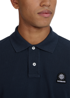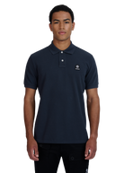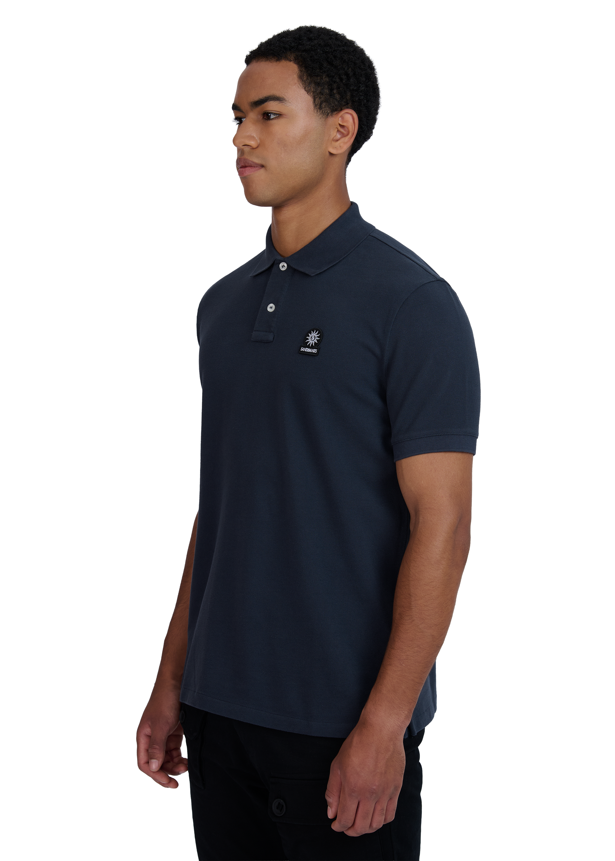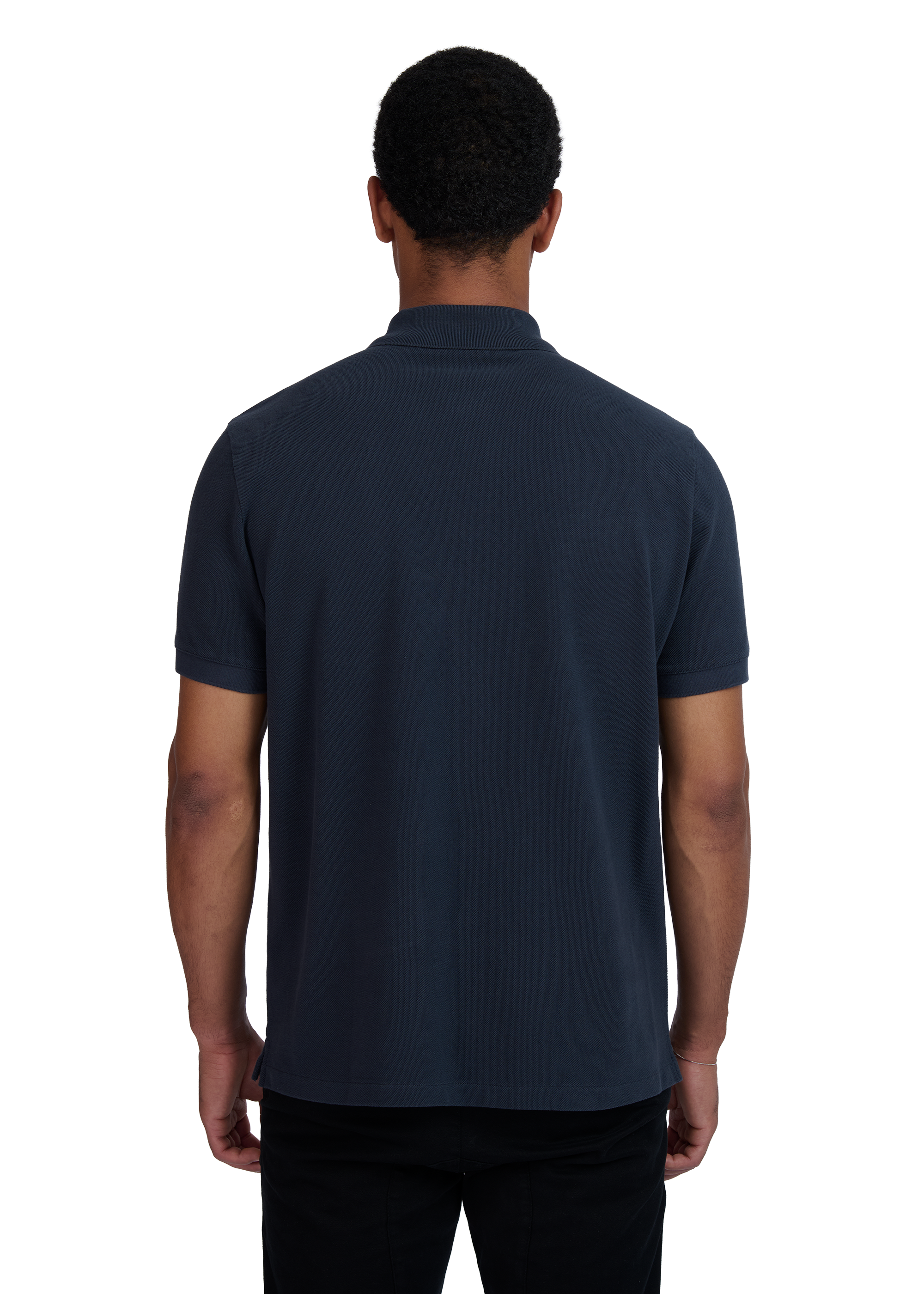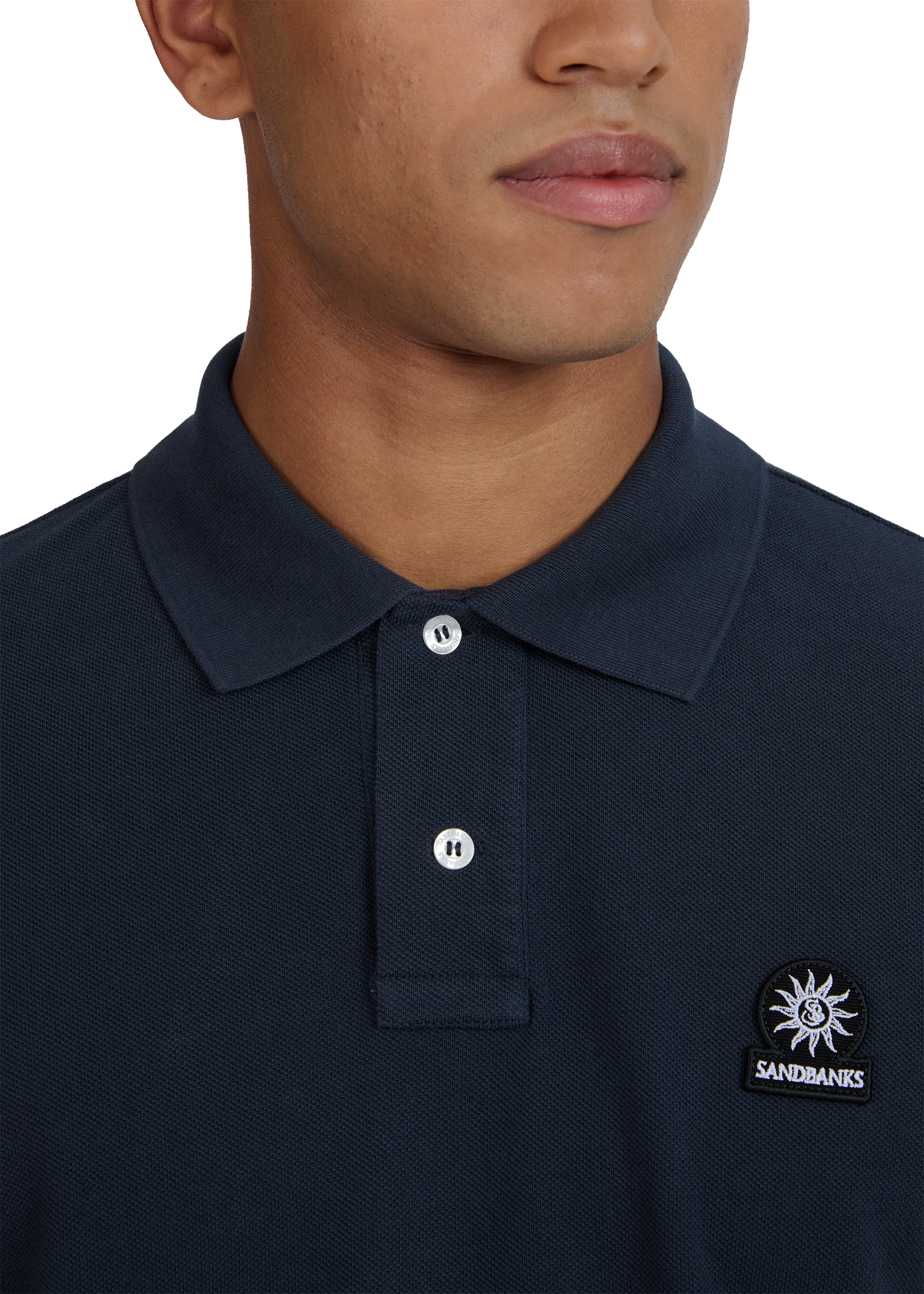 Sandbanks men's badge logo polo shirt in anthracite, made from 100% mercerised organic cotton. This classic fitting 2 button polo shirt features an embroidered badge logo on the chest, ribbed collar and cuff, and tri-colour back neck binding.