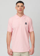 Sandbanks men's badge logo polo shirt in crystal rose, made from 100% mercerised organic cotton. This classic fitting 2 button polo shirt features an embroidered badge logo on the chest, ribbed collar and cuff, and tri-colour back neck binding.