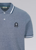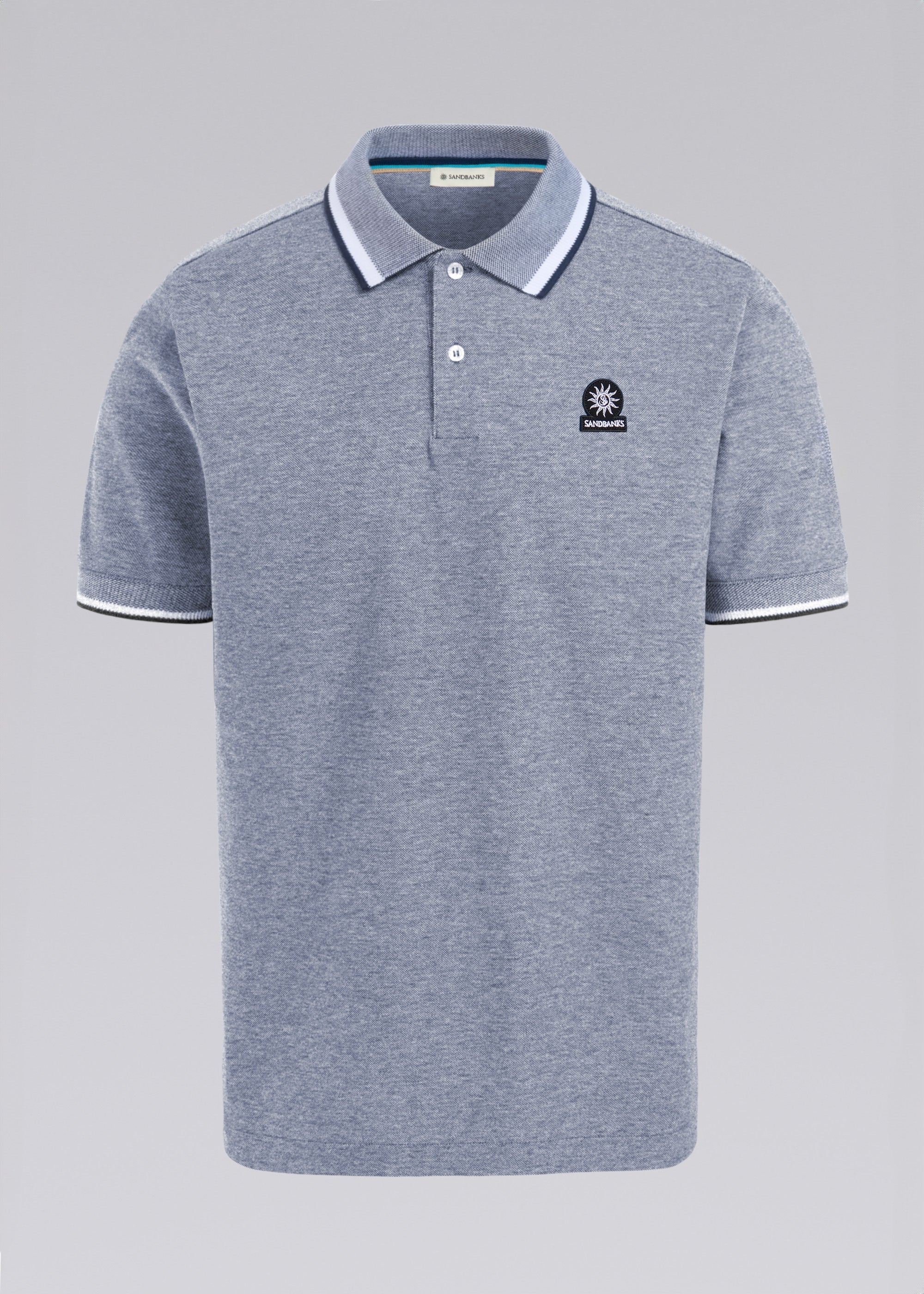 Sandbanks men's oxford stripe polo shirt in navy, made from sustainably sourced 100% BCI Cotton. This classic fitting polo shirt features statement contrast stripe collar, Sandbanks embroidered chest badge, and 2 button placket.