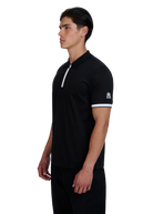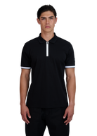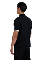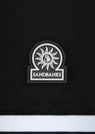 Sandbanks men's silicone zip polo shirt in black, made from 100% mercerised interlock cotton. This classic fitting polo shirt features central Lampo silicone zip in white with print, sandbanks rubber badge on arm, white tipped knitted cuff and tri-colour back neck binding.