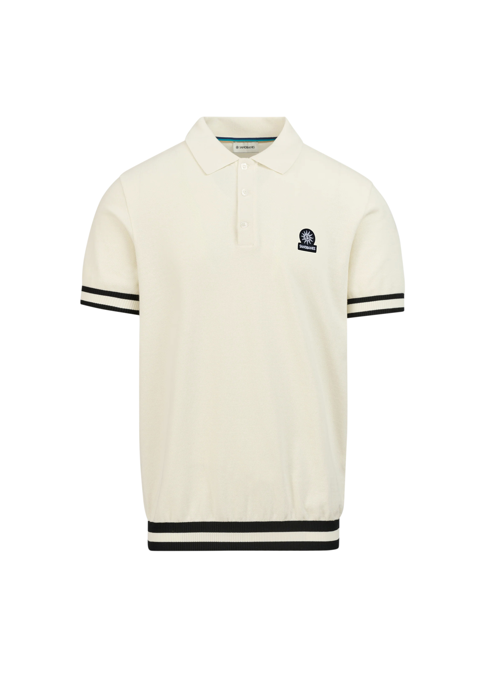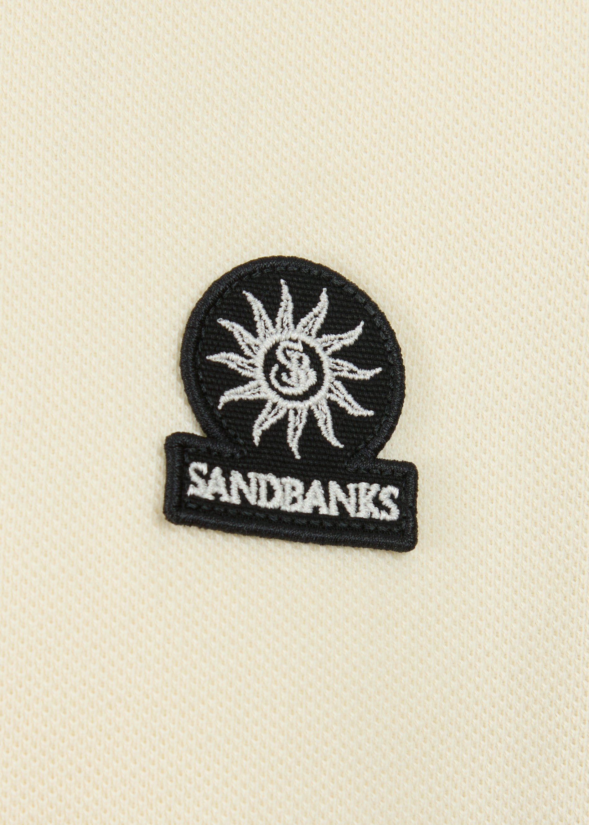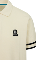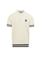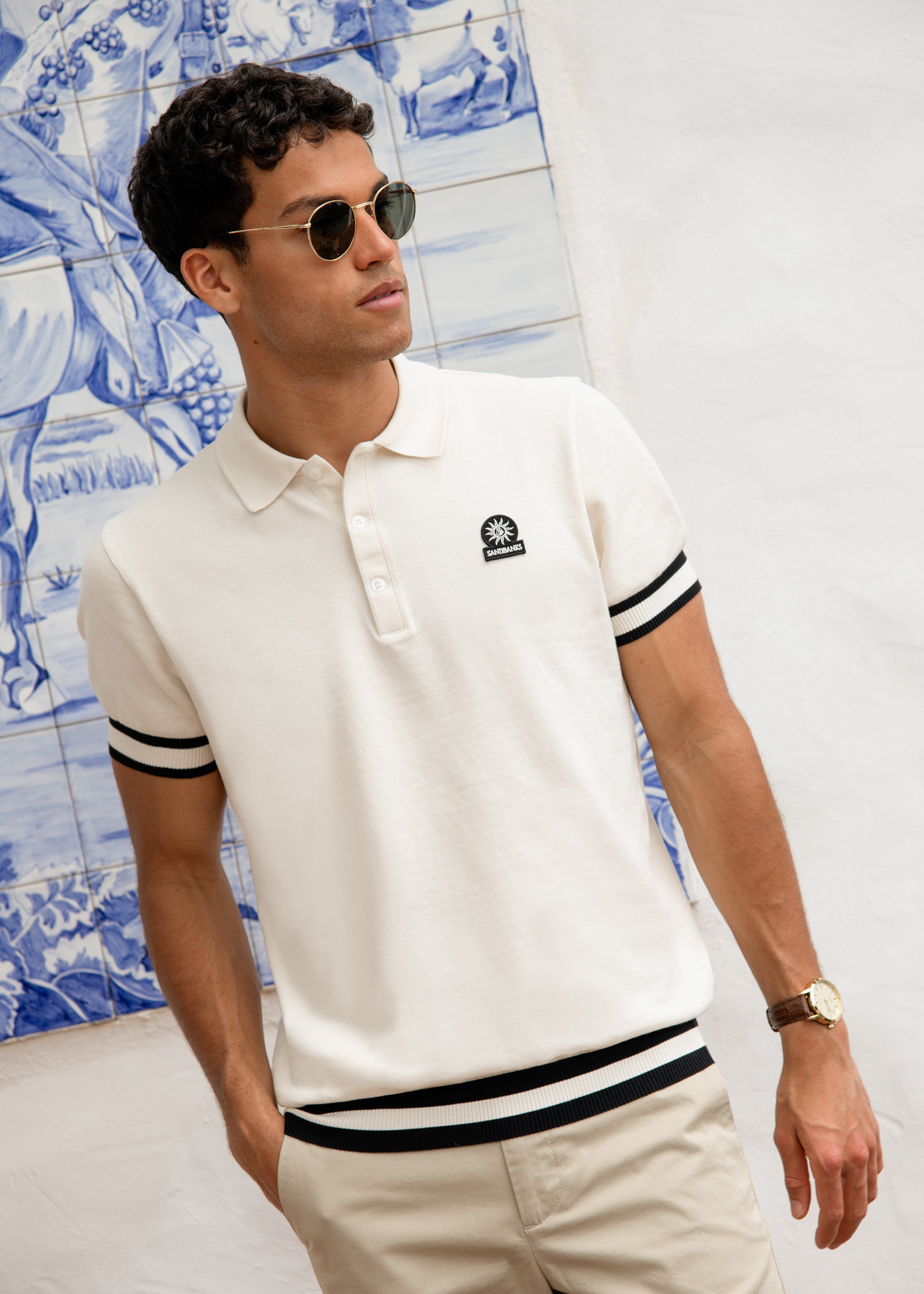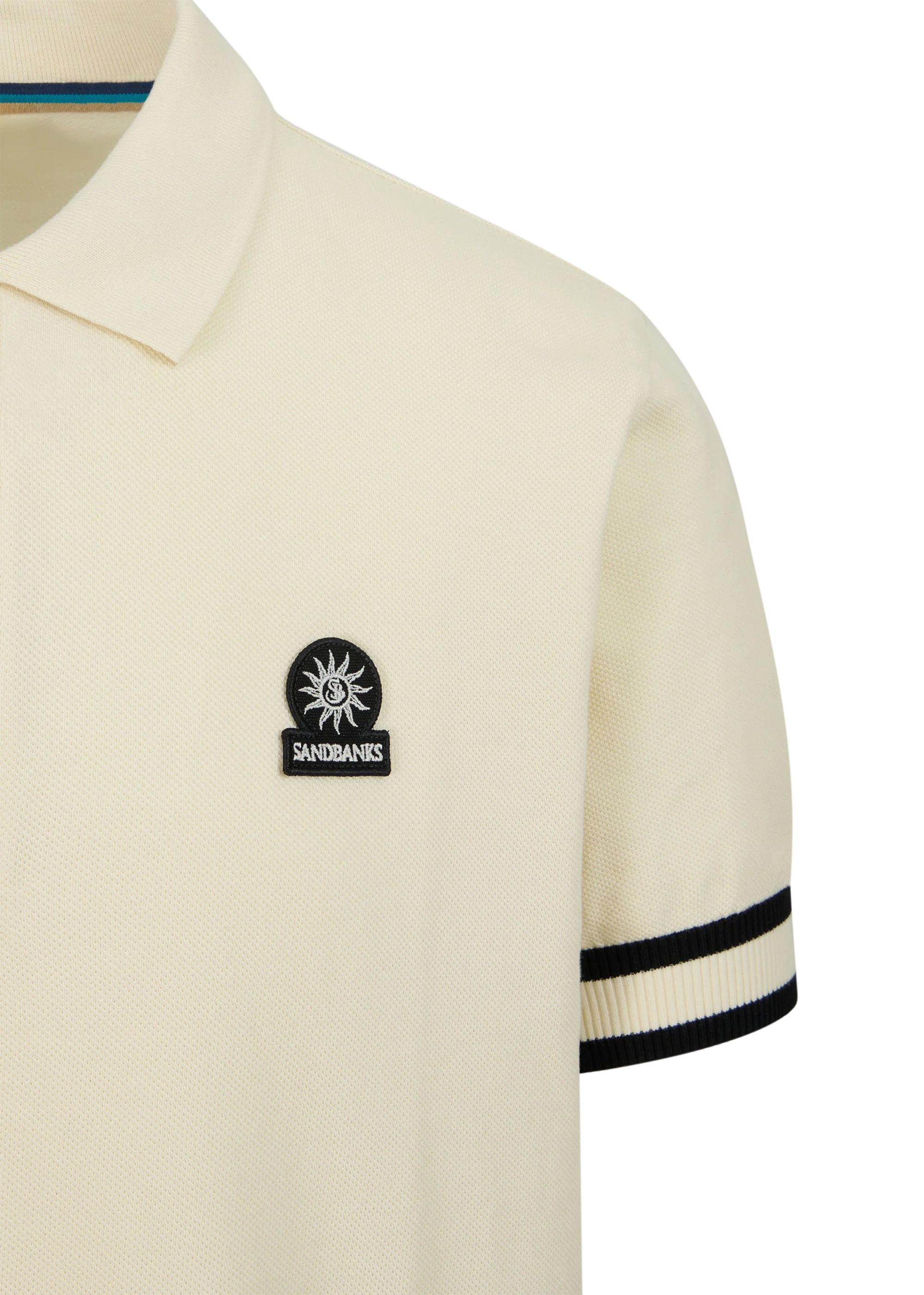 This ecru Sandbanks Stripe Hem Pique Polo Shirt is a sophisticated choice, featuring a embroidered badge logo on the chest, a bold contrasting stripe rib on the cuff and waist band and statement 3 button placket with engraved pearlescent buttons.