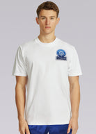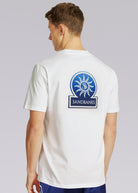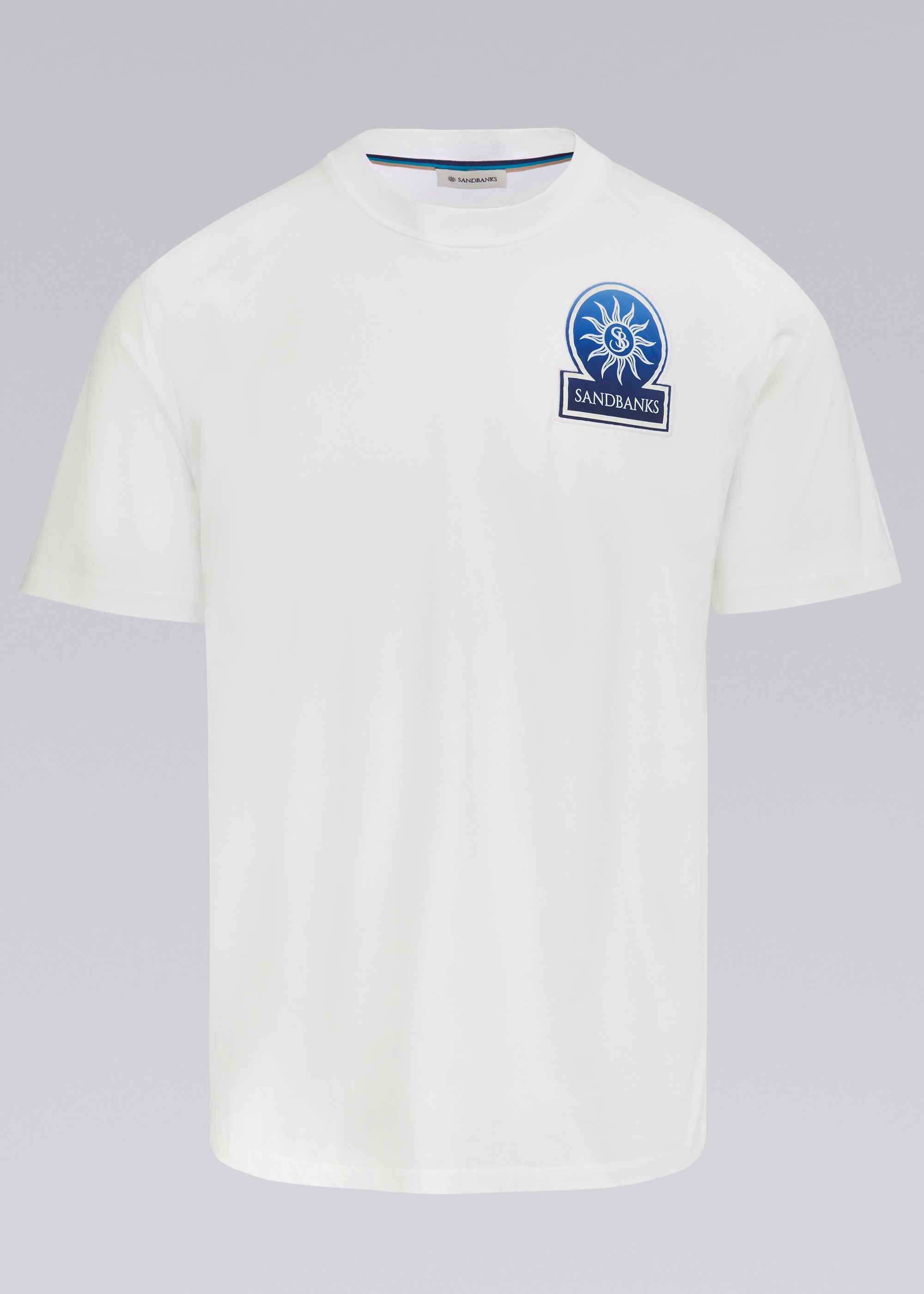 Sandbanks gradient appliqué t-shirt in white, featuring statement Sandbanks navy gradient logo chest and back print, and tri-colour back neck binding.
