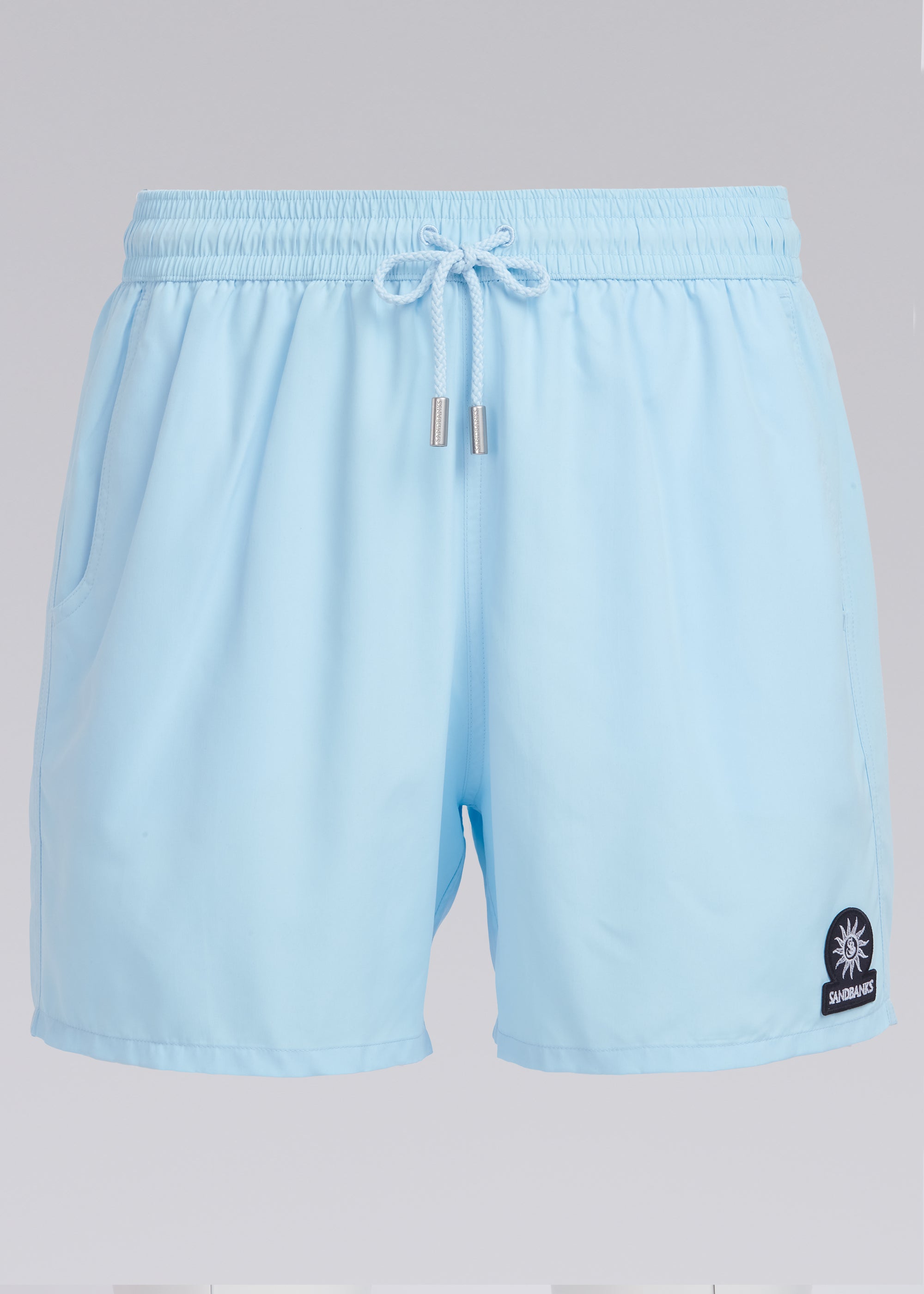 The Sandbanks badge logo swim shorts in crystal blue, made from a luxurious emerised fabric using 100% recycled polyester yarns and features an embroidered badge logo, elasticated waistband with drawstring cords, brushed gun metal cord ends with laser engraved Sandbanks logo, side pockets and rear zip pocket with laser engraved SB zip puller.