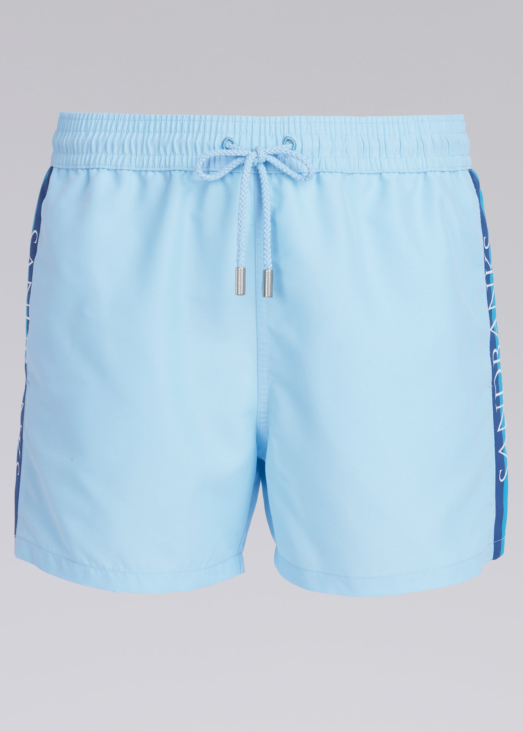 The Sandbanks retro swim shorts in crystal blue, made from a luxurious emerised fabric using 100% recycled polyester yarns and features a tri-colour ribbon side seam details with Sandbanks print, elasticated waistband with drawstring cords, brushed gun metal cord ends with laser engraved Sandbanks logo, side pockets and rear zip pocket with laser engraved SB zip puller.