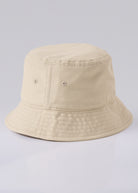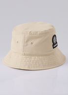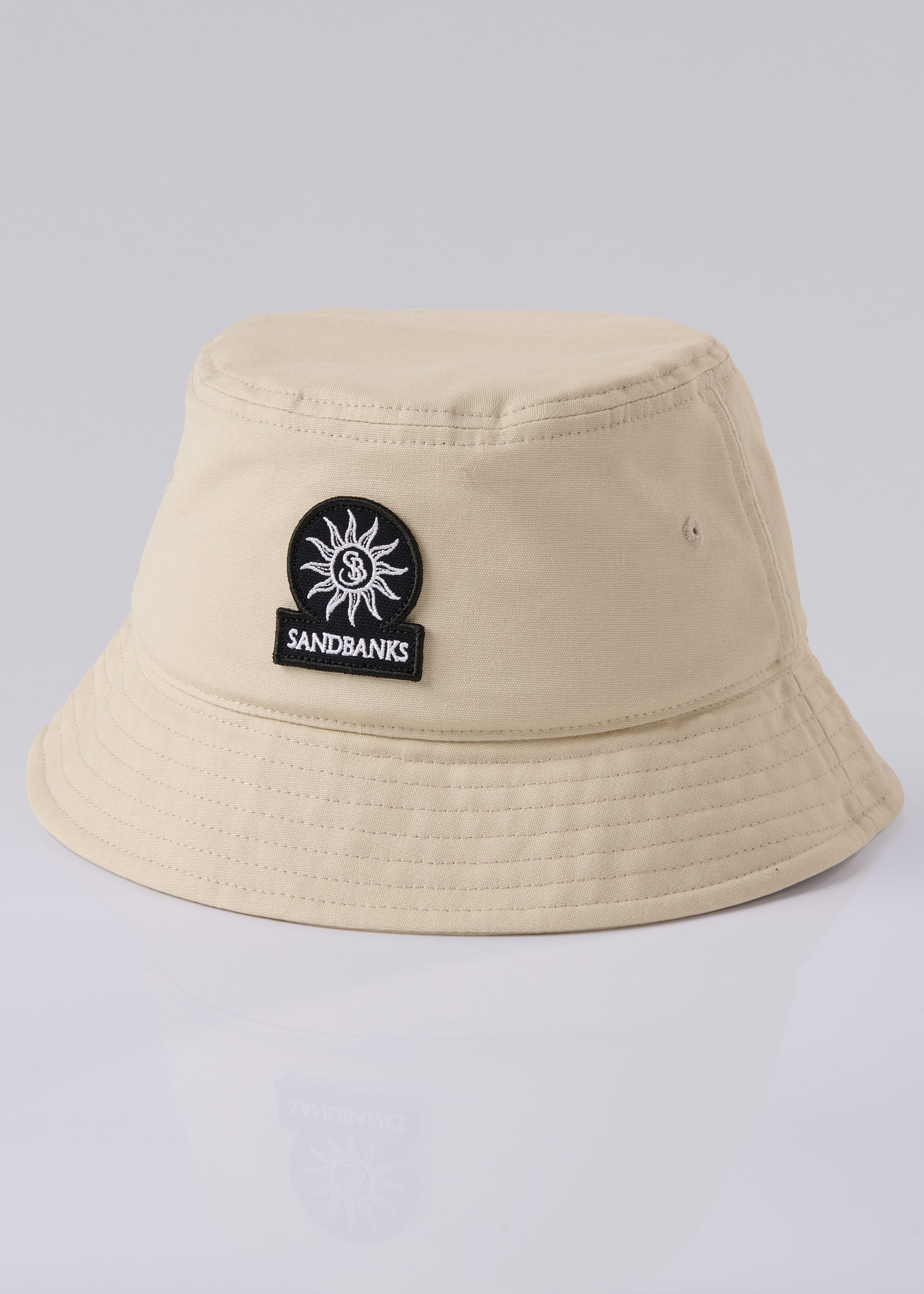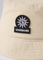 Sandbanks badge logo bucket hat in stone made from 100% organic cotton, featuring black badge logo with white embroidery, internal Sandbanks binding and embroidered eyelets.