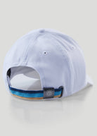 Sandbanks Badge Logo strap-back cap in white made from 100% recycled polyester and features white badge with navy embroidery, knitted tri-colour rear strap and laser engraved SB logo fastener in gun metal.