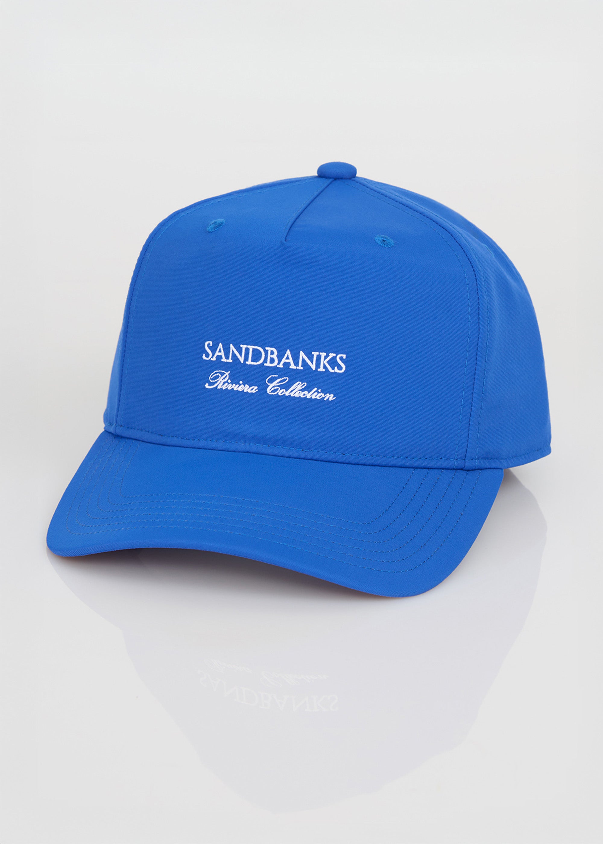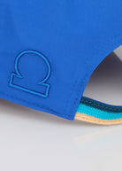The Sandbanks Riviera Collection cap in cobalt blue is crafted from recycled nylon and displays a finely embroidered Sandbanks Riviera Collection logo on the front and signature logo outline on the side. It offers a contemporary trucker-style fit, complete with a tri-colour strap at the back and a laser-engraved SB gunmetal fastener for precise adjustment.