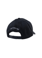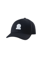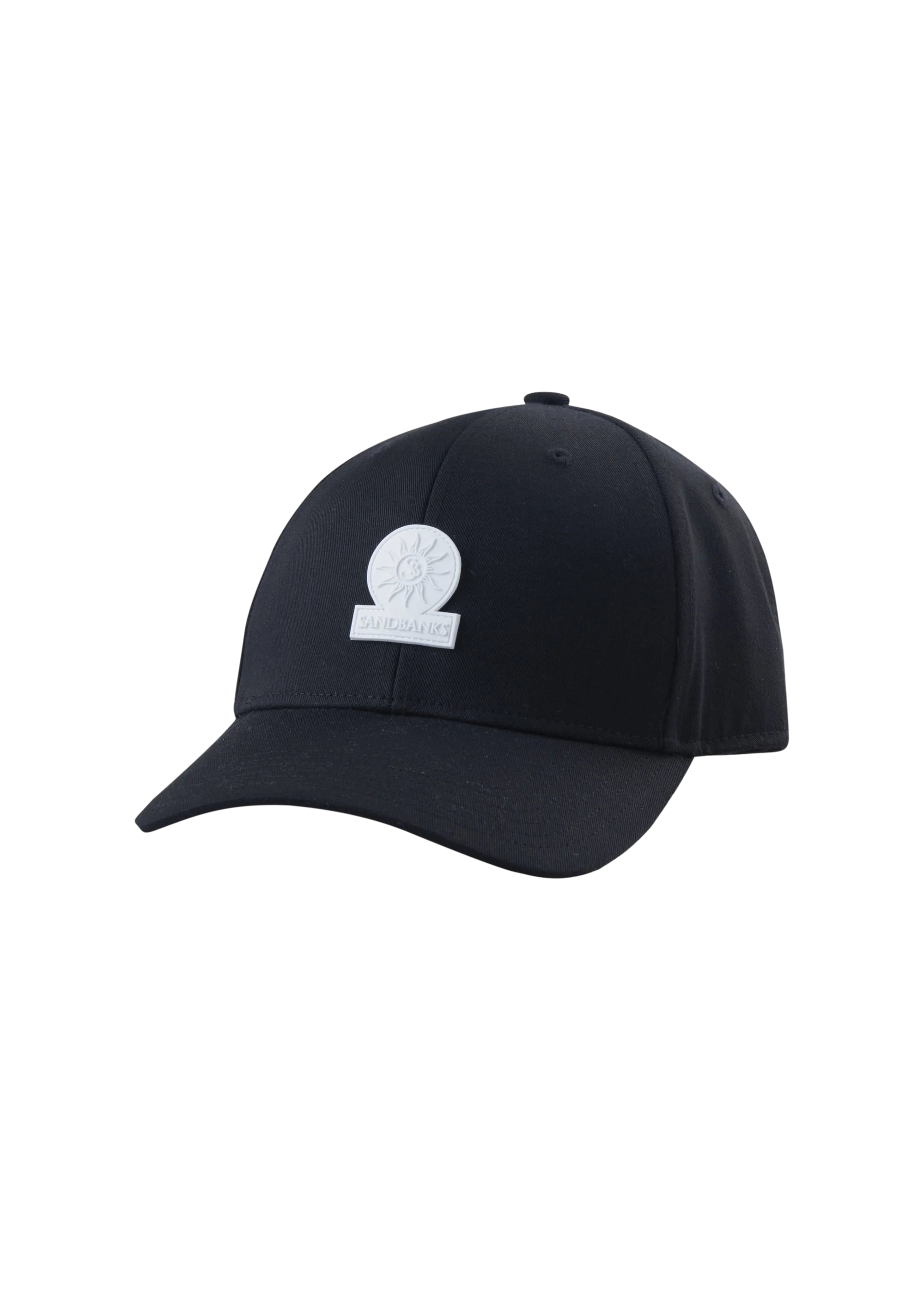 Sandbanks Badge Logo snap-back cap in black with white rubber badge logo made 100% recycled polyester, featuring sandbanks embroidery in white on the back.