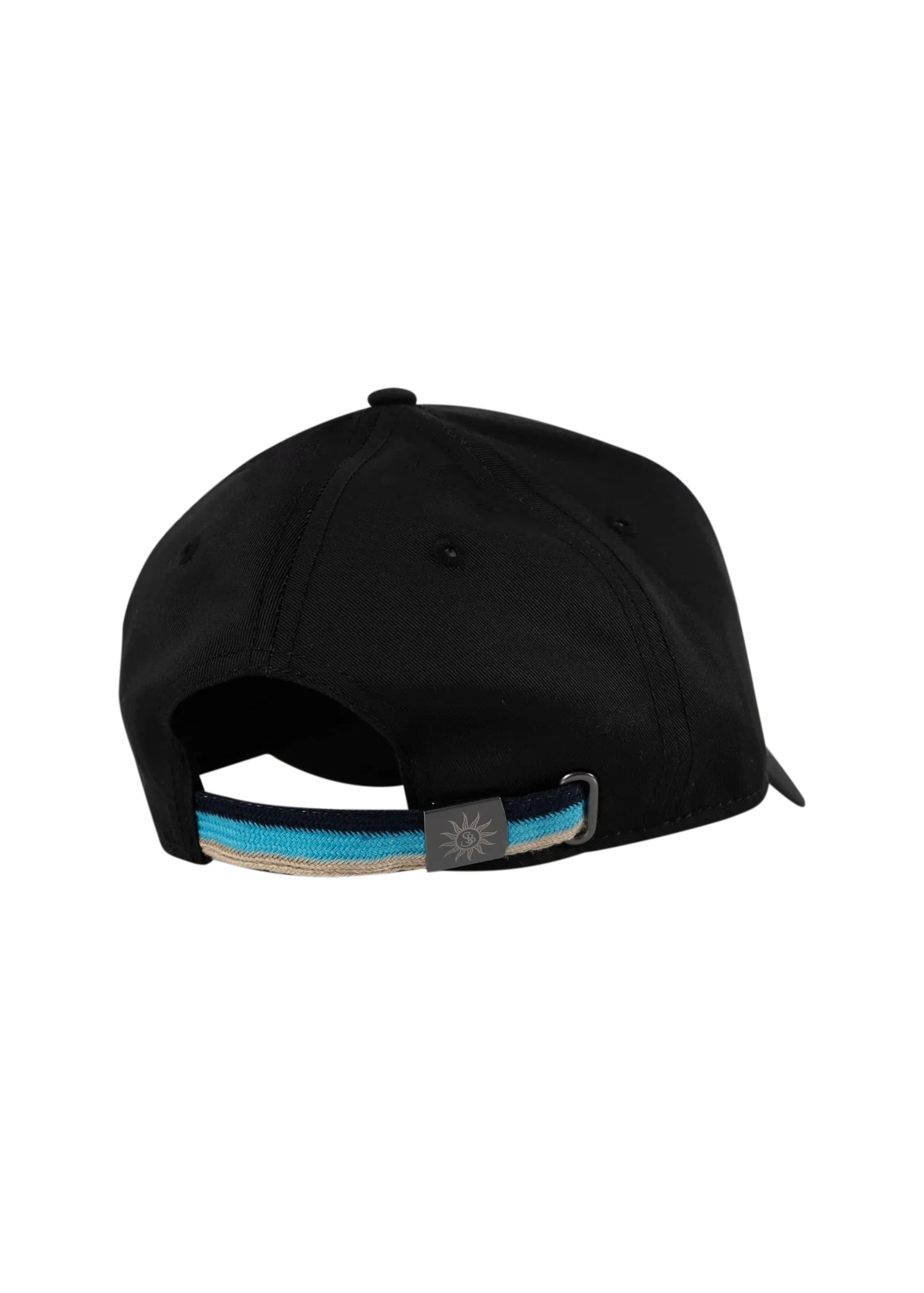Sandbanks Badge Logo strap-back cap in black with black badge and black embroidered logo made entirely from recycled polyester (plastic bottles) and features, knitted tri-colour rear strap and laser engraved SB logo fastener in gun metal.