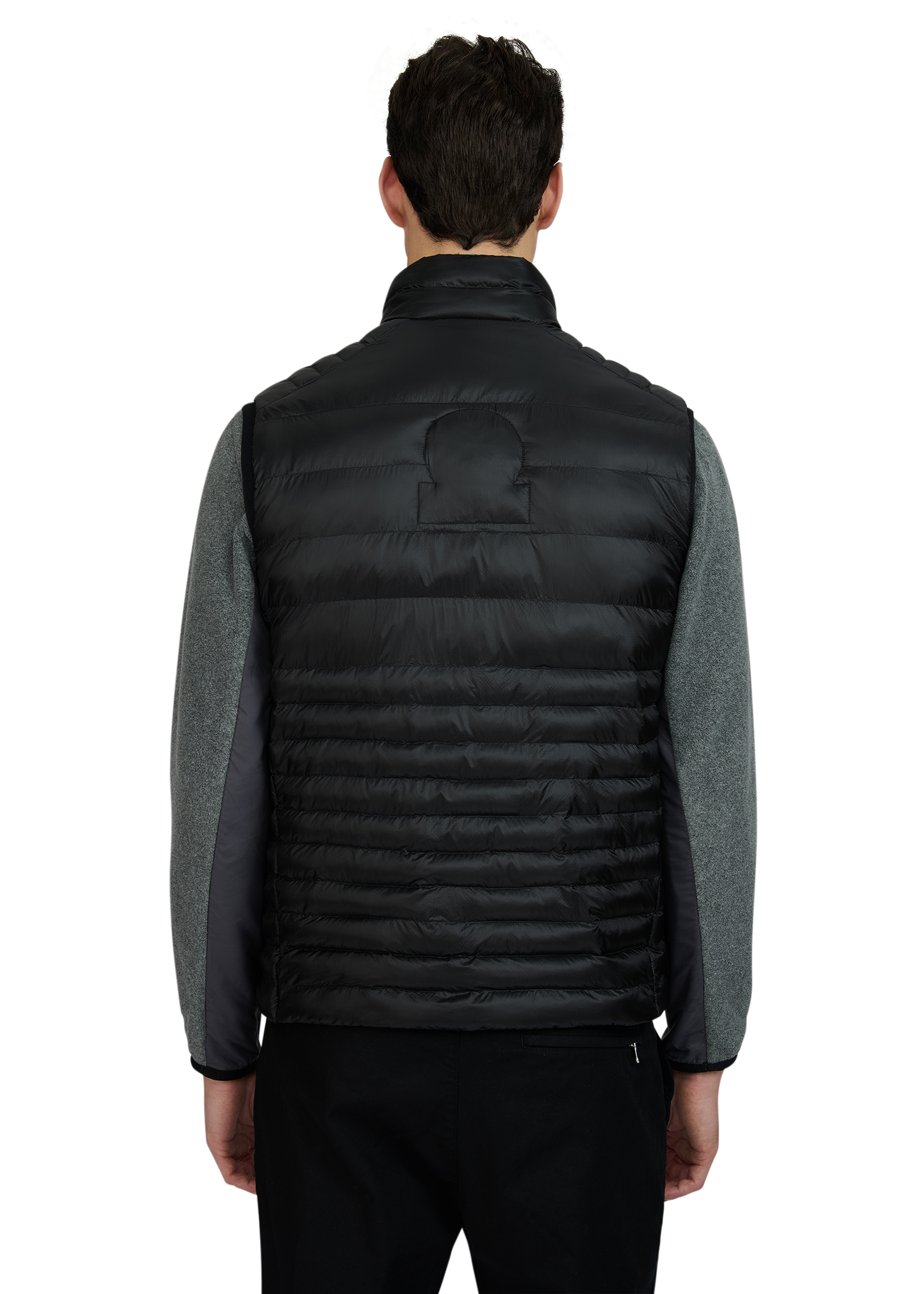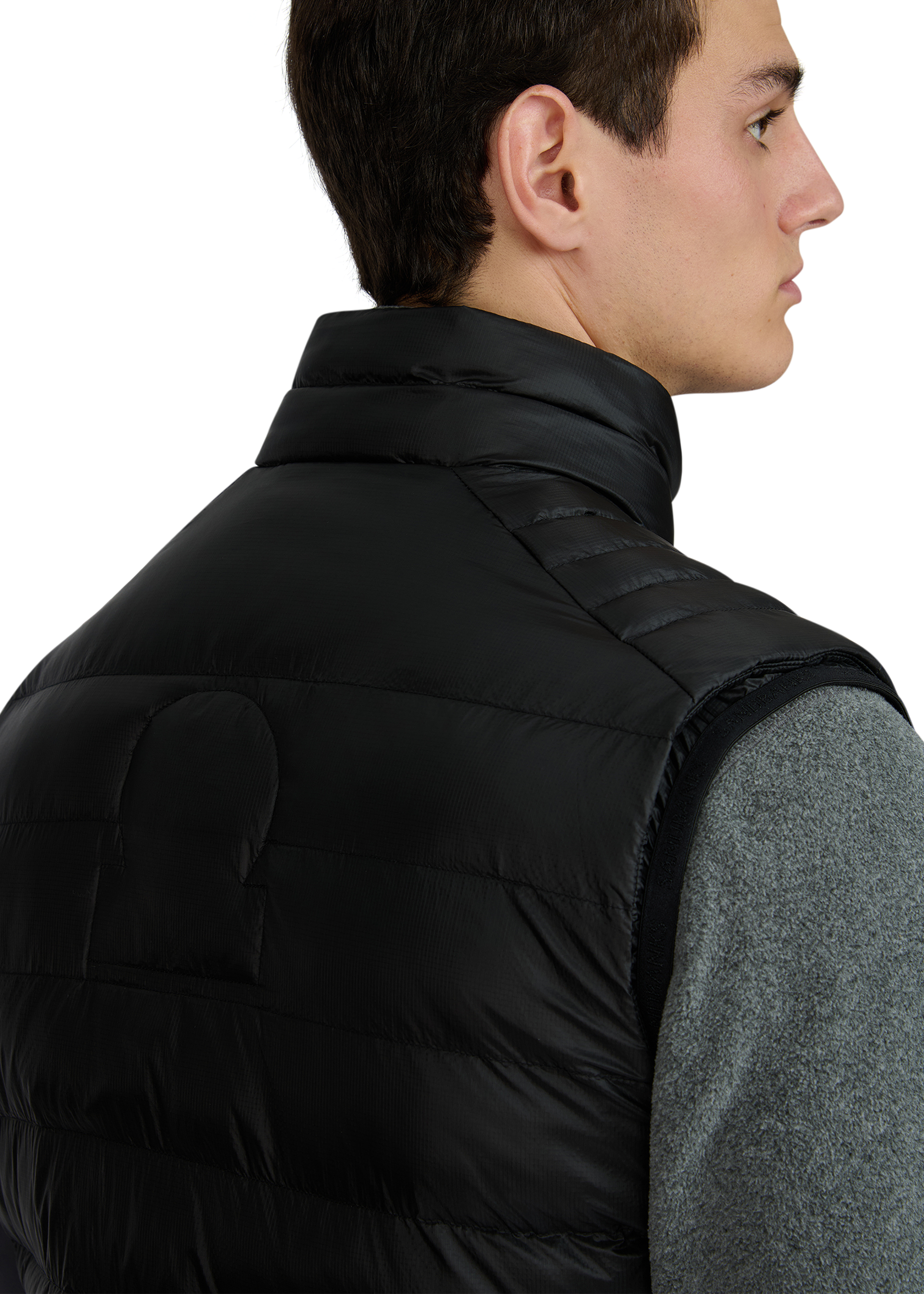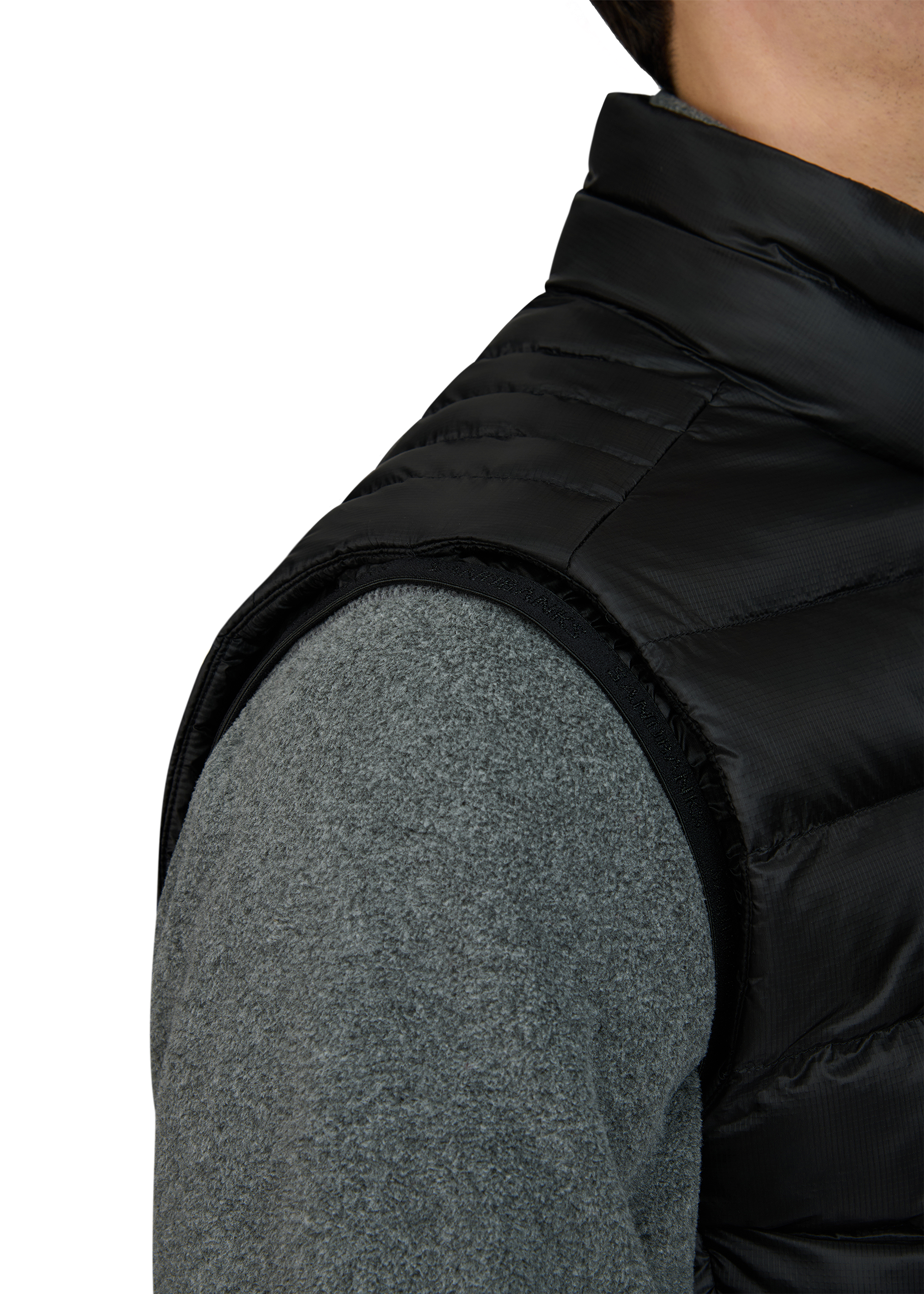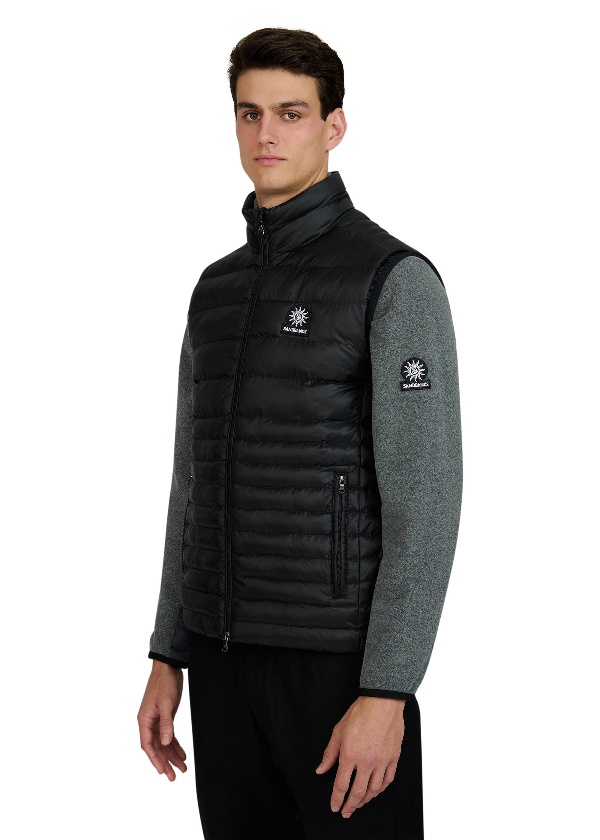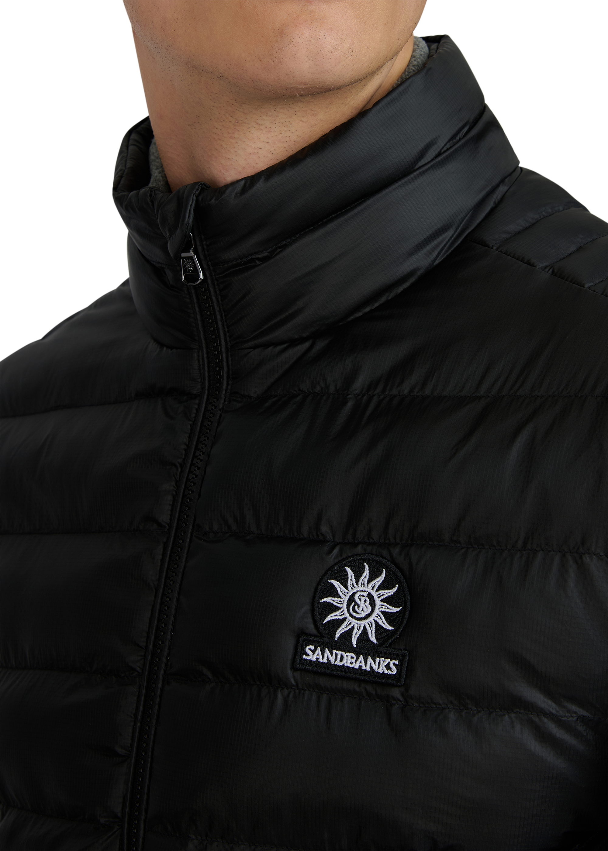 Sandbanks Ripstop Micro Puffer Gilet in black. A transitional staple - this lightweight gilet is crafted from premium, water-resistant ripstop fabric made with recycled materials. Features include internal and external zip pockets with YKK engraved zips and embroidered chest badge.