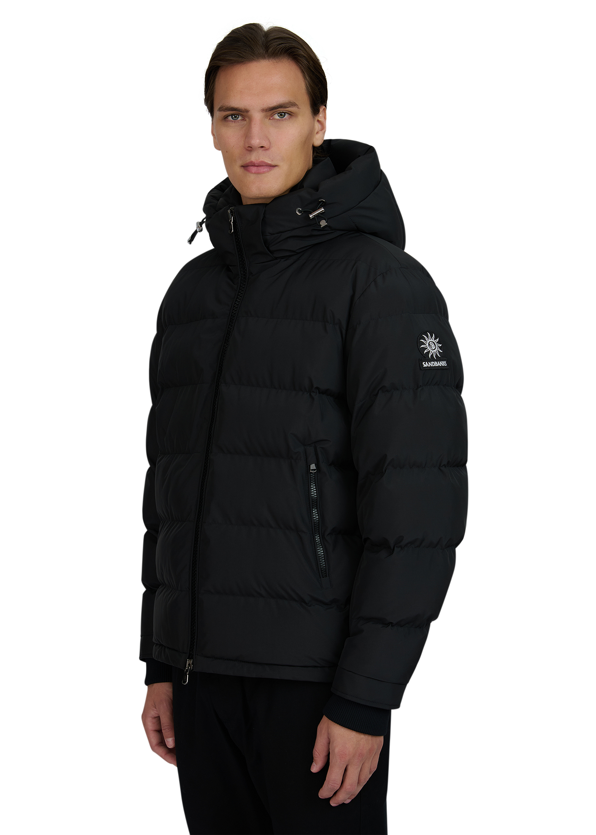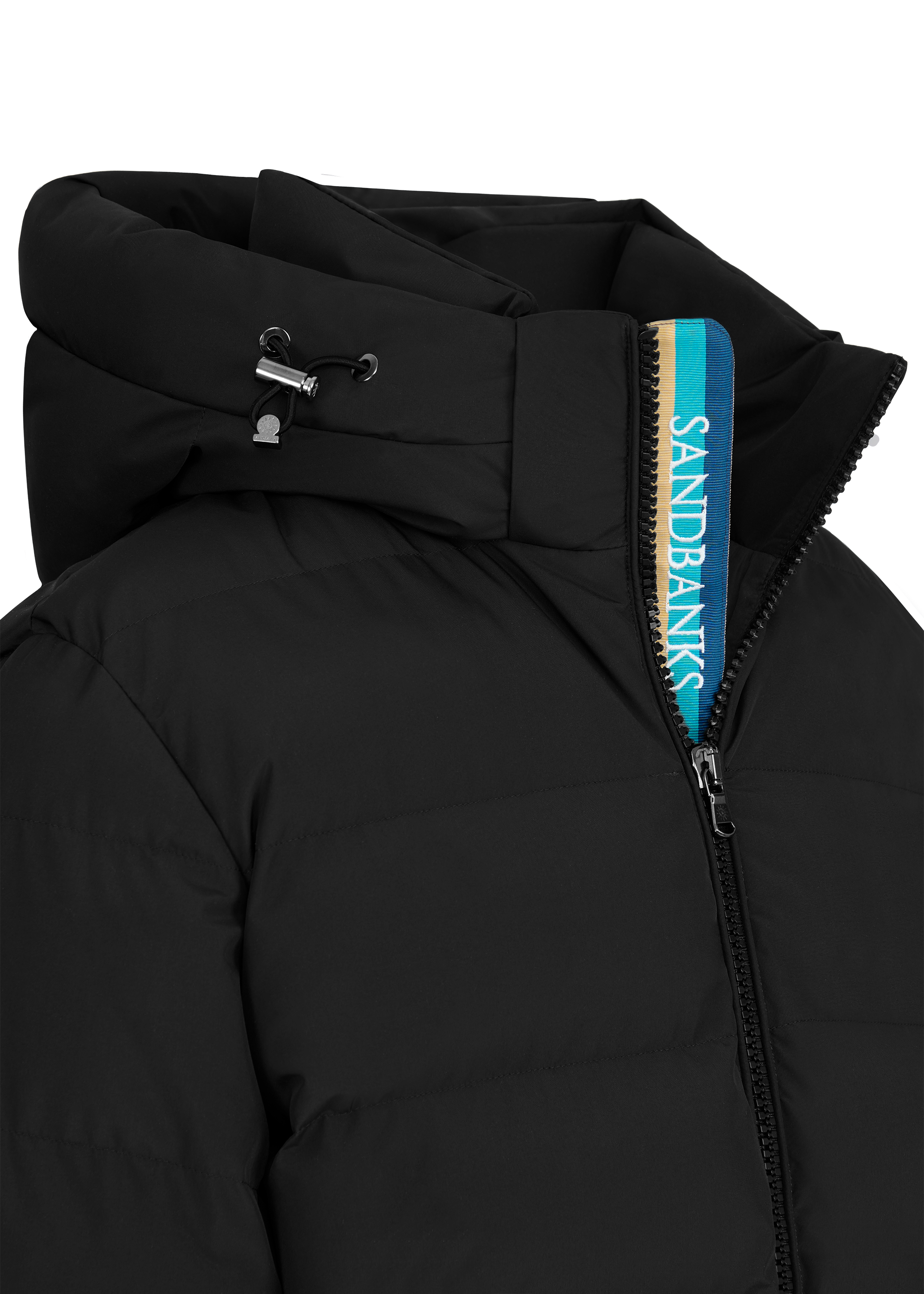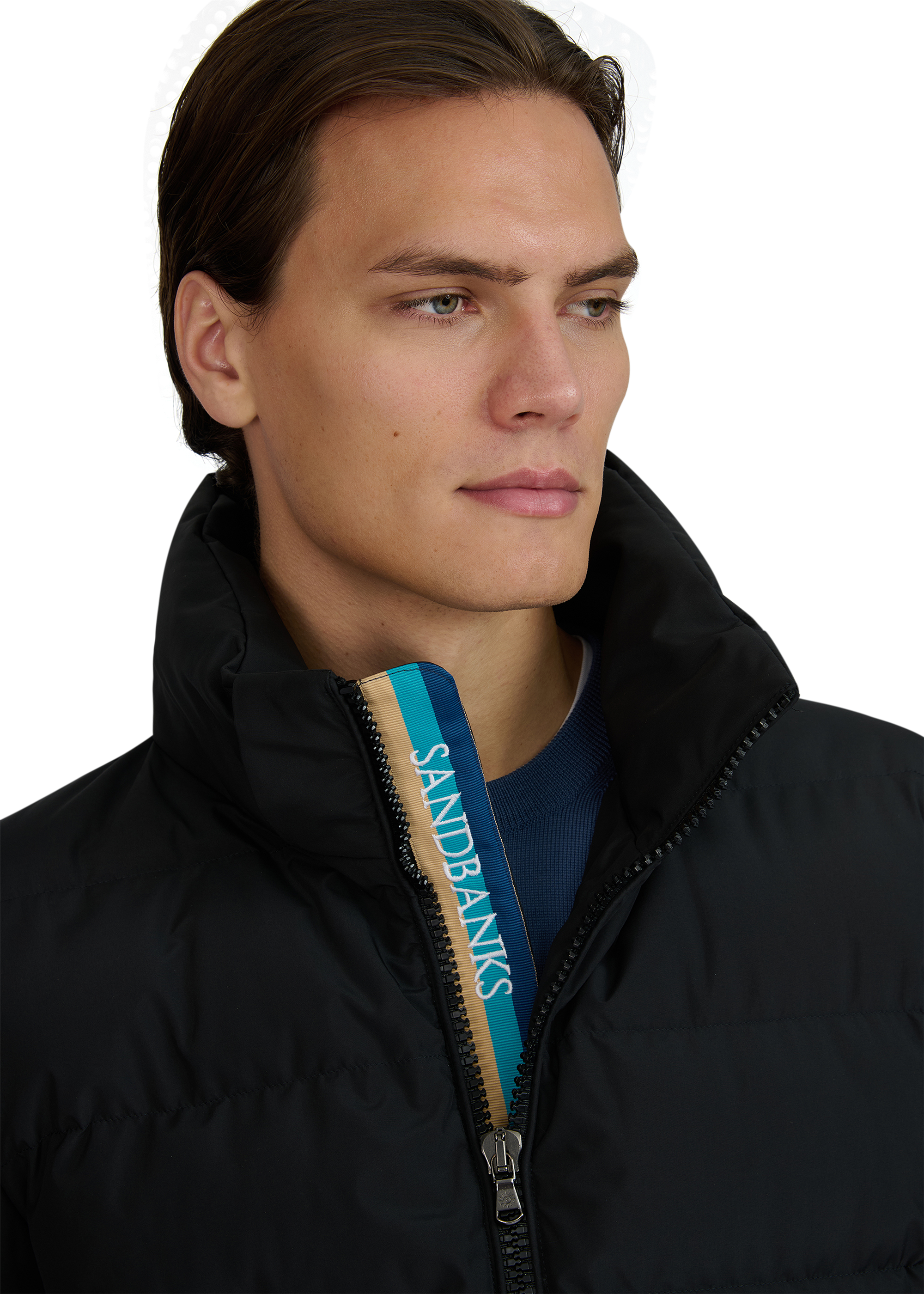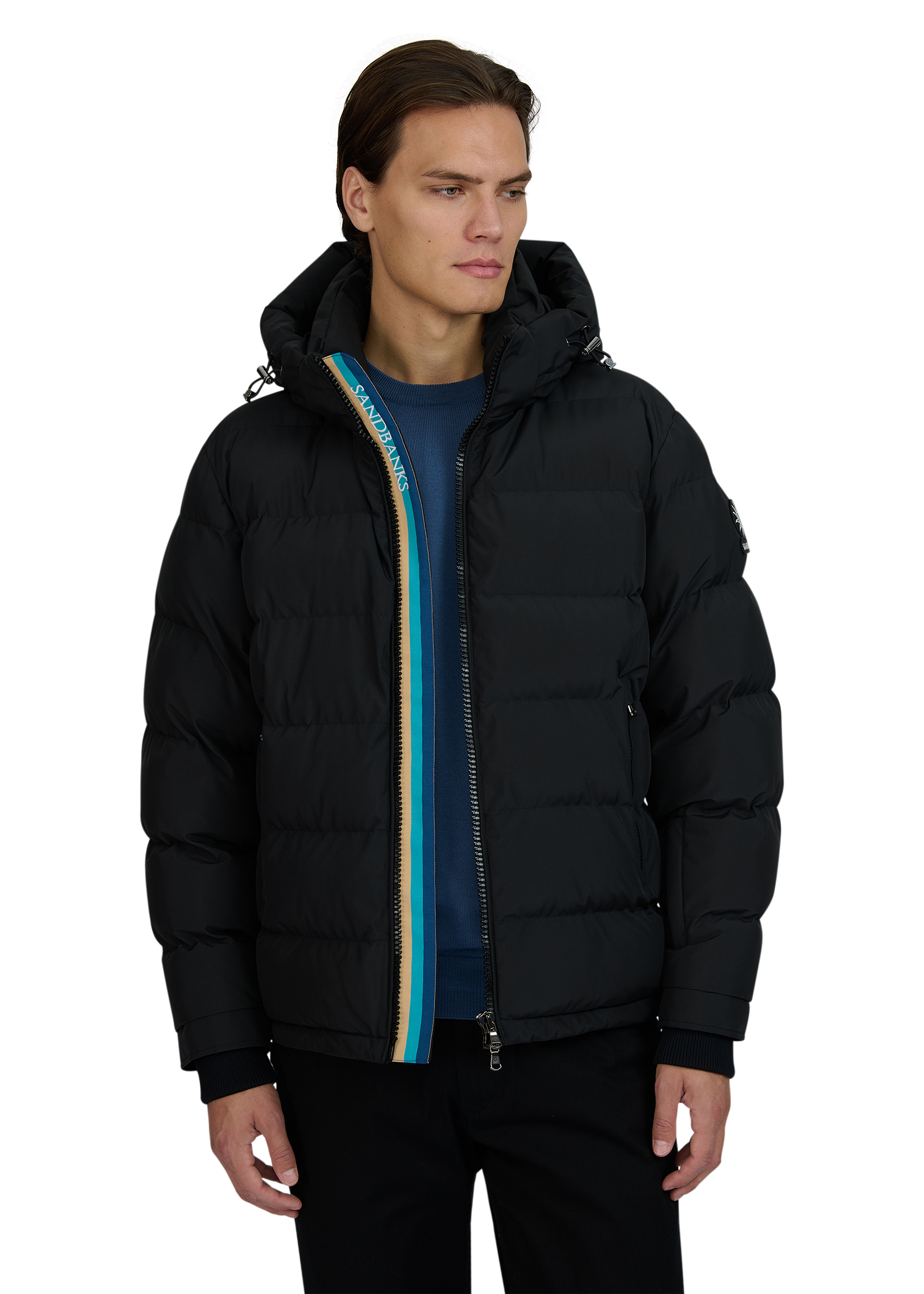 The Sandbanks Banks Puffer Jacket with tri-colour wind placket. Made almost entirely from recycled plastic bottles with a black shell fabric, this jacket has high thermal retention and features a Sandbanks embroidered logo badges, large lower pocket/chest pocket details and detachable hood.