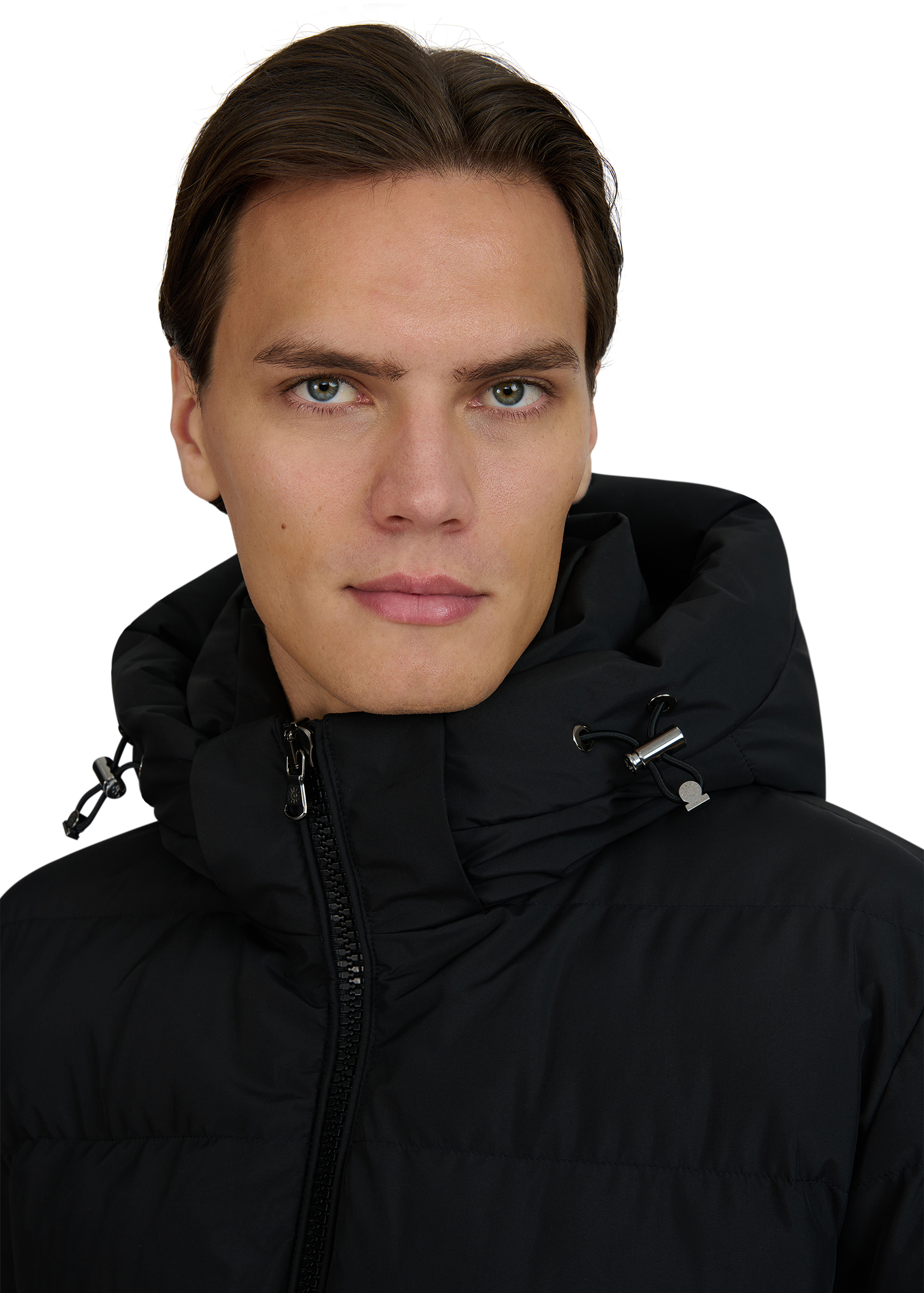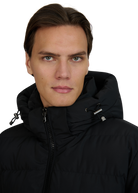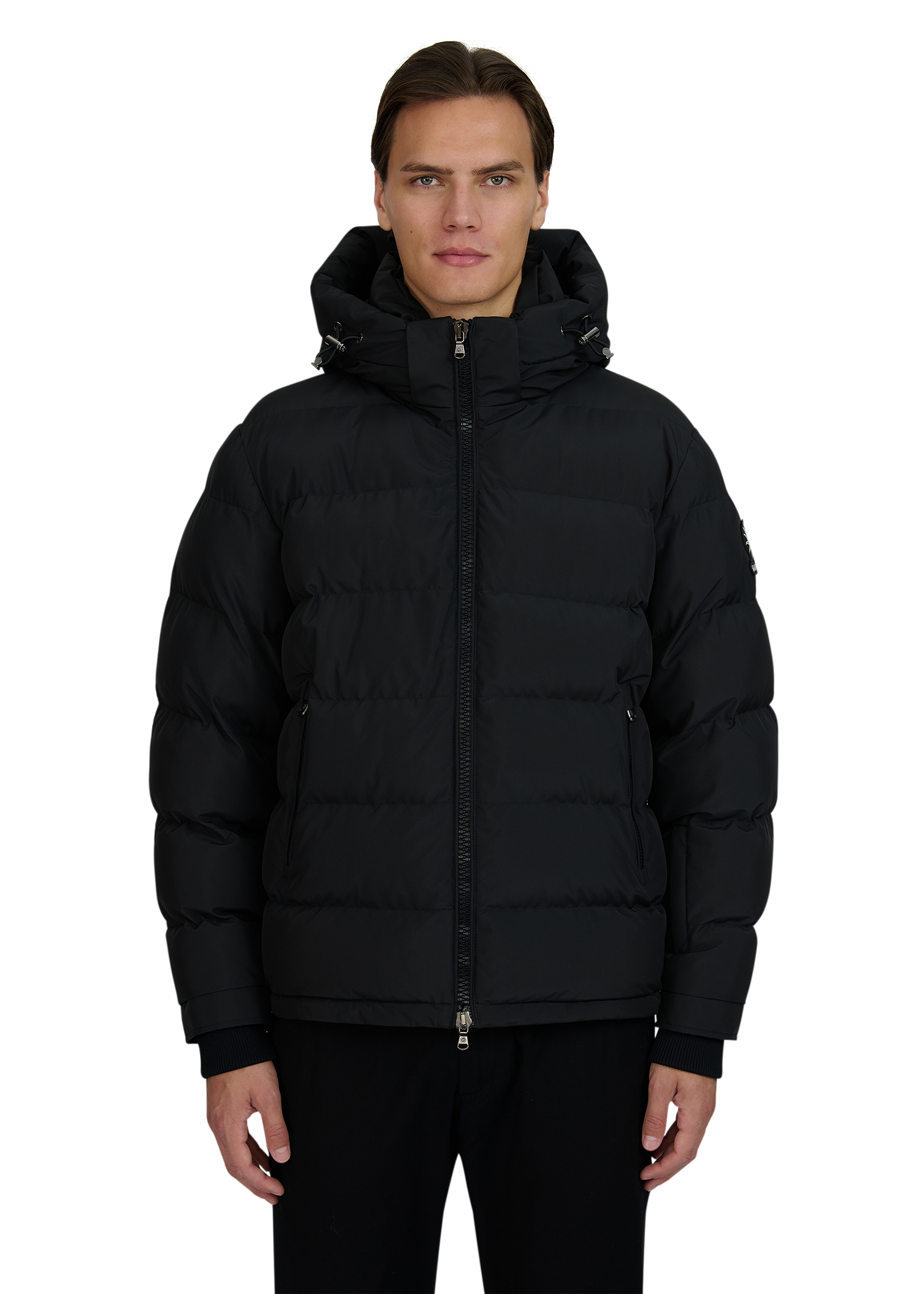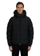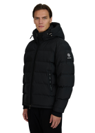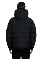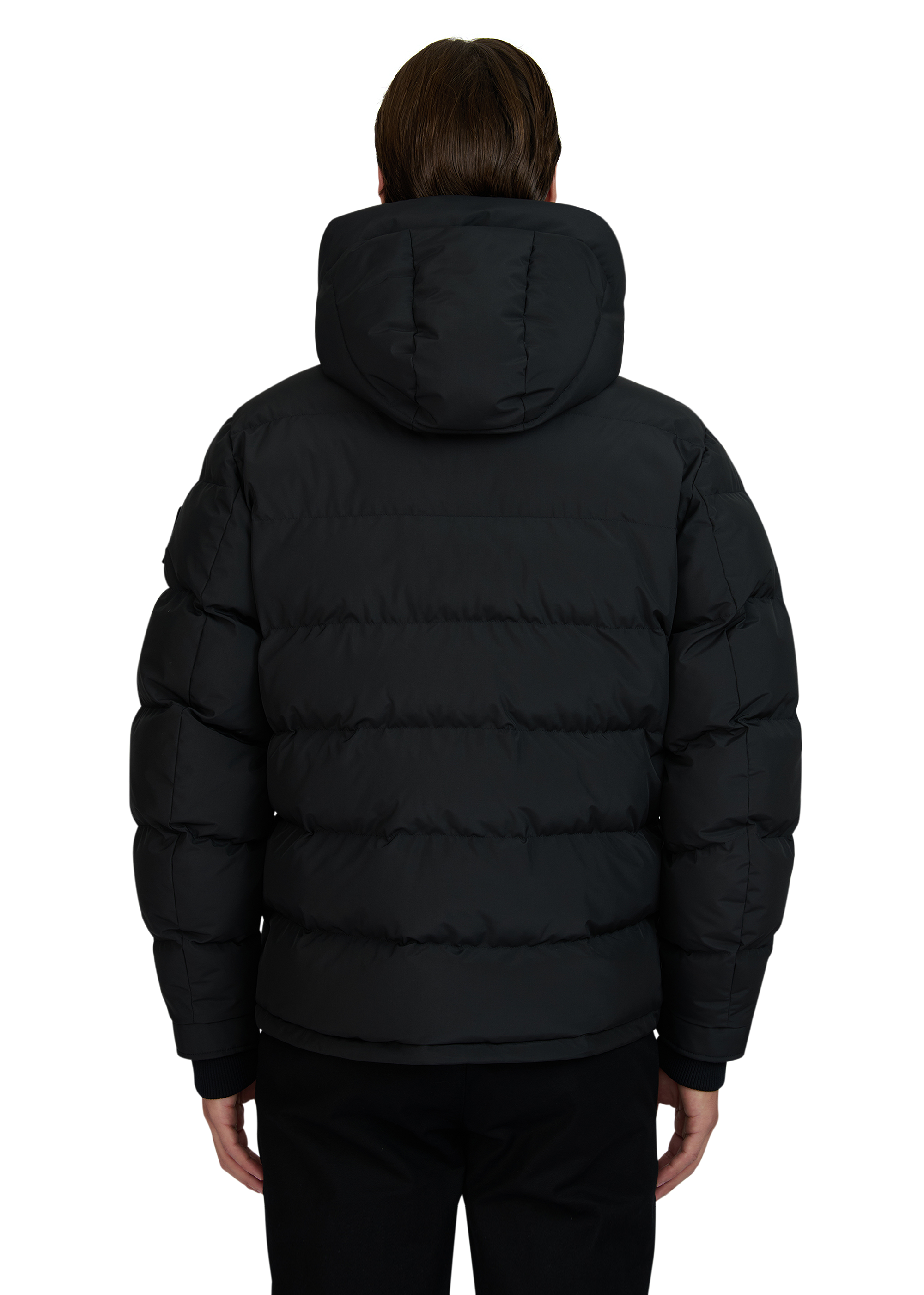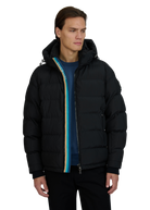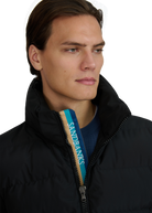 The Sandbanks Banks Puffer Jacket with tri-colour wind placket. Made almost entirely from recycled plastic bottles with a black shell fabric, this jacket has high thermal retention and features a Sandbanks embroidered logo badges, large lower pocket/chest pocket details and detachable hood.