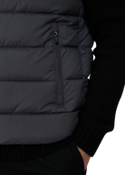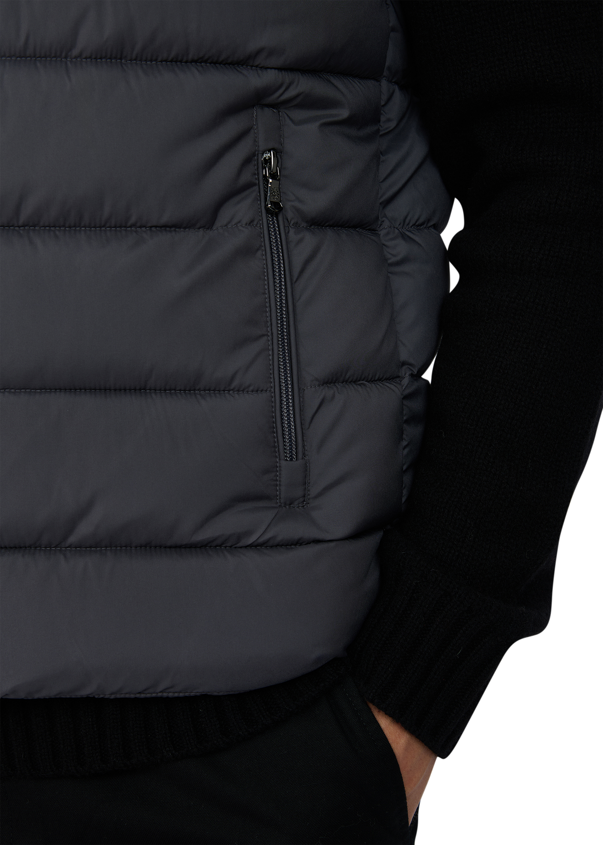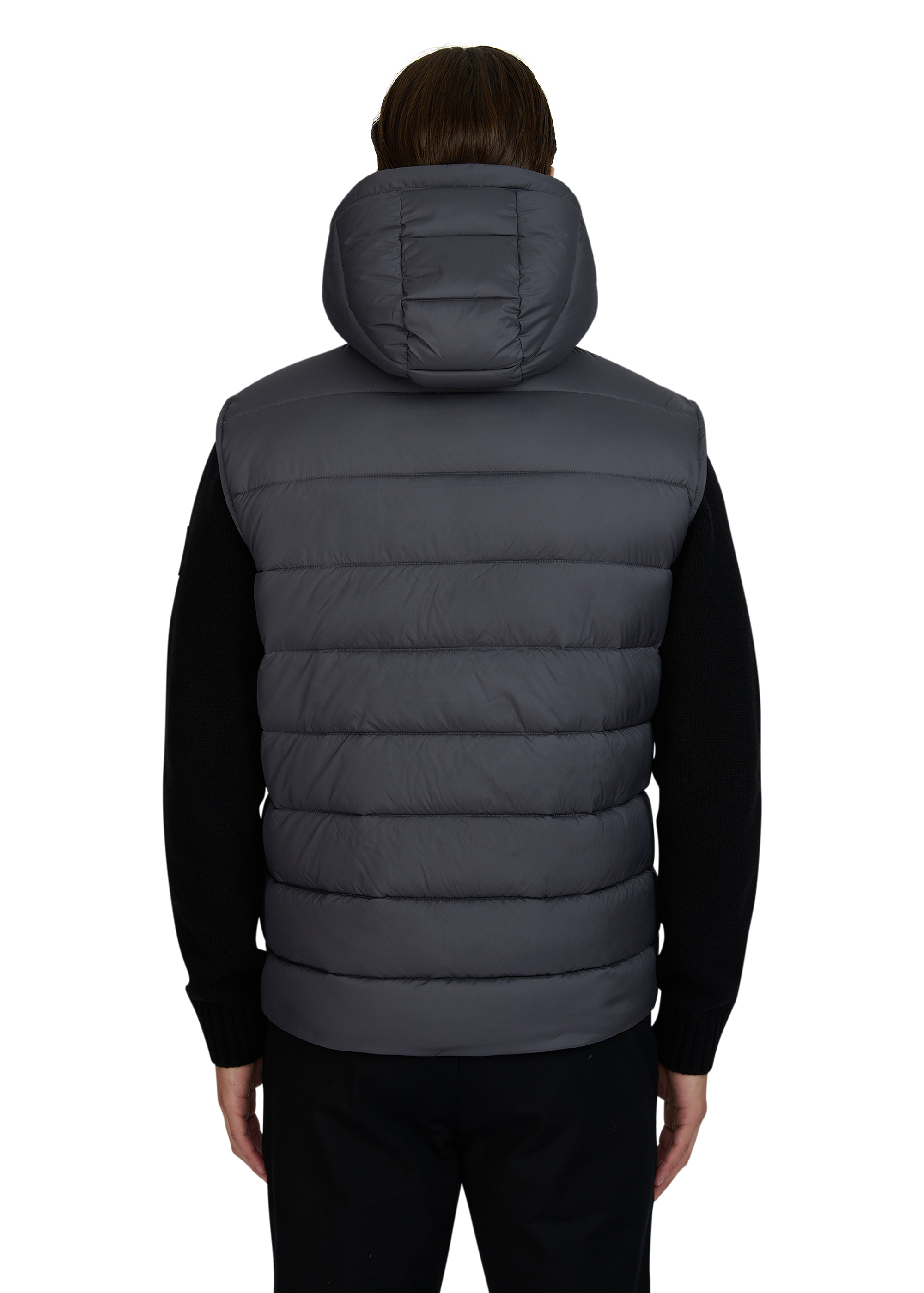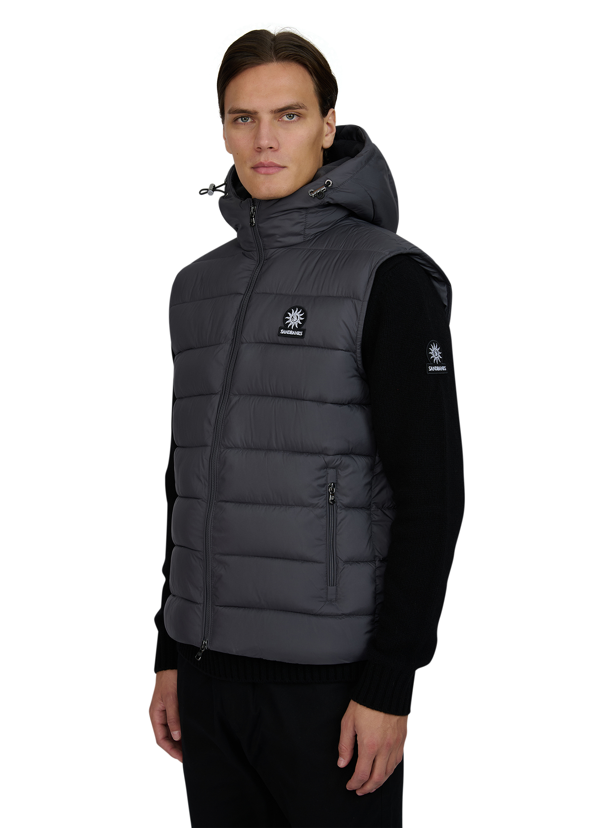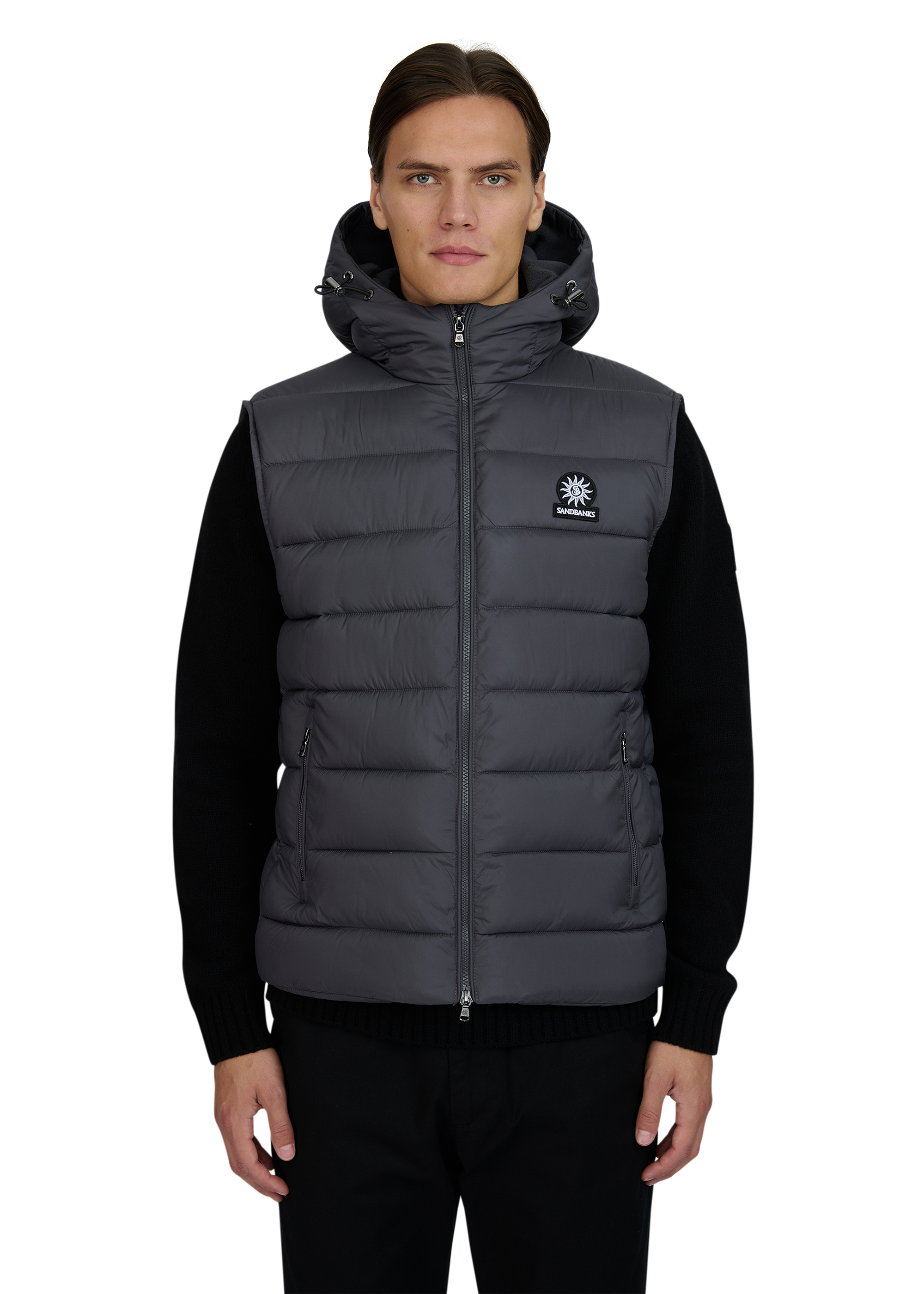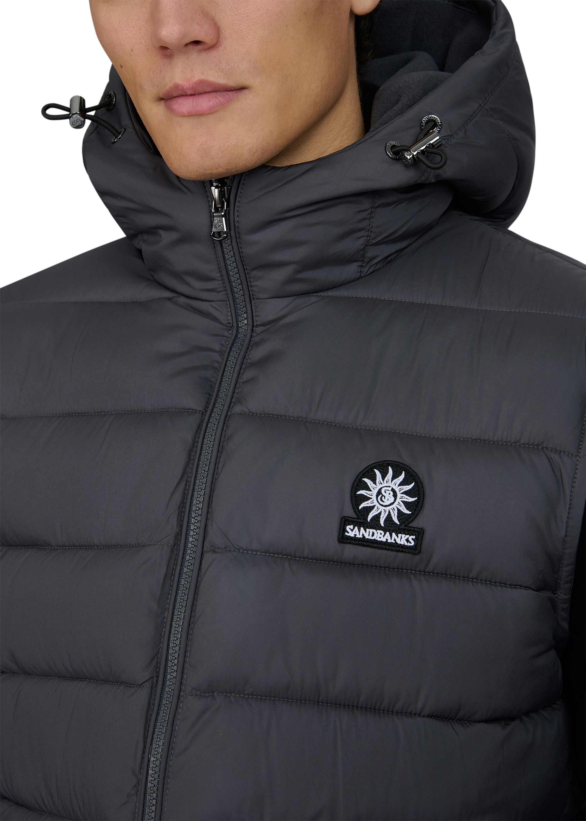 Sandbanks Frontier Hooded Puffer Gilet in charcoal. This lightweight gilet is made almost entirely from recycled plastic bottles and features a Sandbanks ottoman embroidered chest badge, a 2-way YKK Vislon central zip, YKK coil side entry pockets with fleece lining, and a micro polar fleece lined hood with cord adjusters.