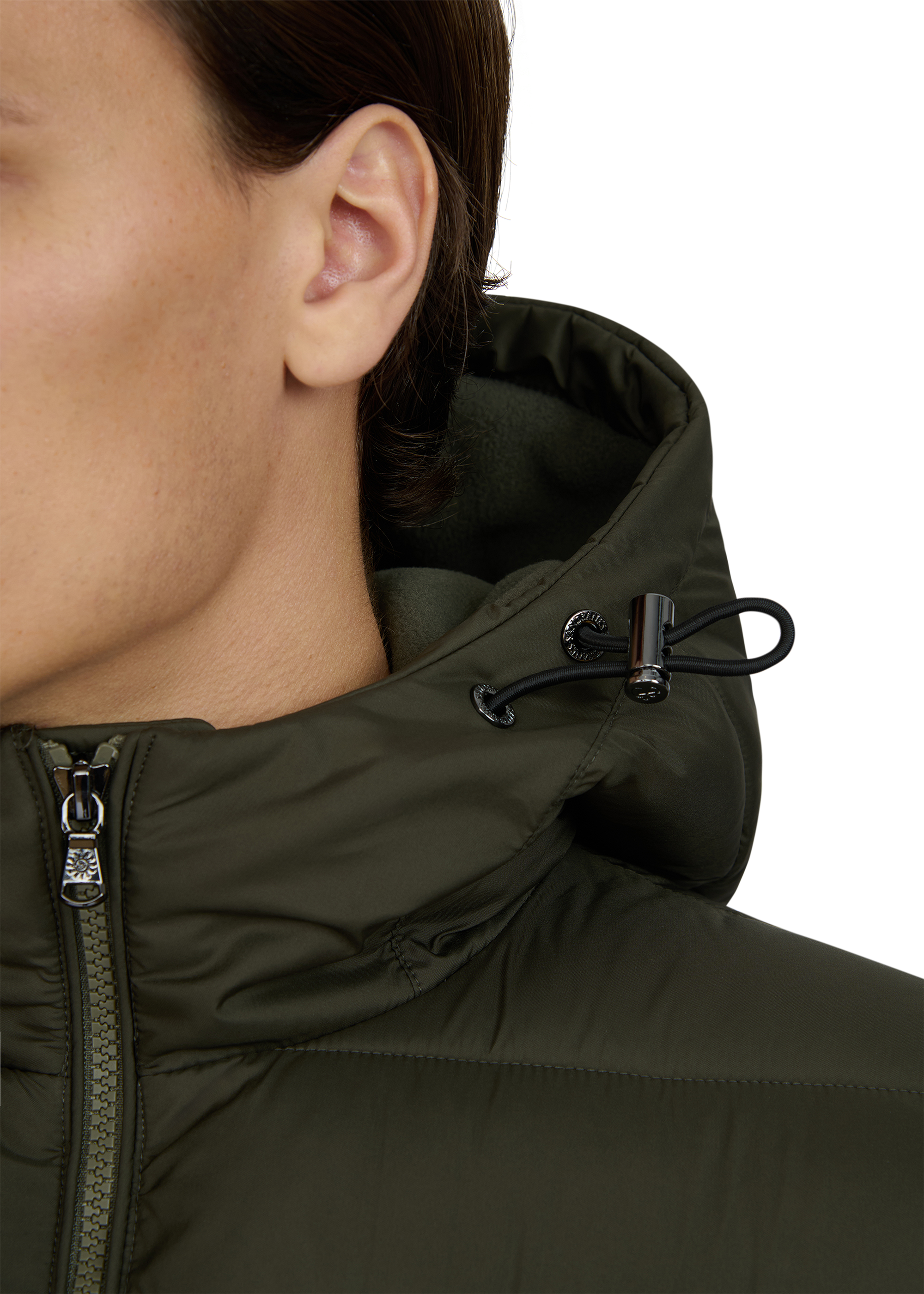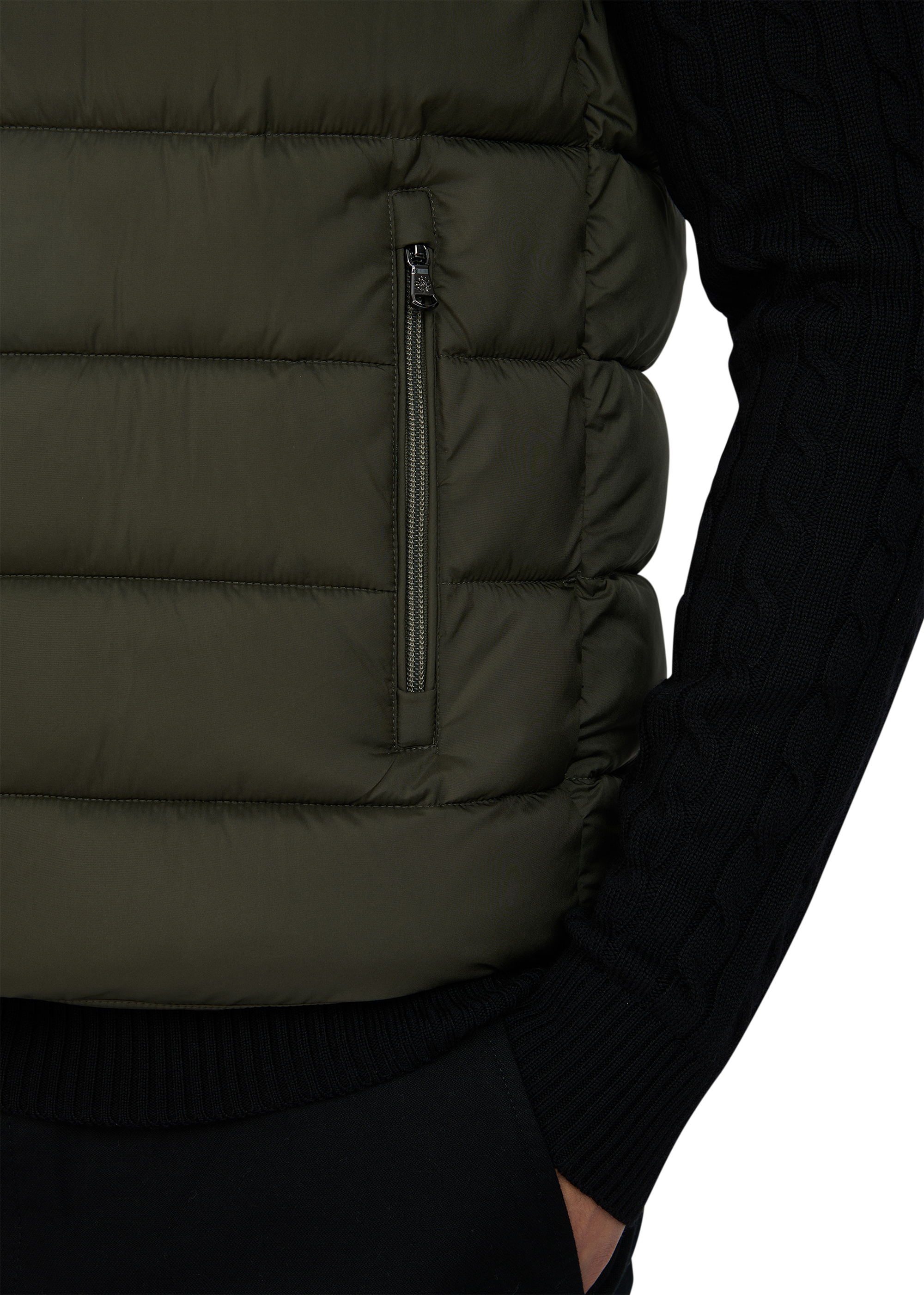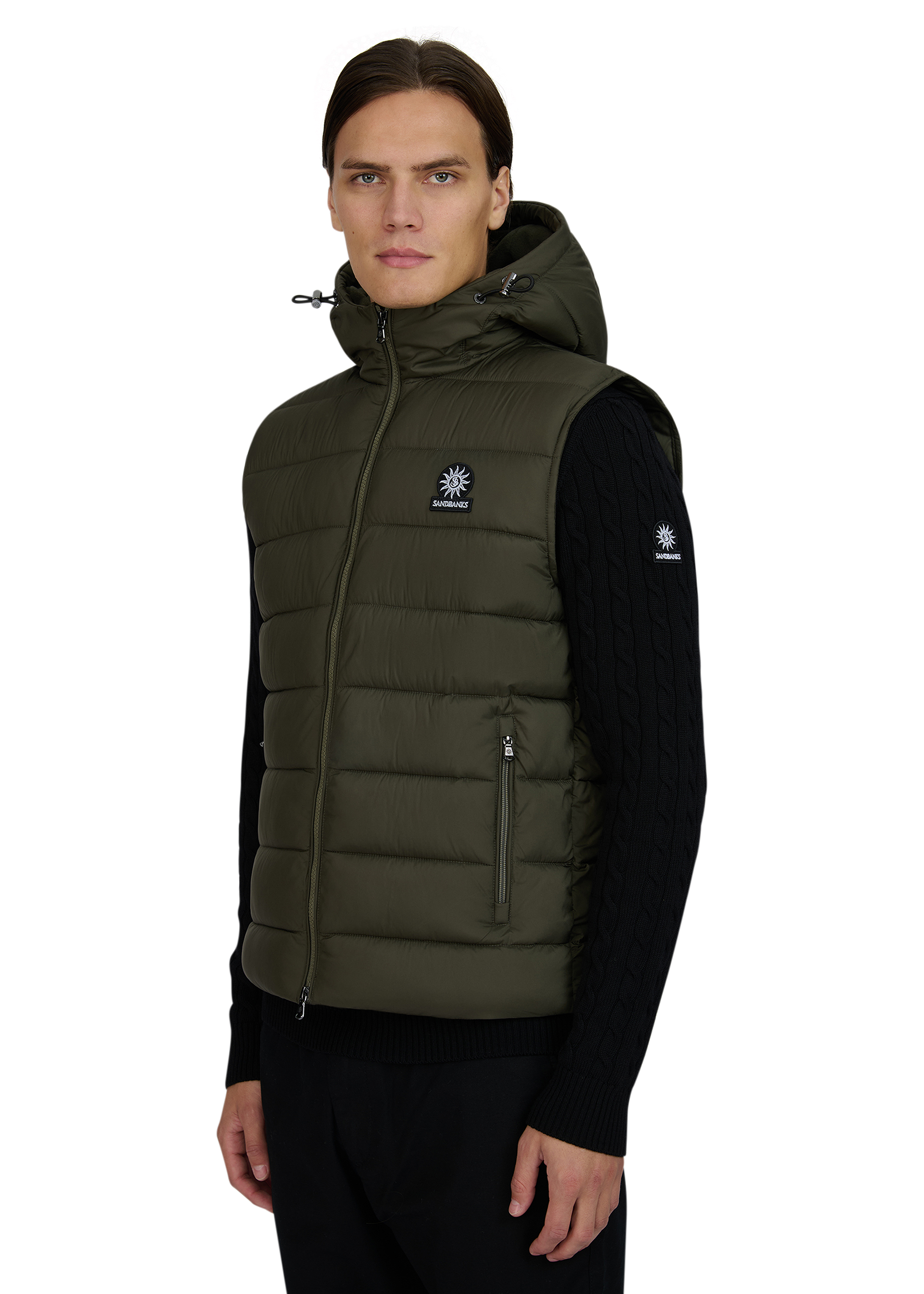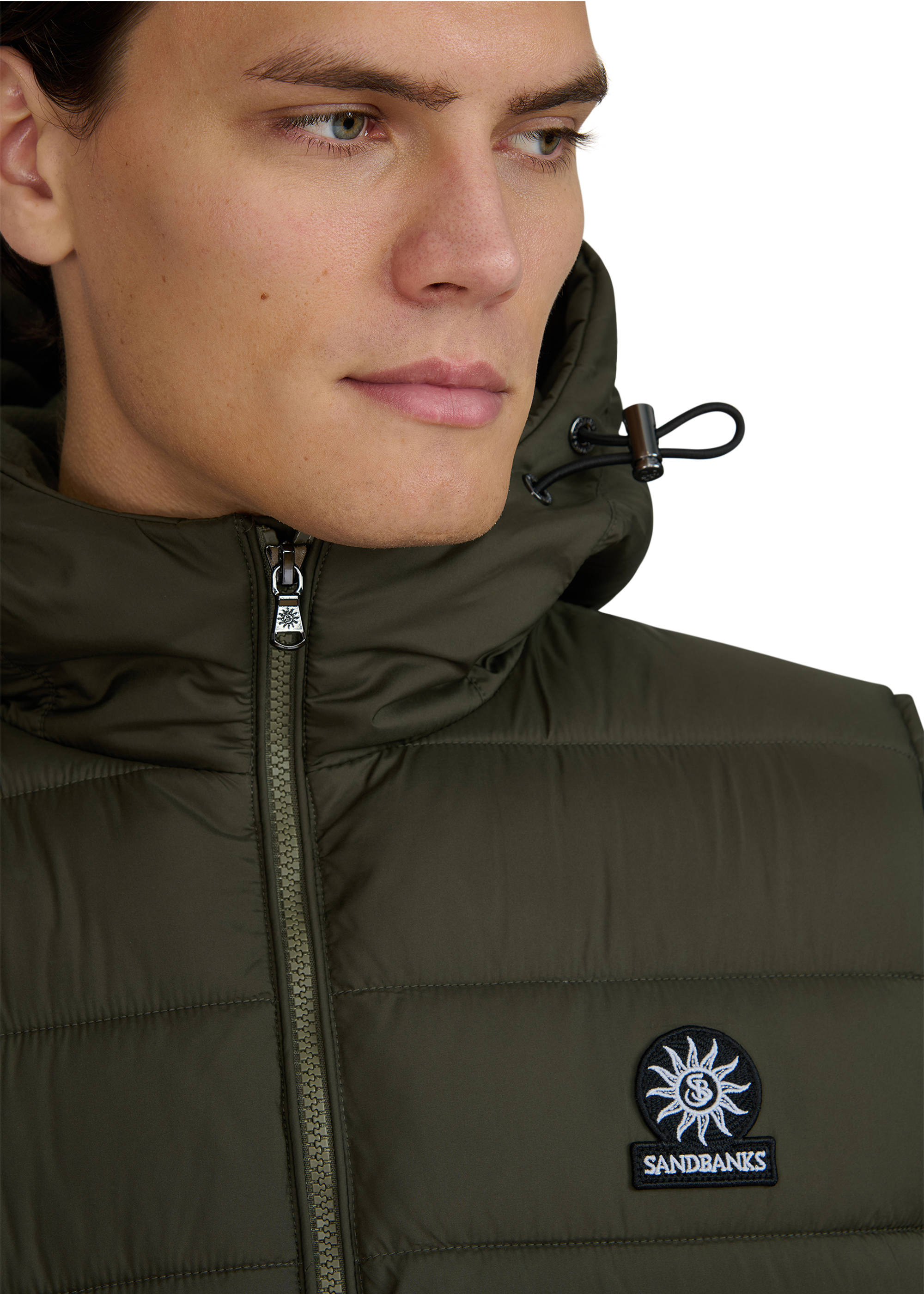 Sandbanks Frontier Hooded Puffer Gilet in khaki. This lightweight gilet is made almost entirely from recycled plastic bottles and features a Sandbanks ottoman embroidered chest badge, a 2-way YKK Vislon central zip, YKK coil side entry pockets with fleece lining, and a micro polar fleece lined hood with cord adjusters.