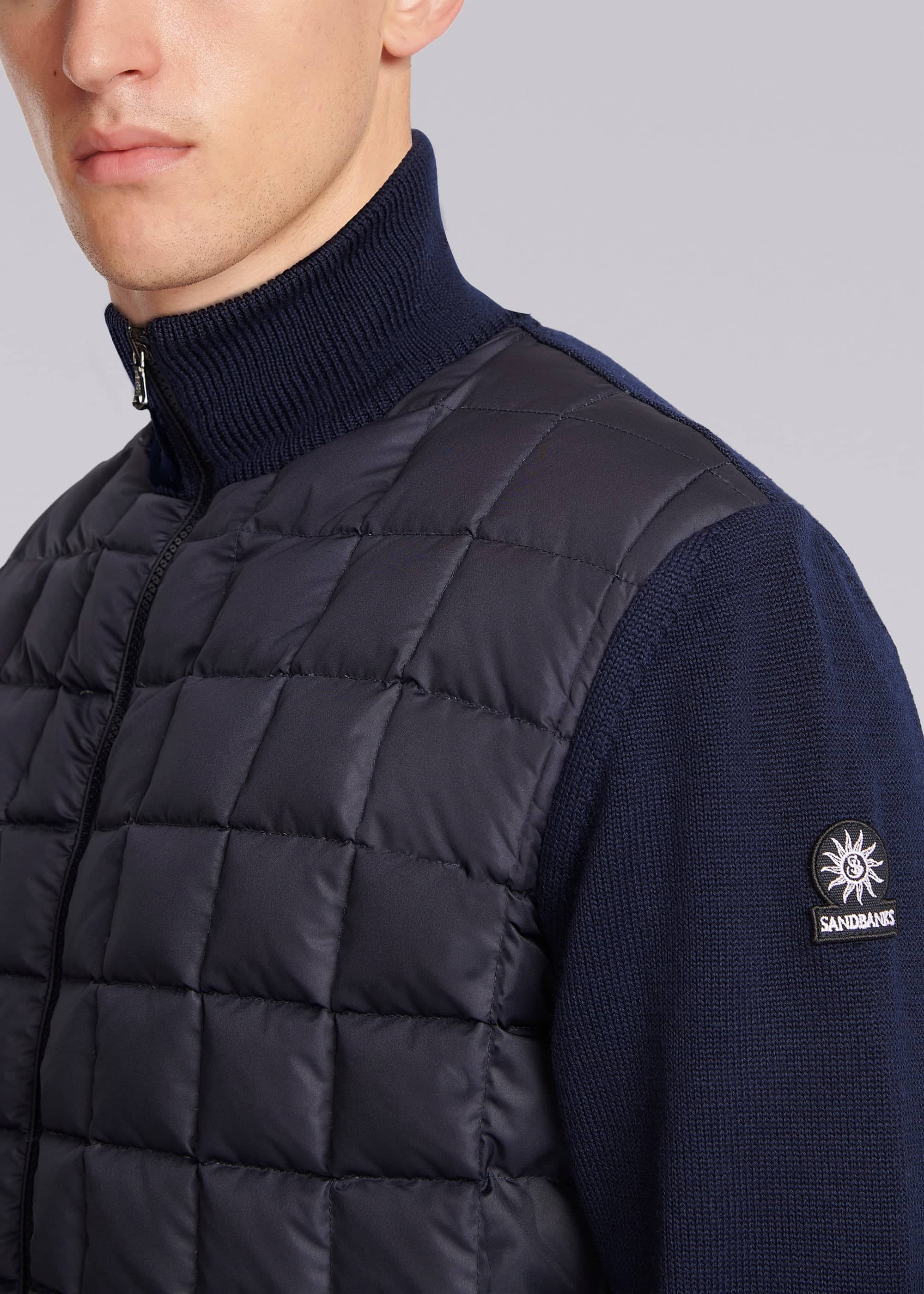 The Sandbanks Hybrid knit zip jacket in navy, a contemporary menswear piece that features a unique square baffle puffer front that is filled with natural recycled down for warmth making this an ideal layering piece or stand alone jacket. The sleeves, funnel neck, waistband and back are made from a Merino wool blend for a luxurious feel. This jacket also benefits from a 2-way Italian Lampo zip, 2 concealed popper close side pockets and finished with a Sandbanks badge on the sleeve.