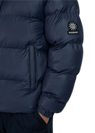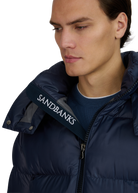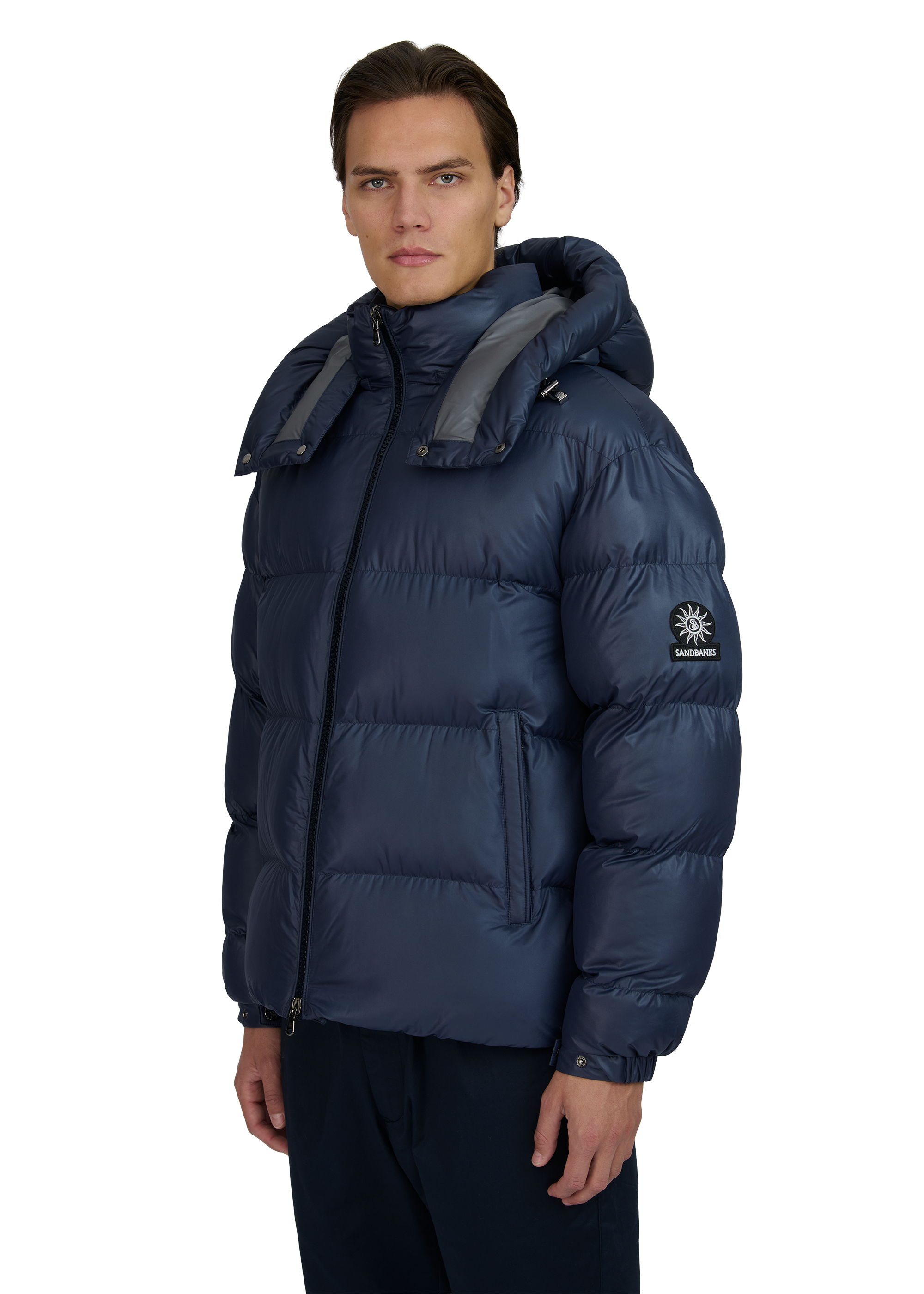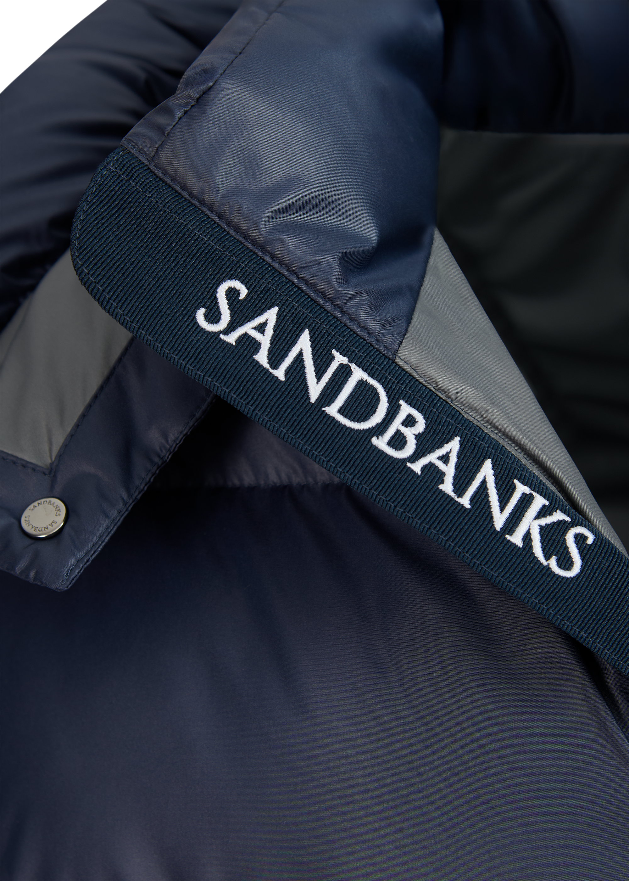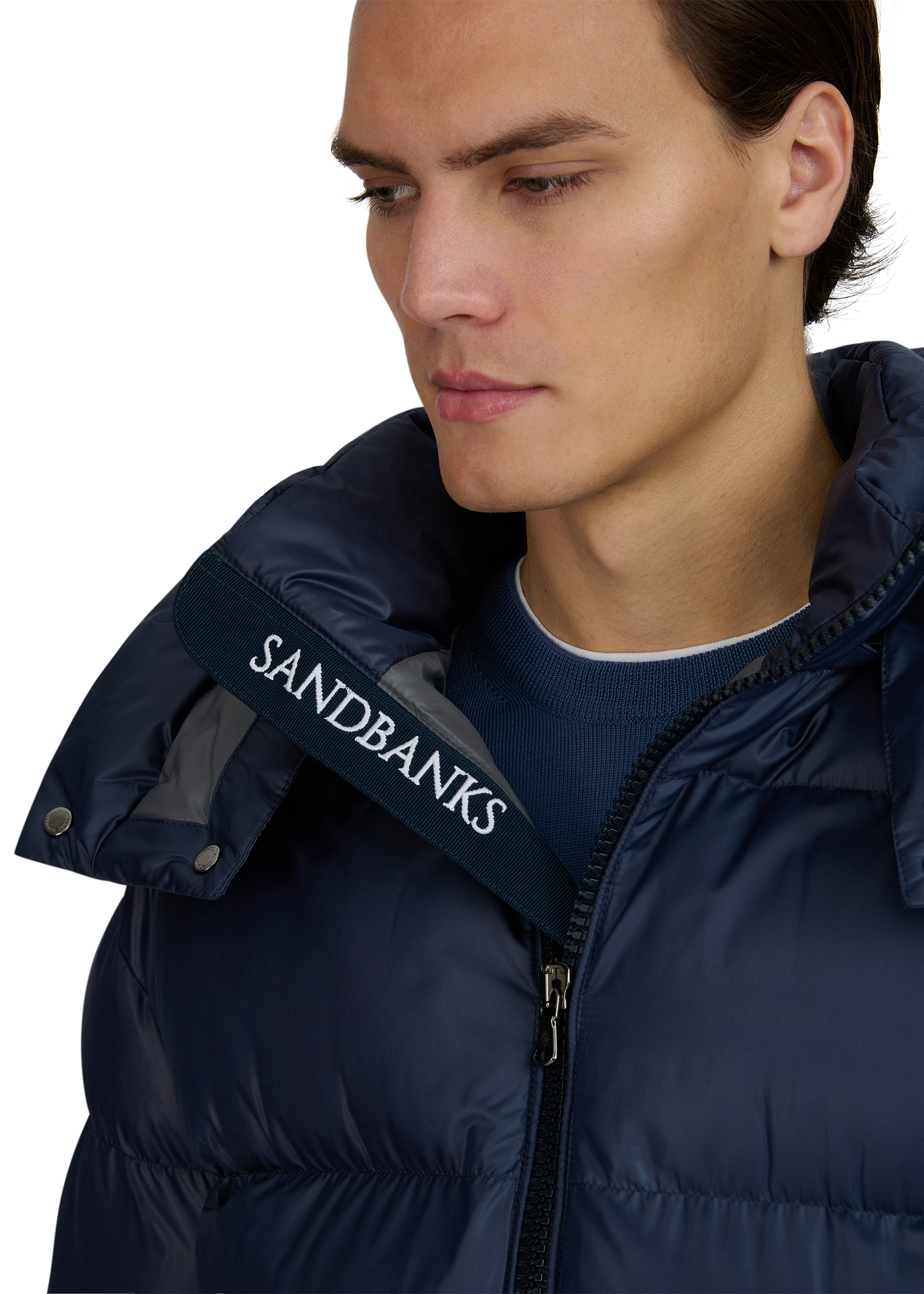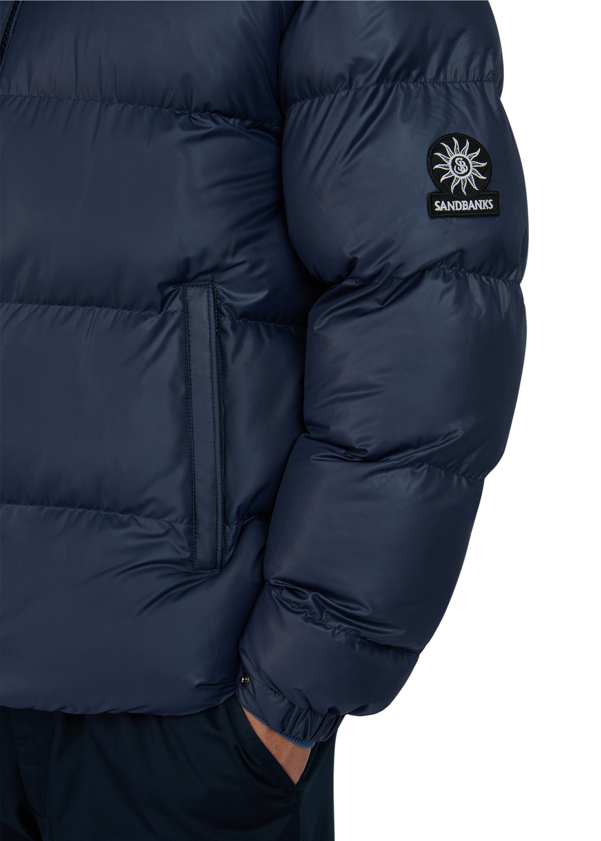 The Horizon Puffer Jacket blends craftsmanship with sustainable design, insulated with Ecodown for advanced thermal performance. Its navy shell delivers an understated finish, detailed with a Lampo two-way gunmetal zip, detachable hood with popper fastenings, and a Sandbanks embroidered sleeve badge.
