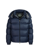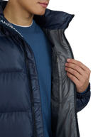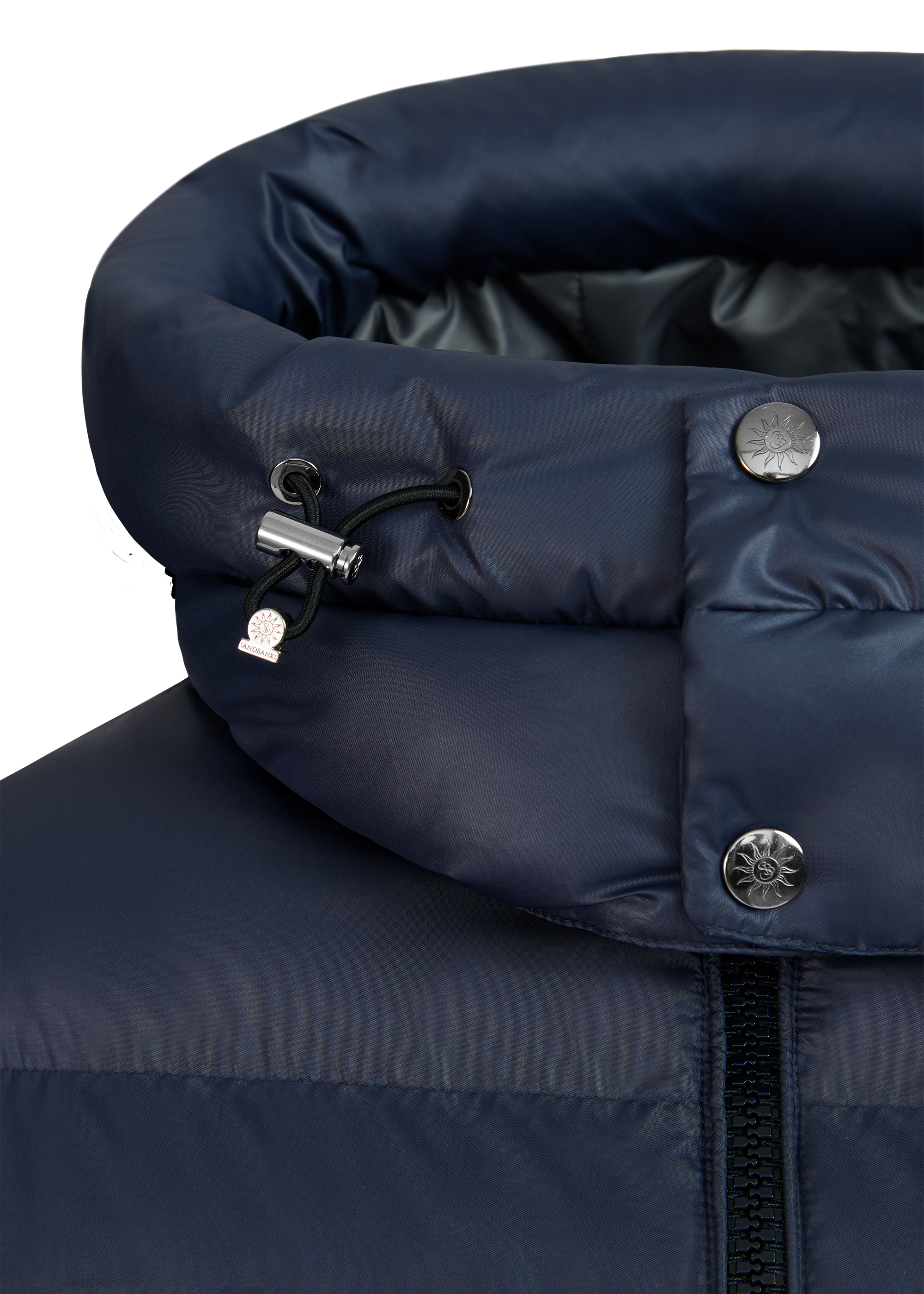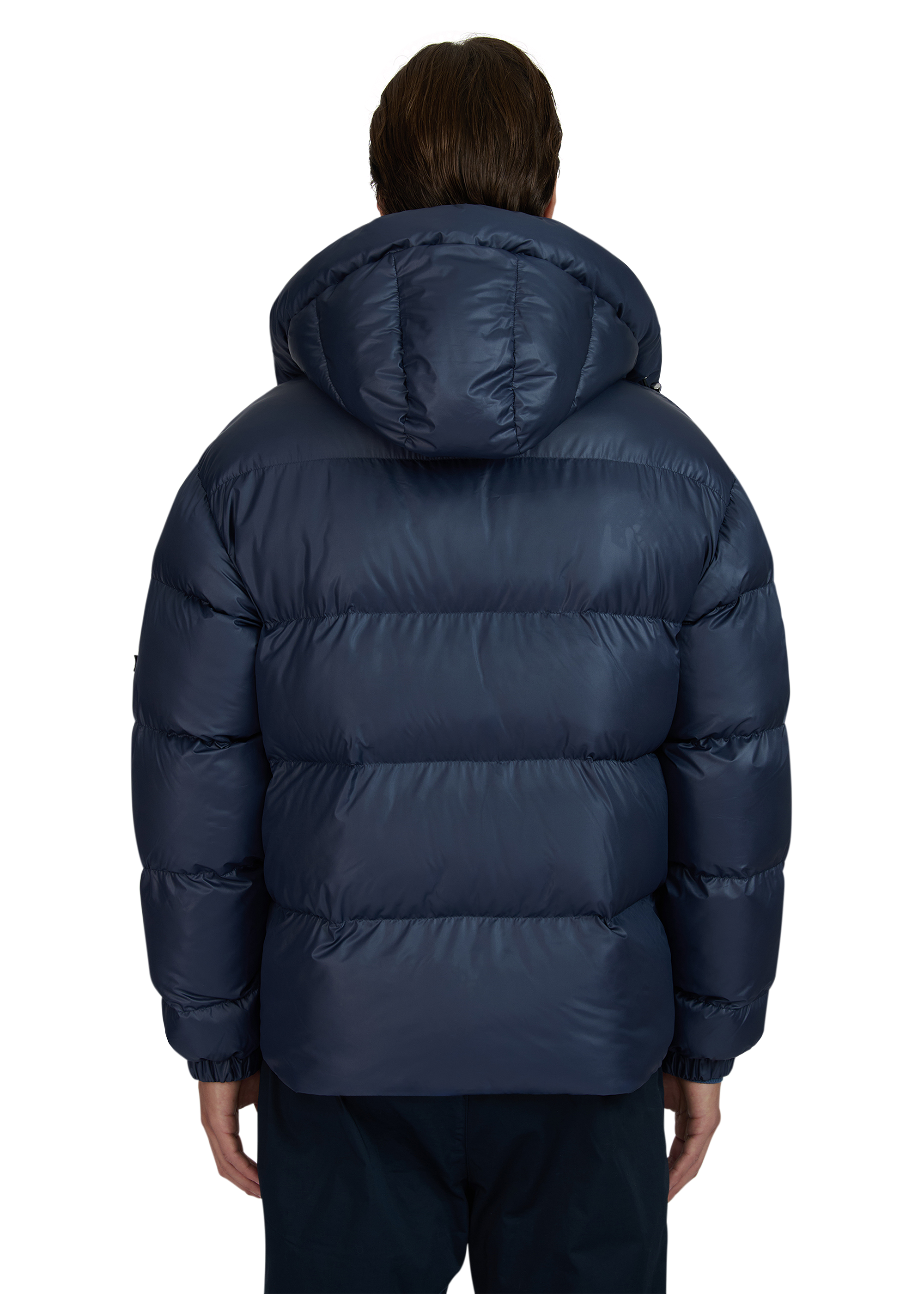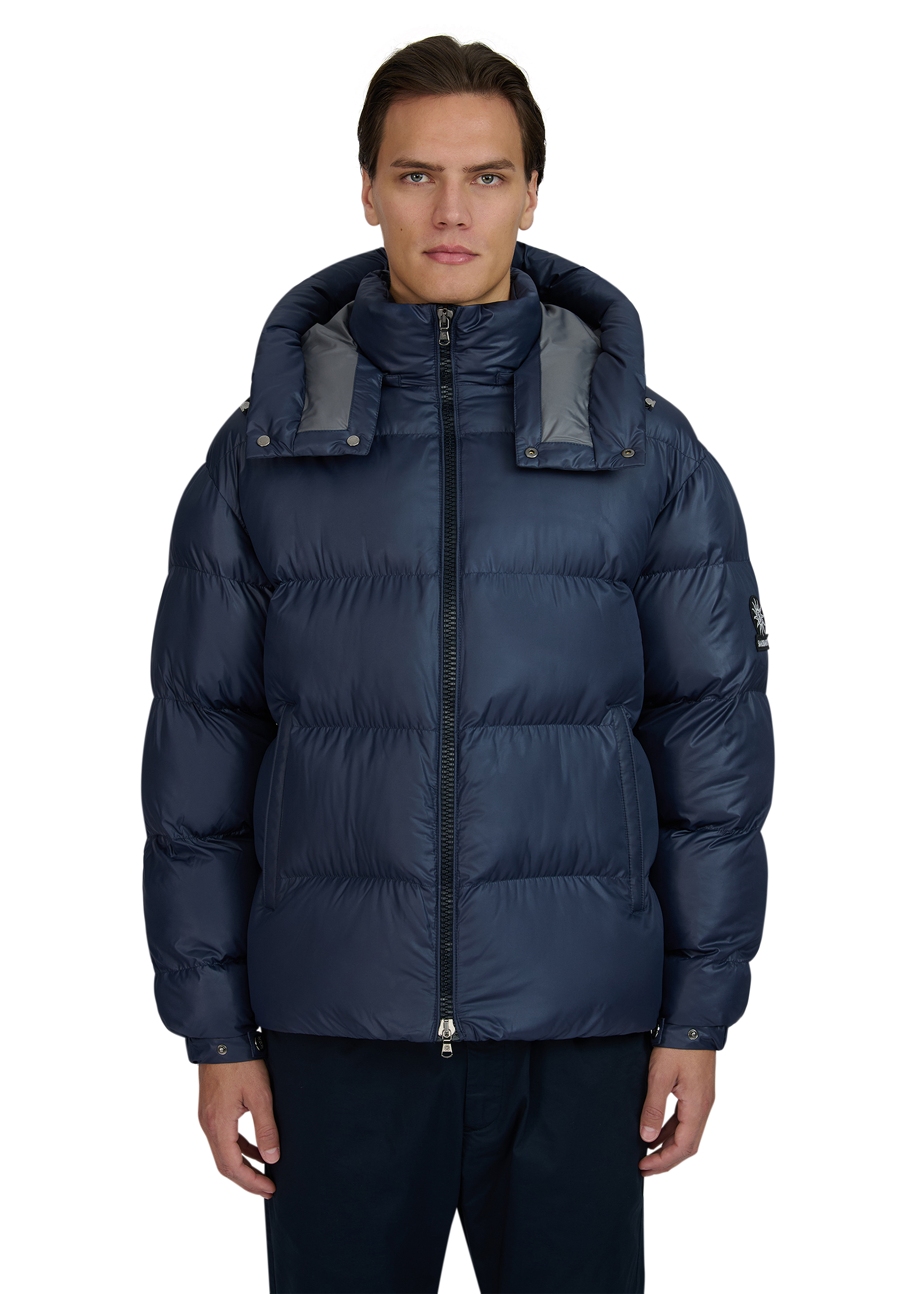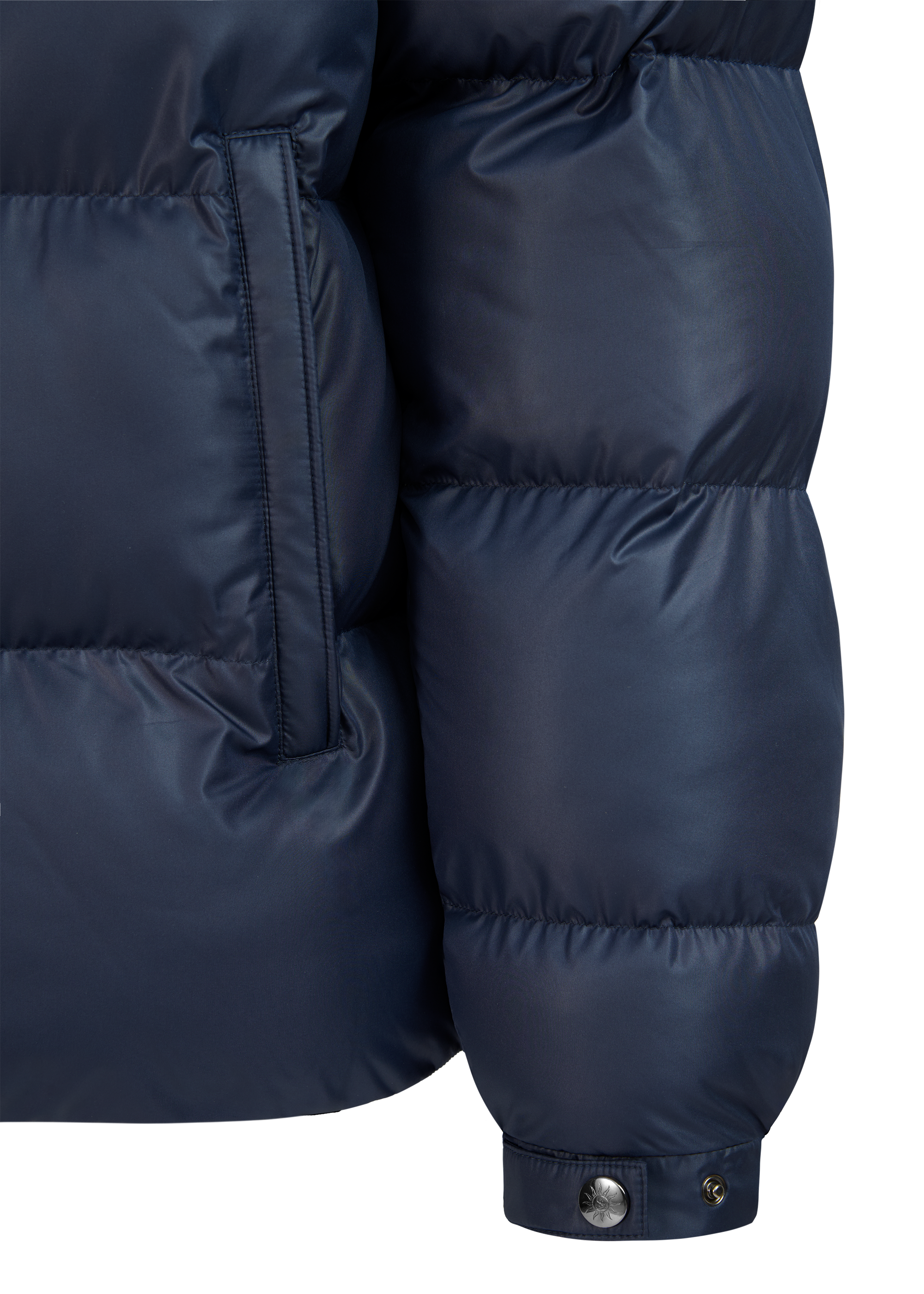 The Horizon Puffer Jacket blends craftsmanship with sustainable design, insulated with Ecodown for advanced thermal performance. Its navy shell delivers an understated finish, detailed with a Lampo two-way gunmetal zip, detachable hood with popper fastenings, and a Sandbanks embroidered sleeve badge.