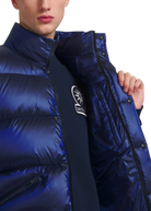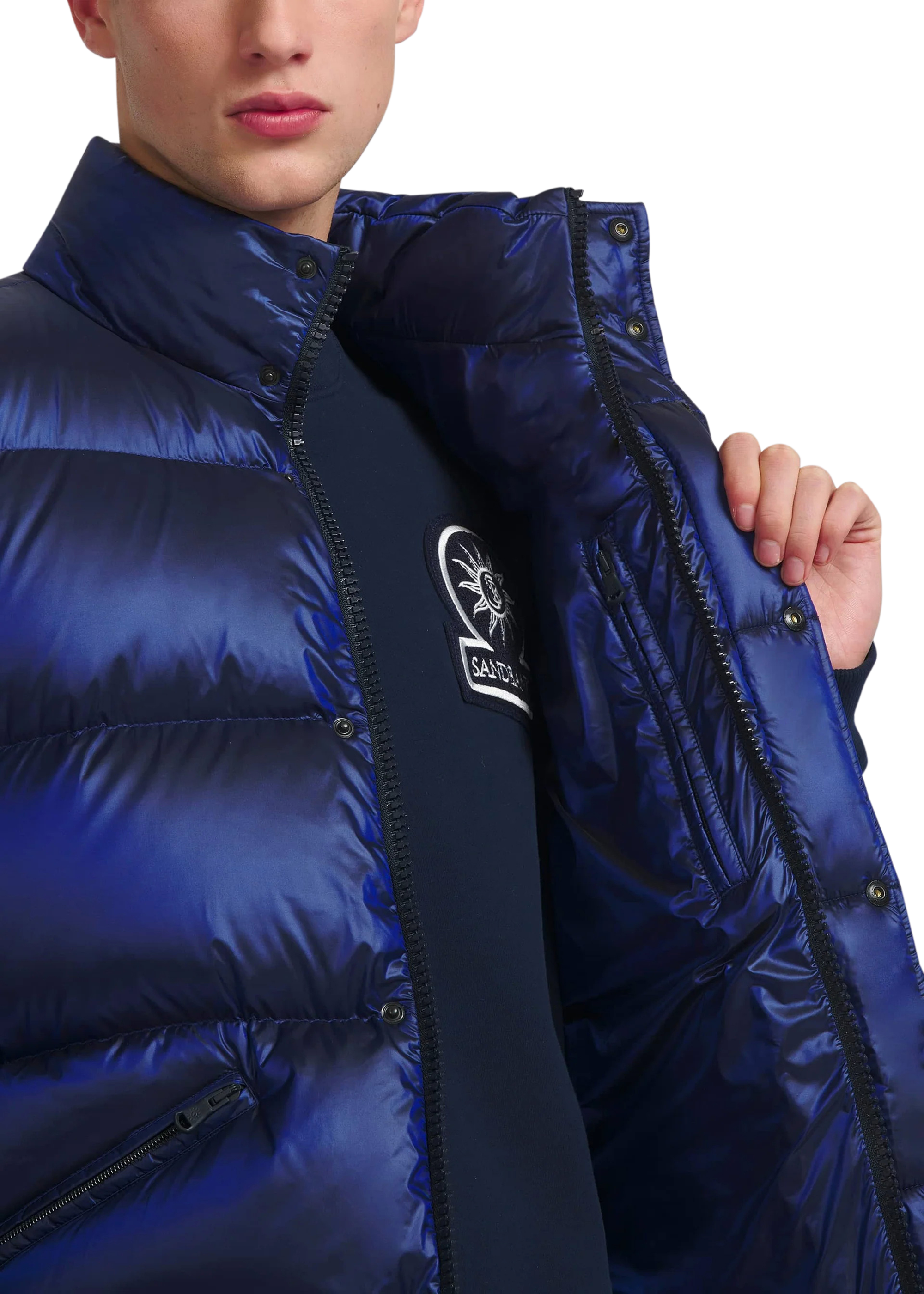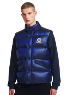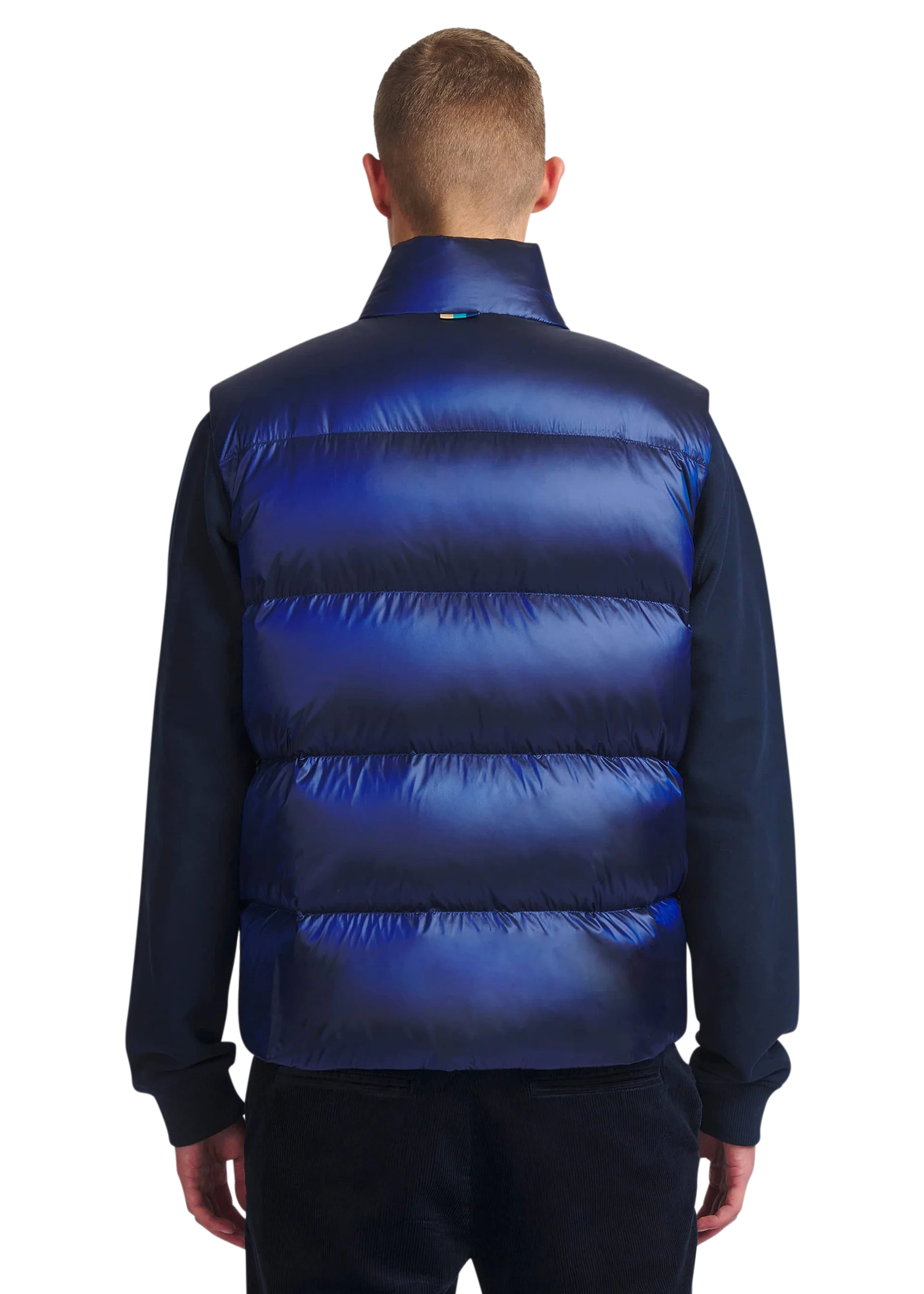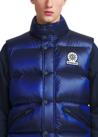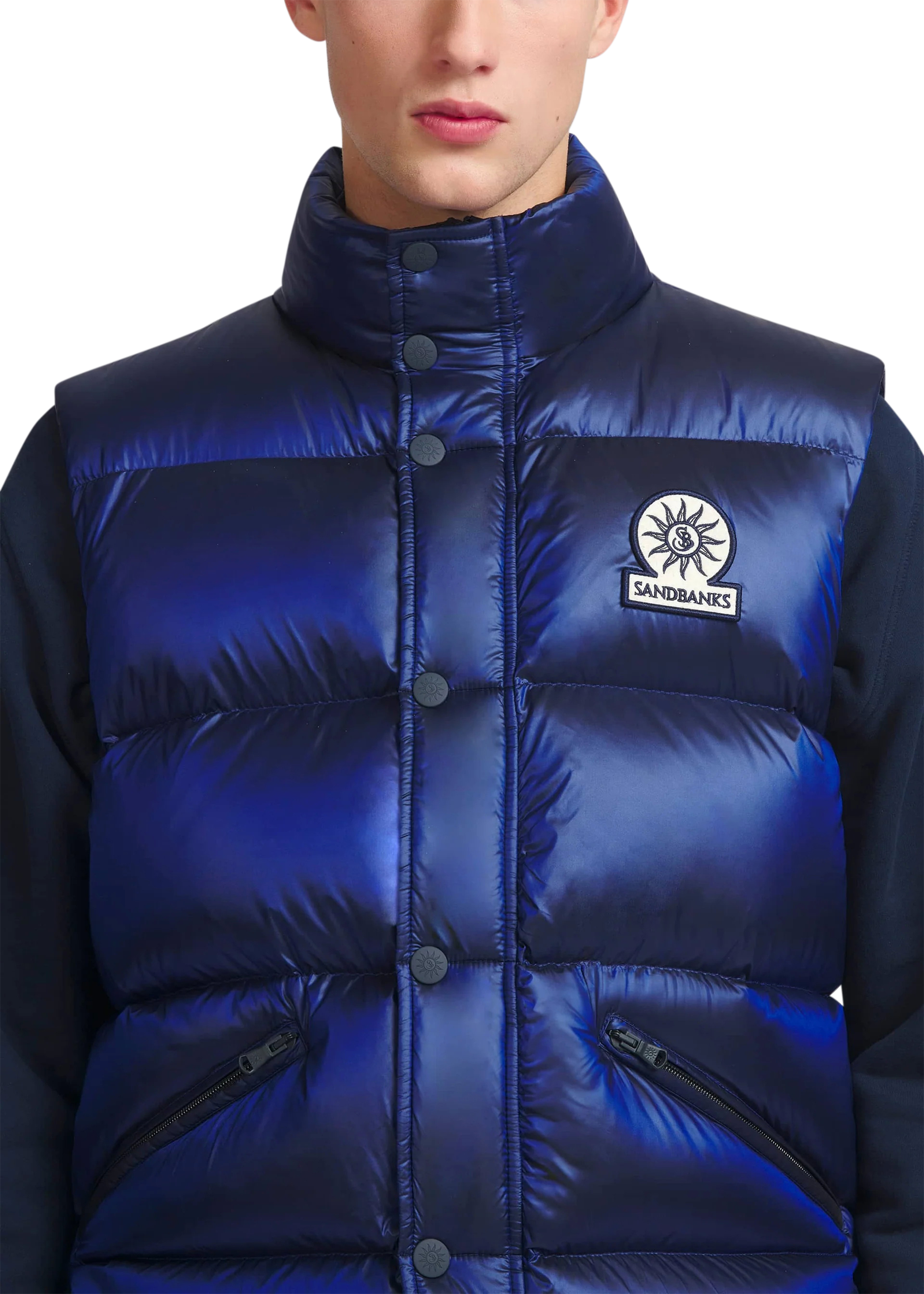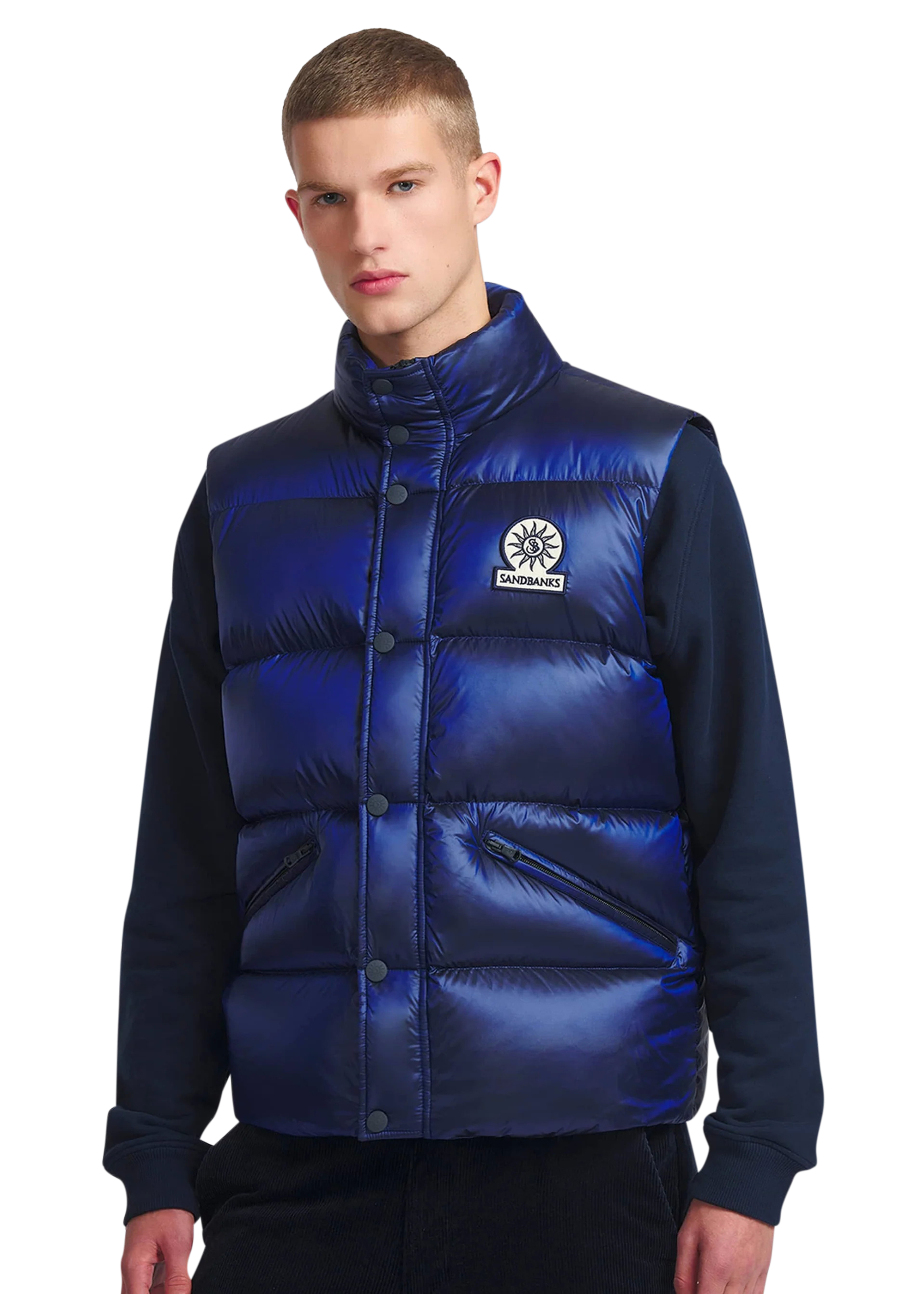 Sandbanks Wide baffle gilet in navy is featured with a navy shine look outer shell fabric made from recycled nylon in Italy, this gilet has has high thermal retention, features Italian luxury tonal rubberised Lampo zips and engraved Sandbanks components.