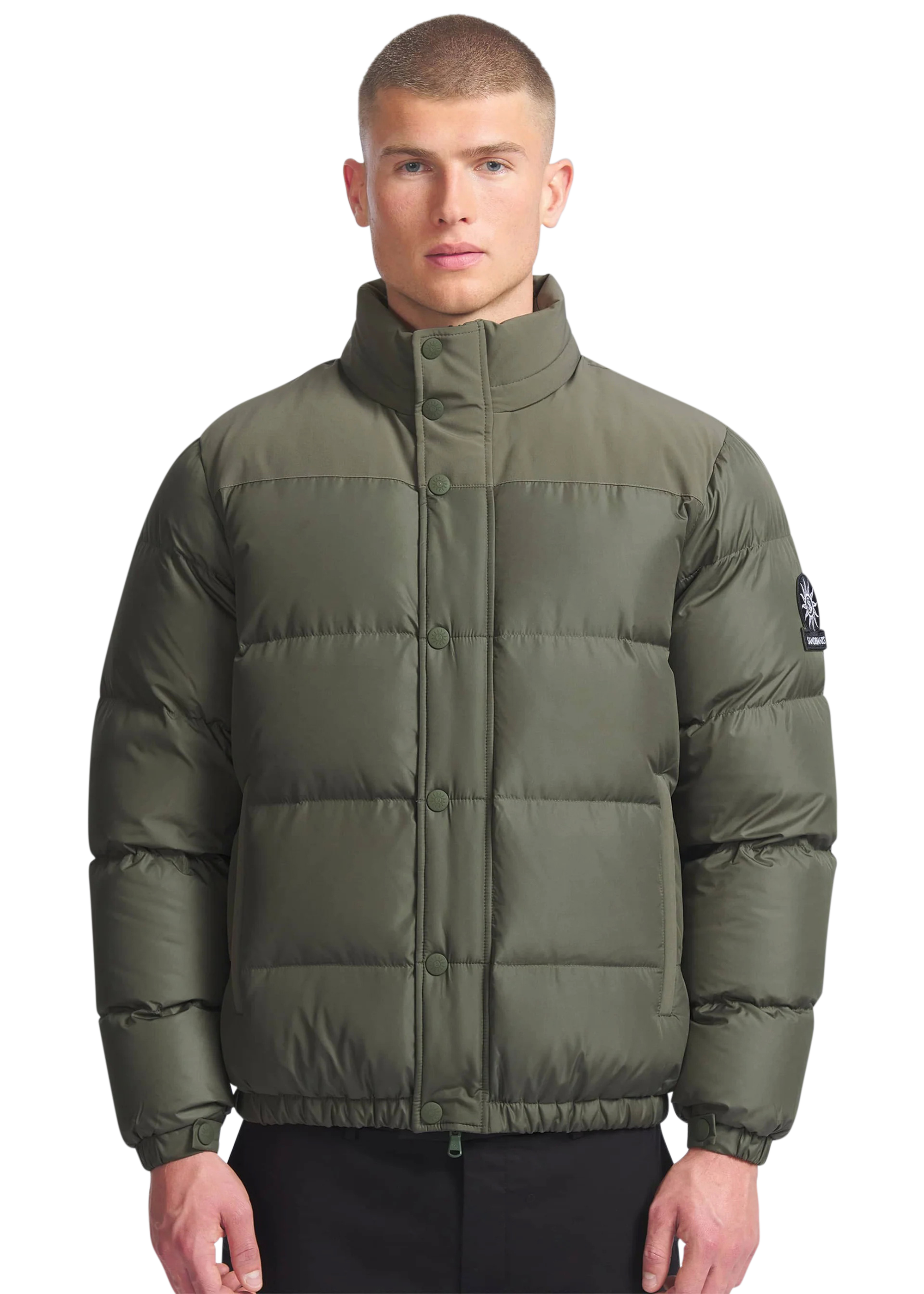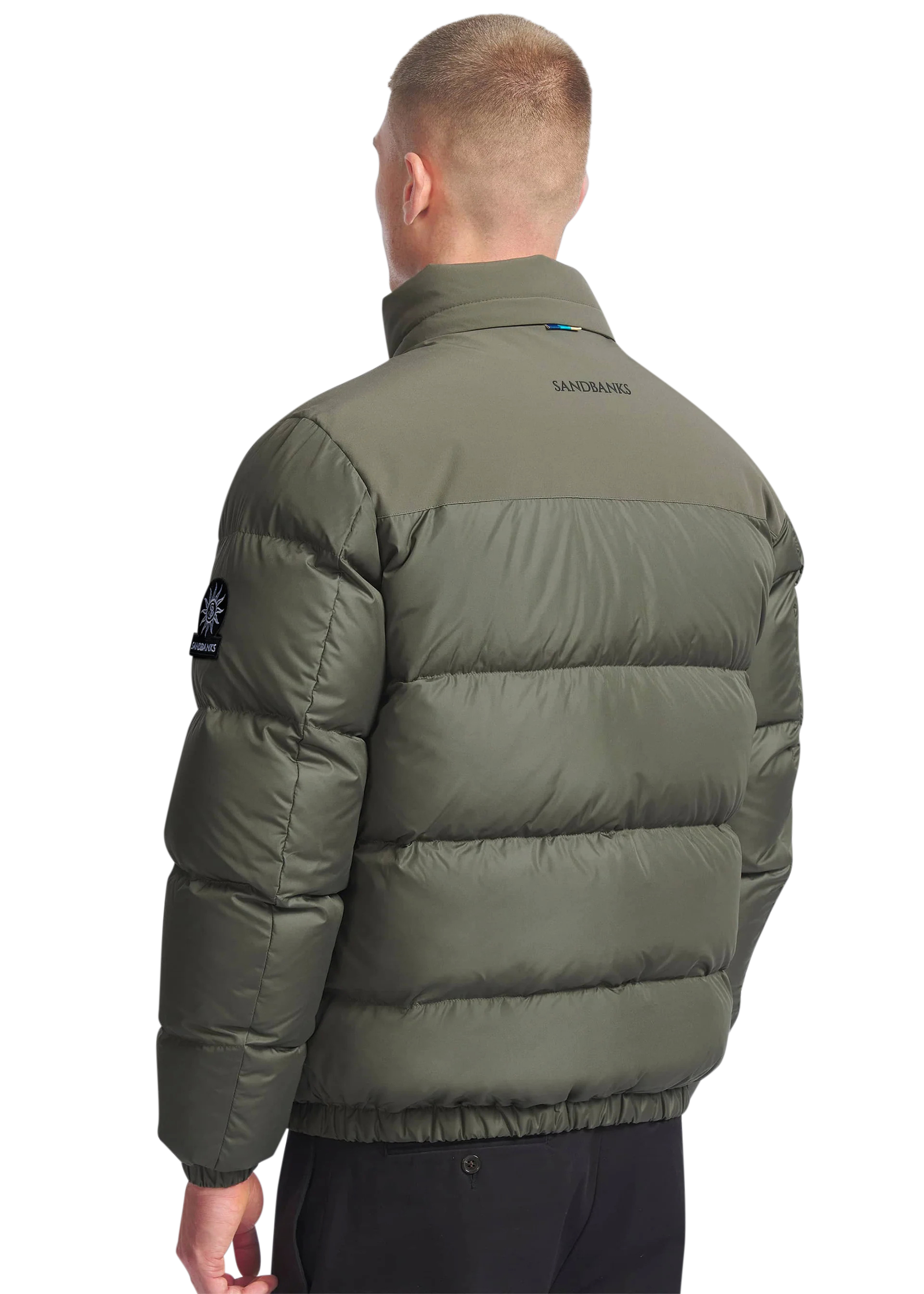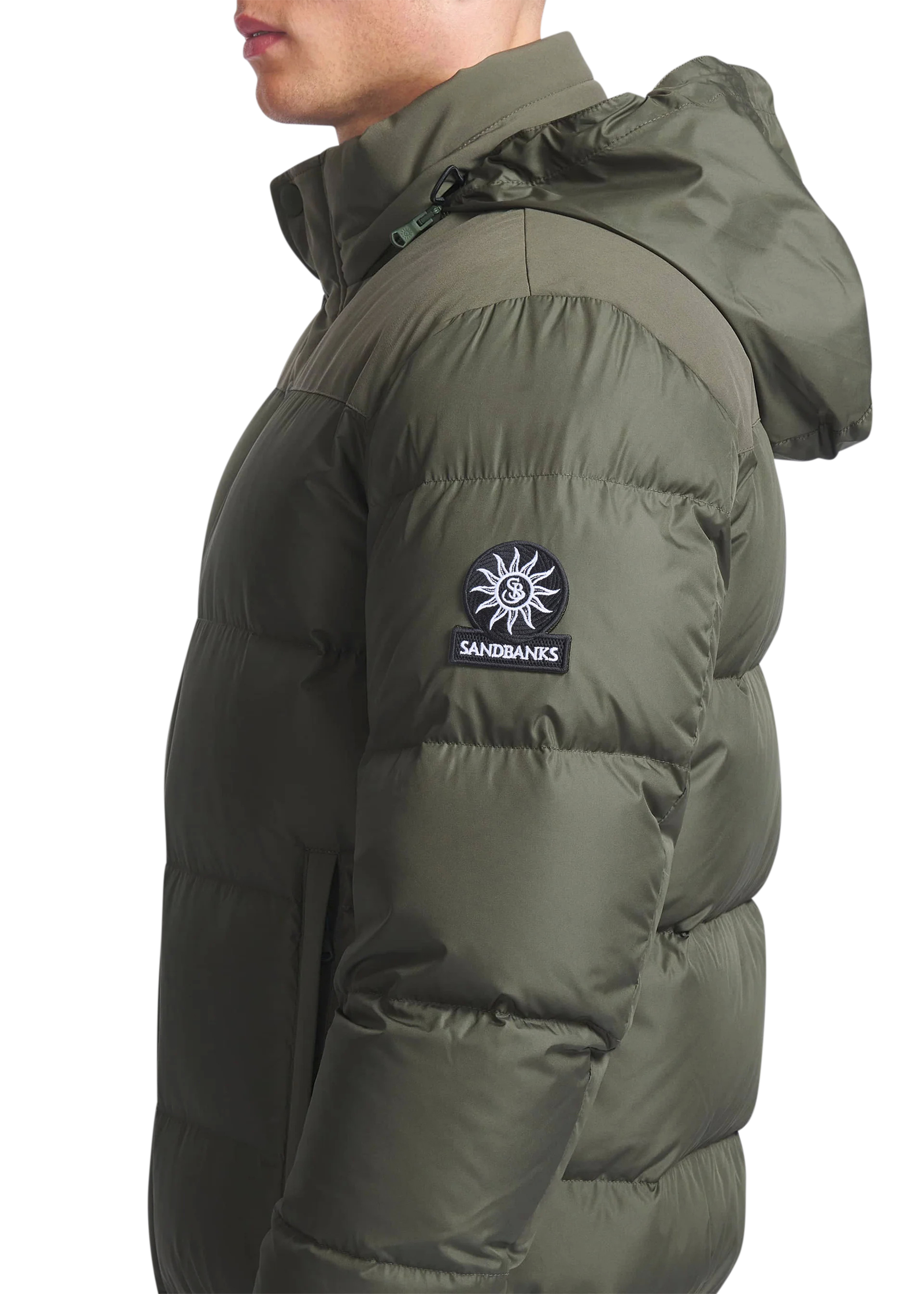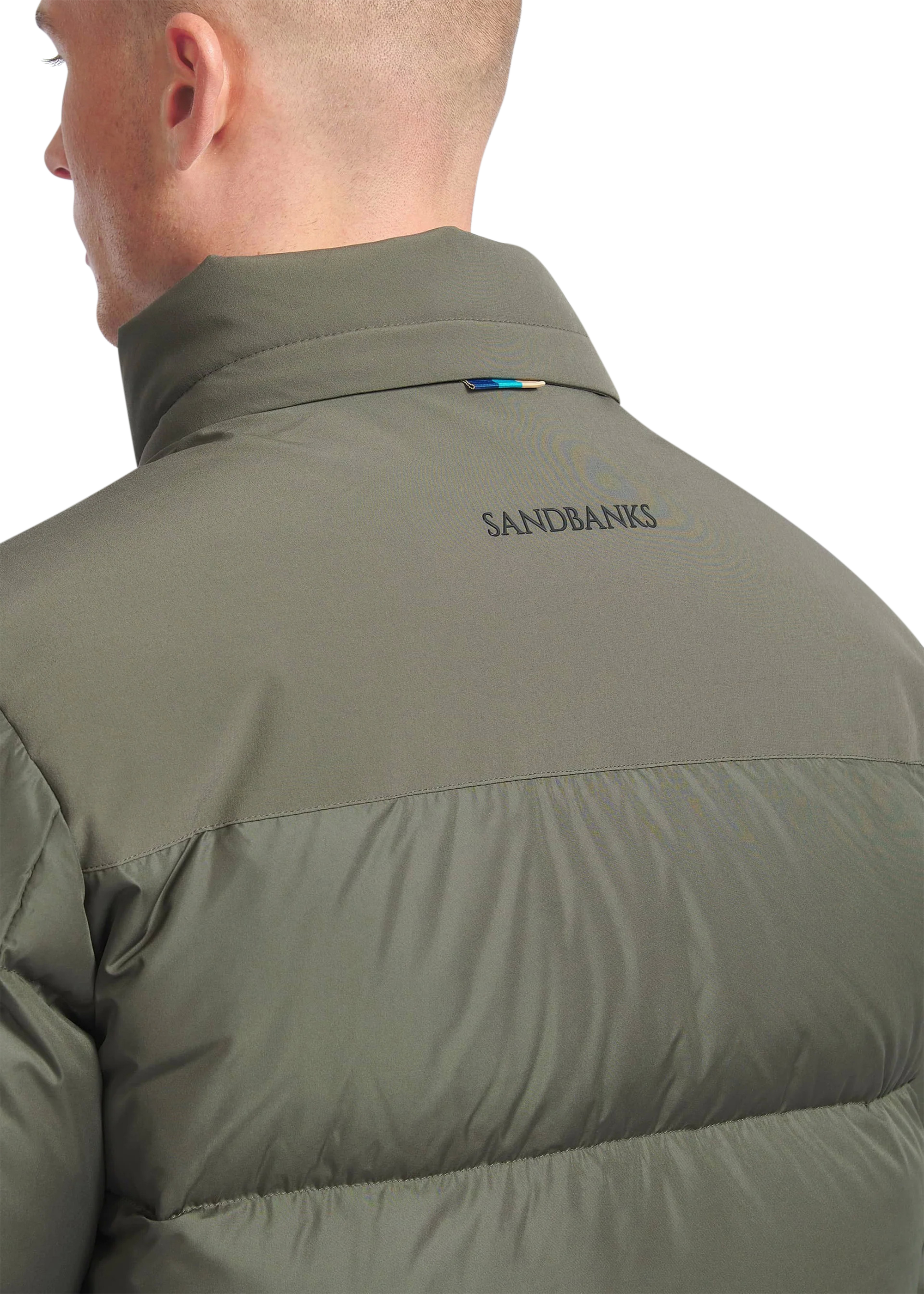 Online exclusive - the Sandbanks Peninsula puffer jacket in khaki. This light weight Sandbanks puffer jacket features a felt and embroidered logo badge, tonal rubberised buttons, Lampo 2-way zip with rubberised pullers, contrast shoulder/collar, Sandbanks rear logo details and zip out hood.