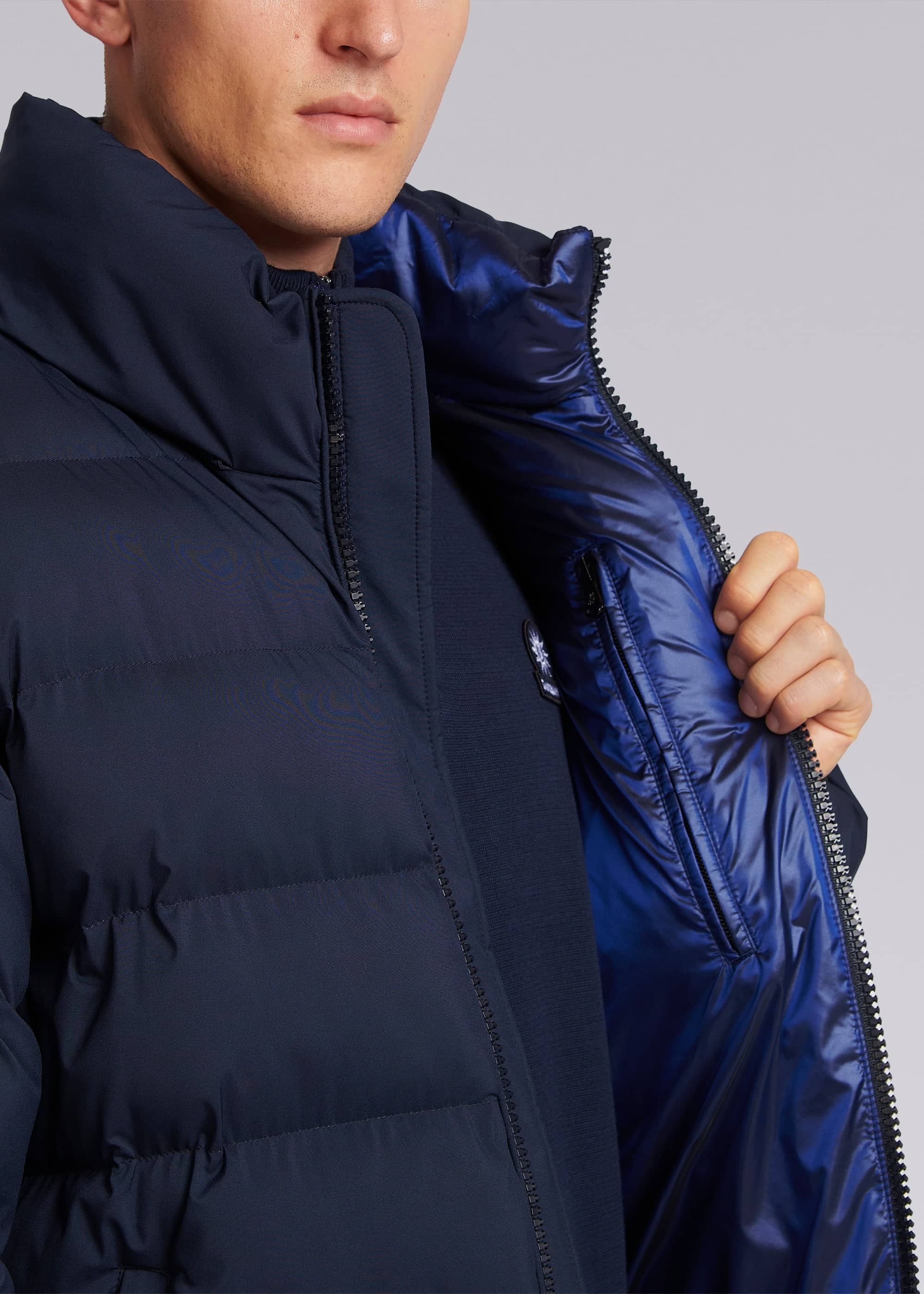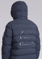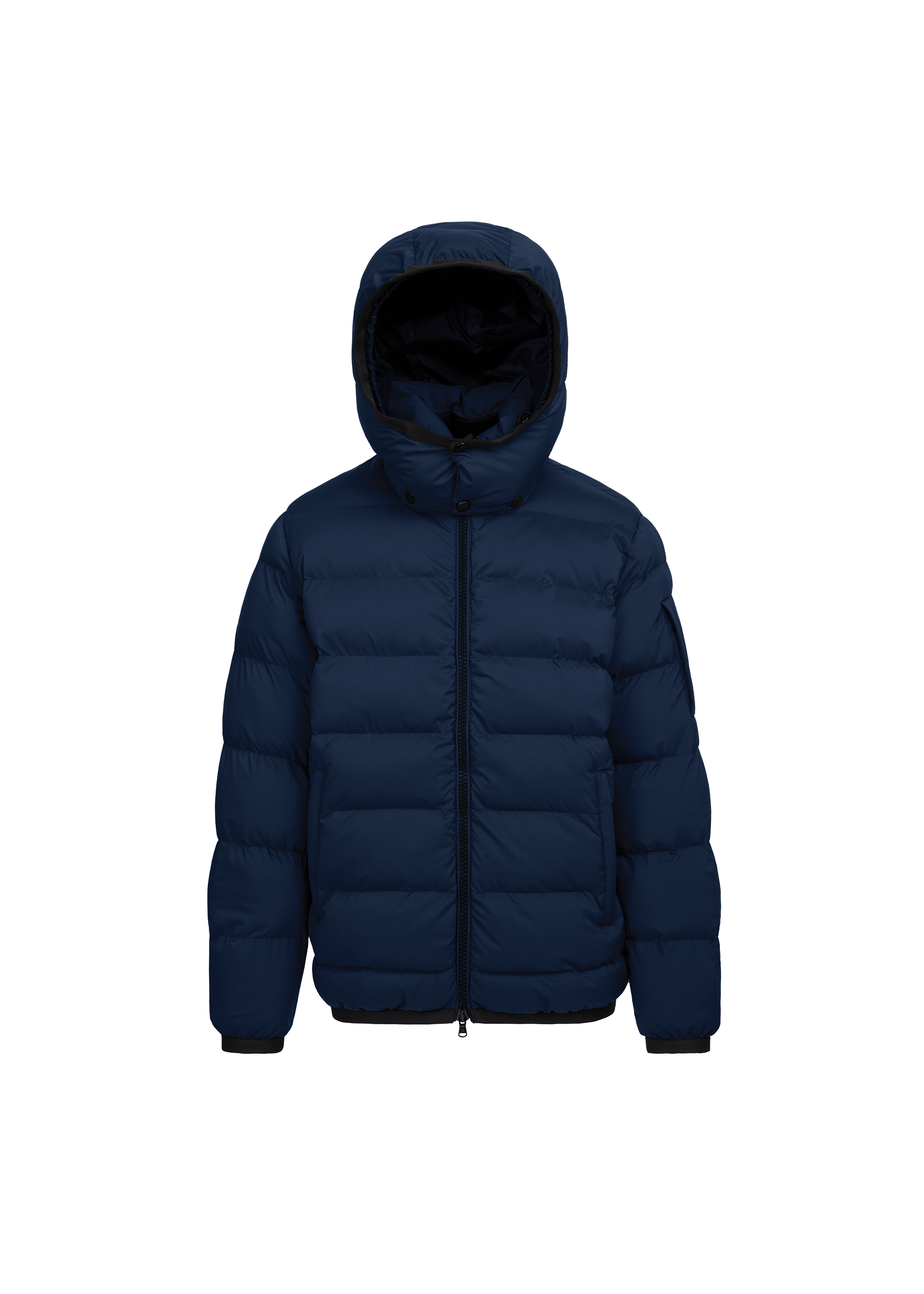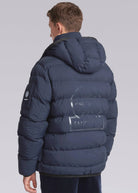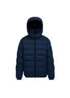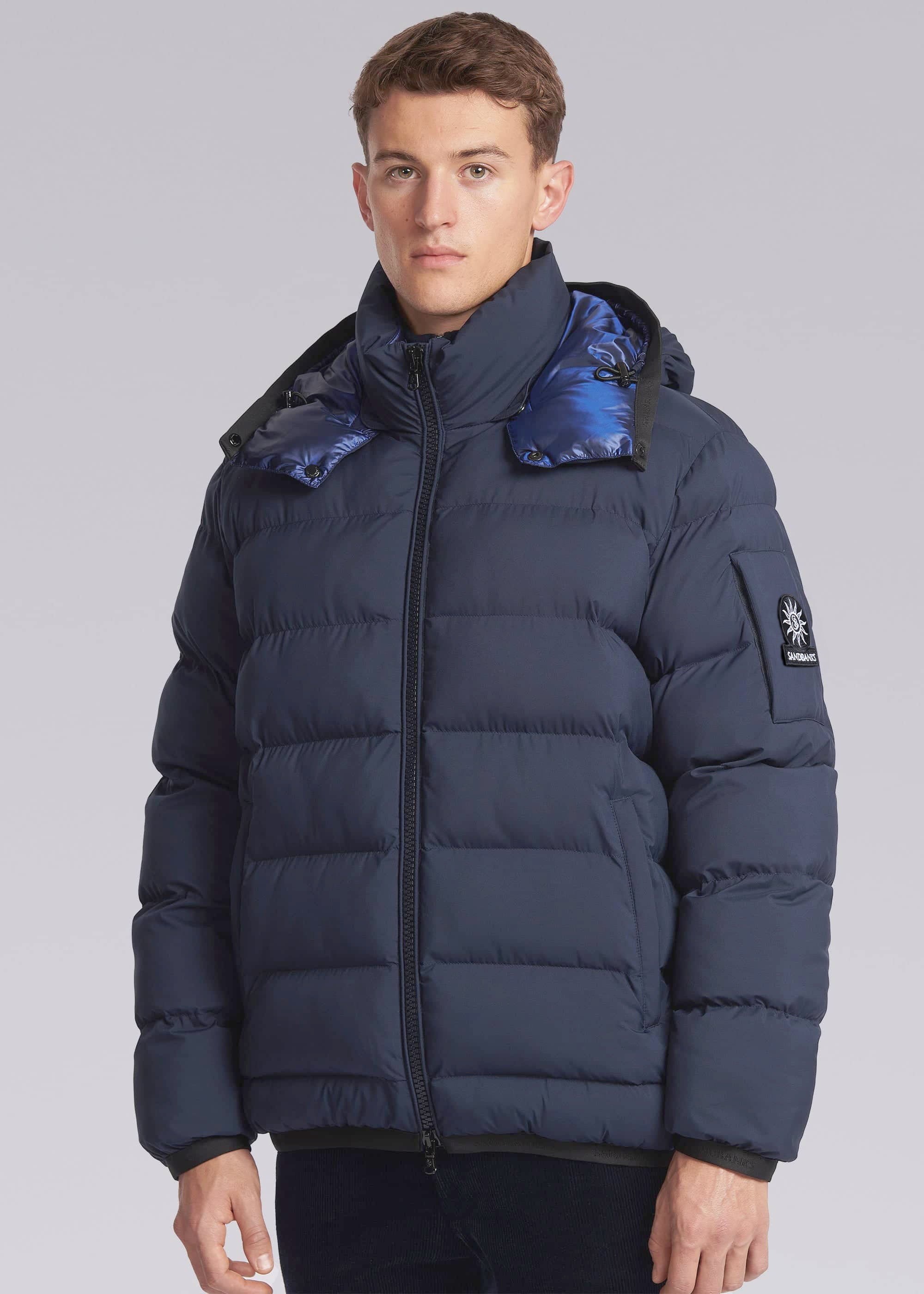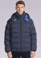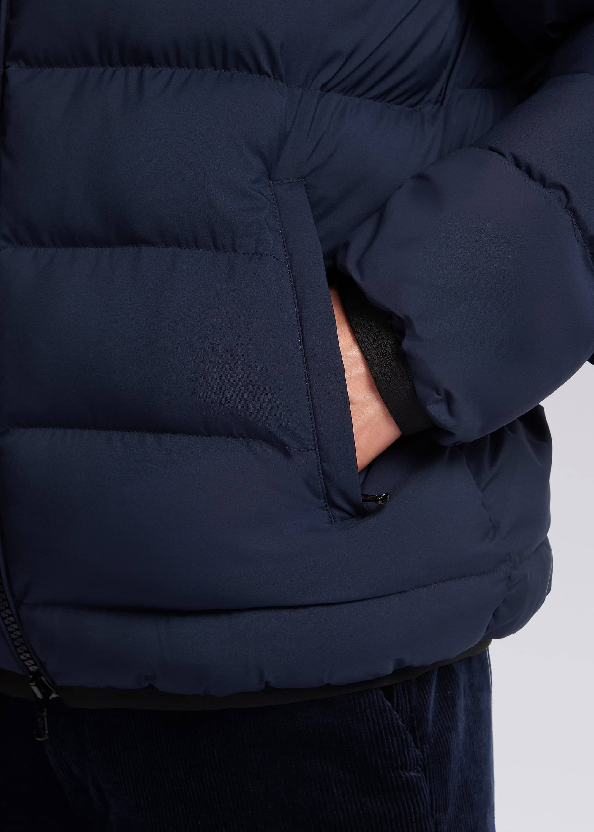 The Sandbanks shore hooded logo printed puffer, a light weight short puffer jacket, constructed from a technical soft shell water resistant navy fabric and lined with a silky high shine fabric for comfort. Featuring a rear tonal logo print, branded black elasticated cuff, hem and hood, black enamel components, side fleece lined zip pockets, patch sleeve zip pocket with a contrast felt/rubber badge.