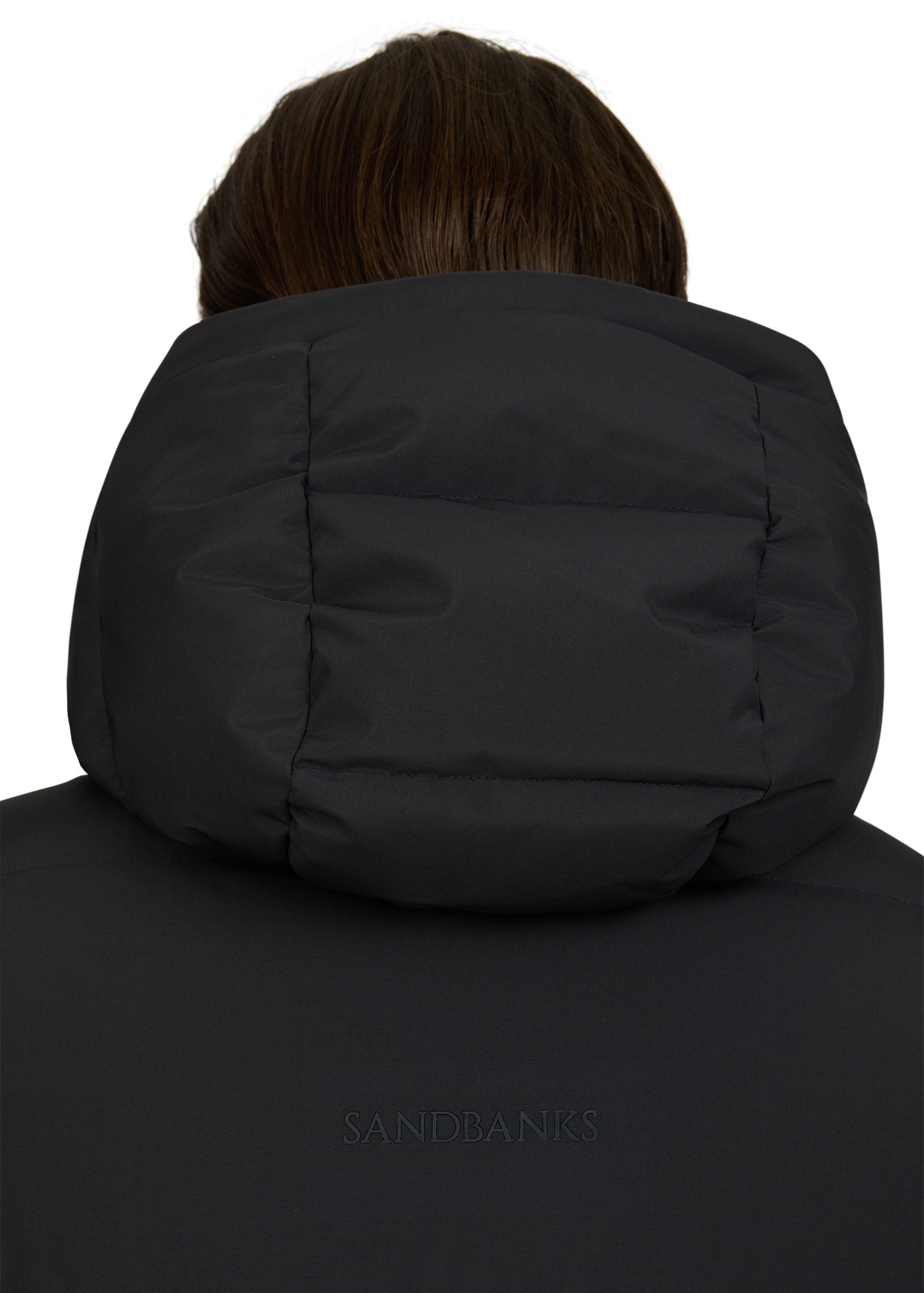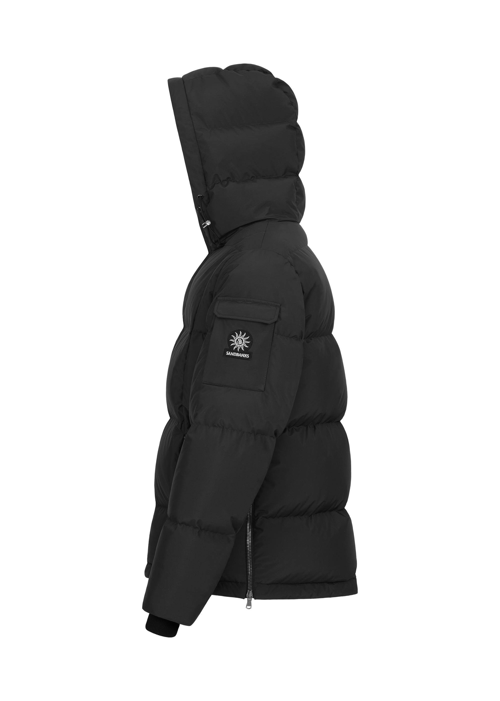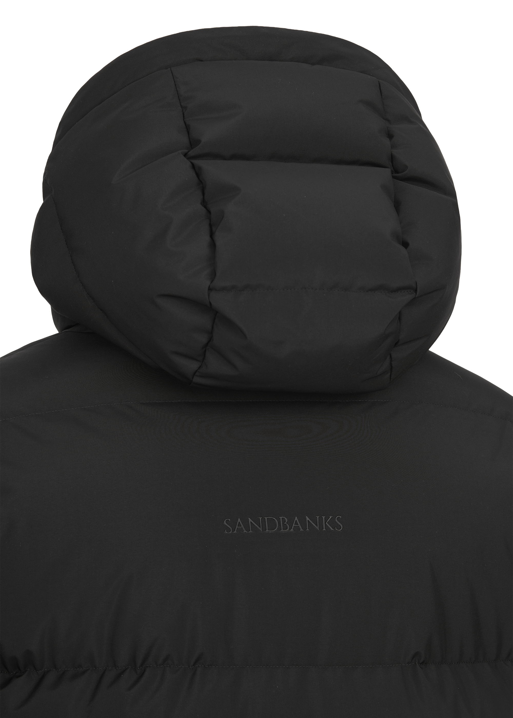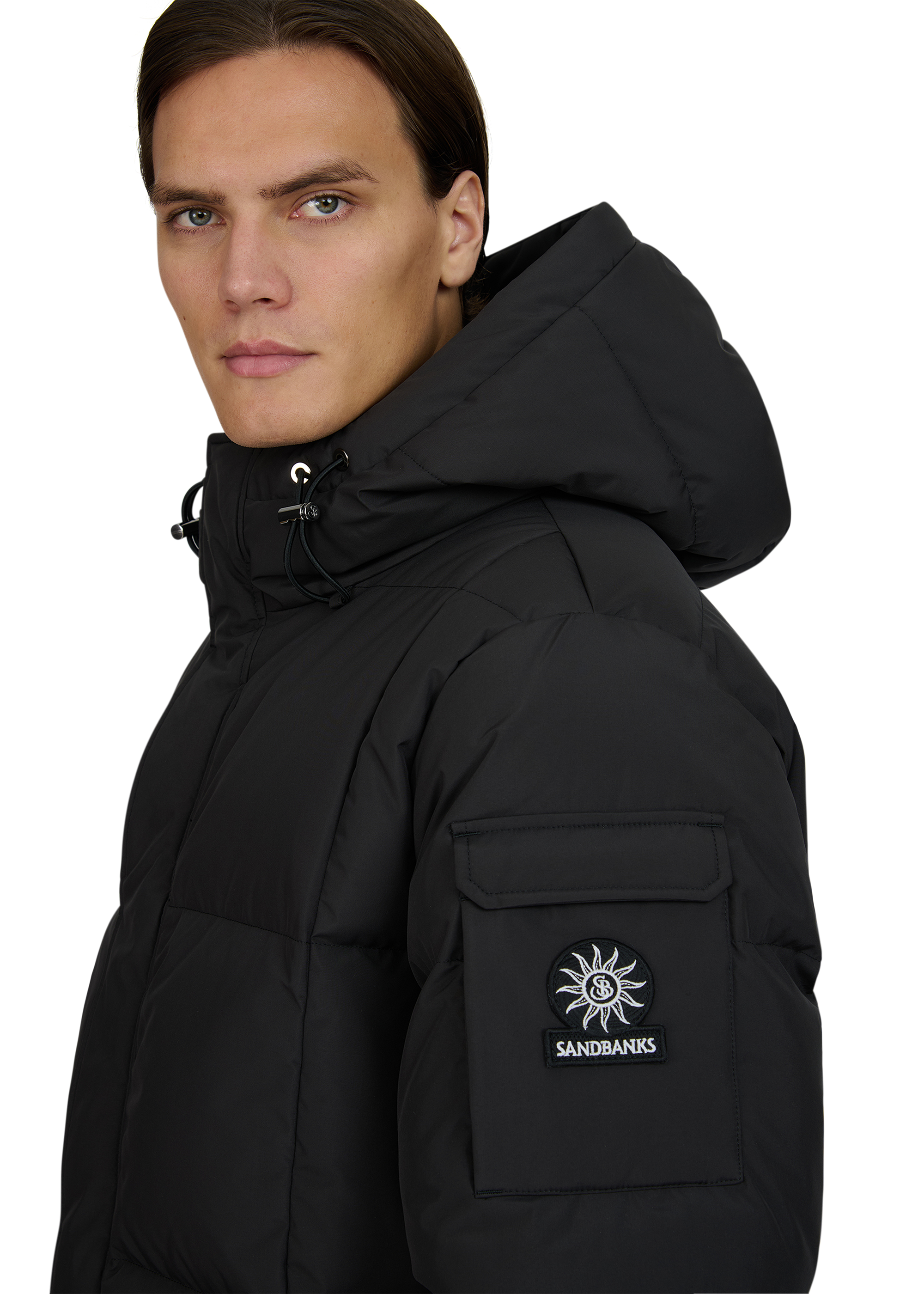 The Sandbanks Alpha Puffer Jacket in charcoal. A modern take on the classic puffer, designed with wide baffles to provide elevated warmth and a streamlined silhouette. Features include a sleeve pocket detailed with an embroidered Sandbanks badge, an integrated hood with cord adjusters, and concealed zip pockets lined with Polartec® fleece for superior comfort and protection.