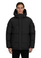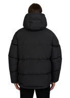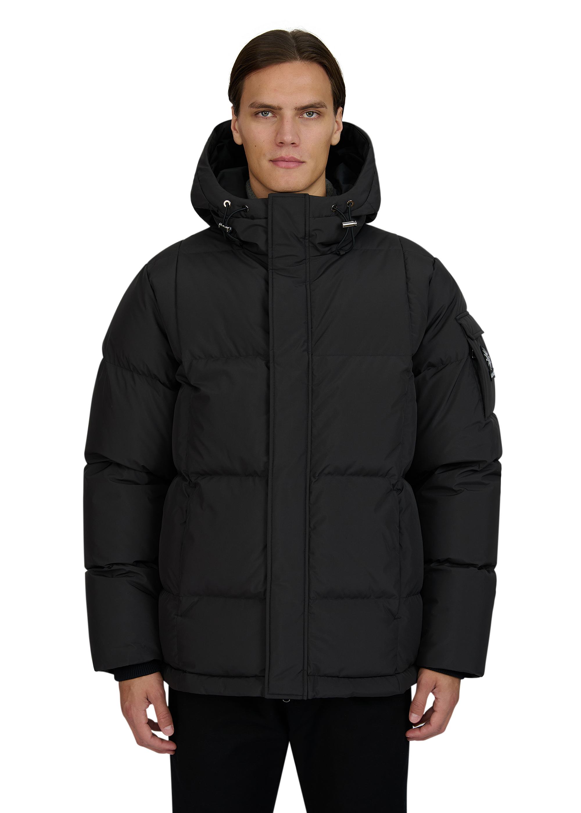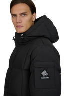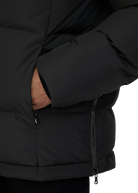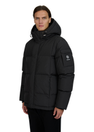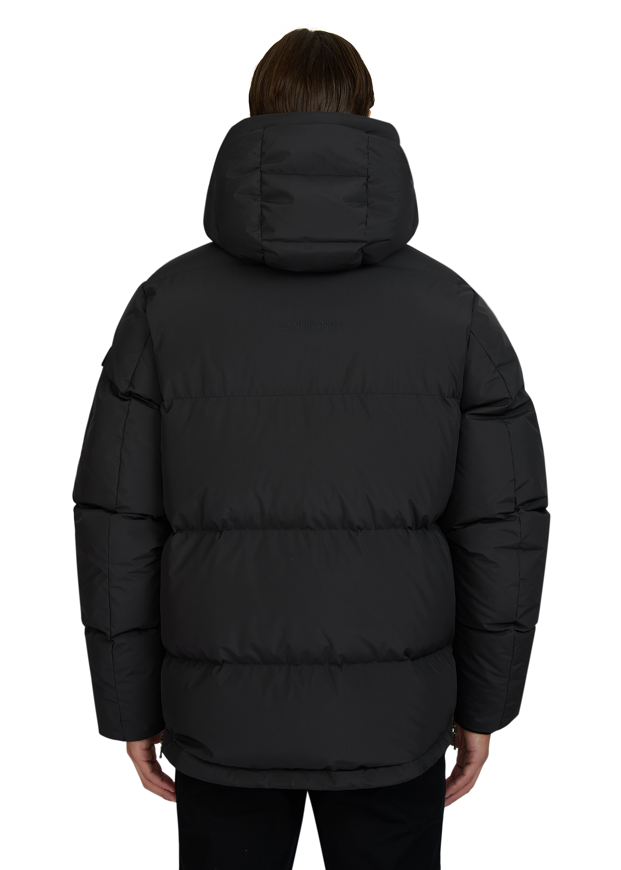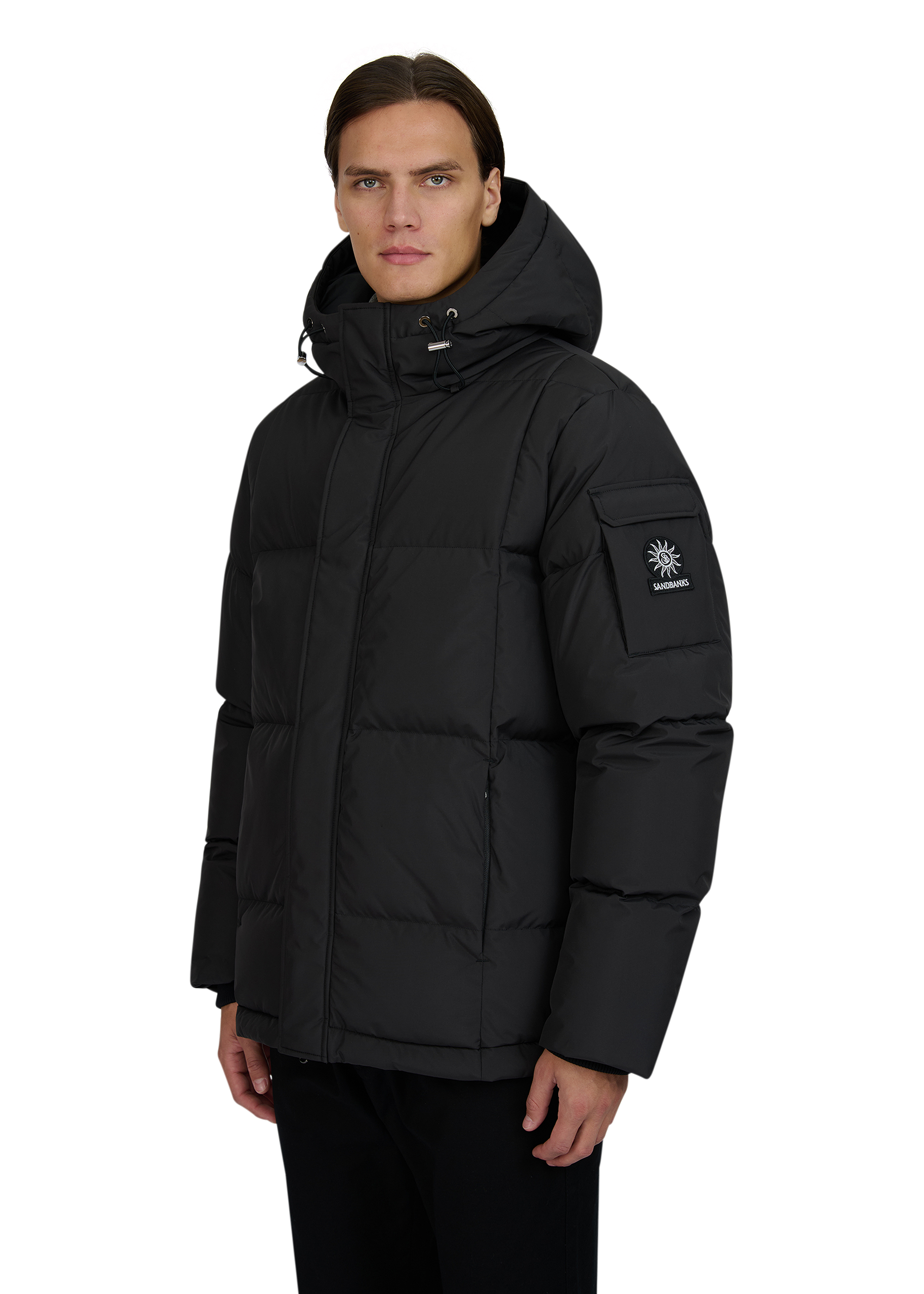The Sandbanks Alpha Puffer Jacket in charcoal. A modern take on the classic puffer, designed with wide baffles to provide elevated warmth and a streamlined silhouette. Features include a sleeve pocket detailed with an embroidered Sandbanks badge, an integrated hood with cord adjusters, and concealed zip pockets lined with Polartec® fleece for superior comfort and protection.