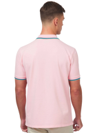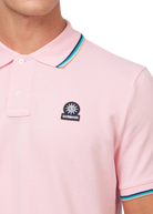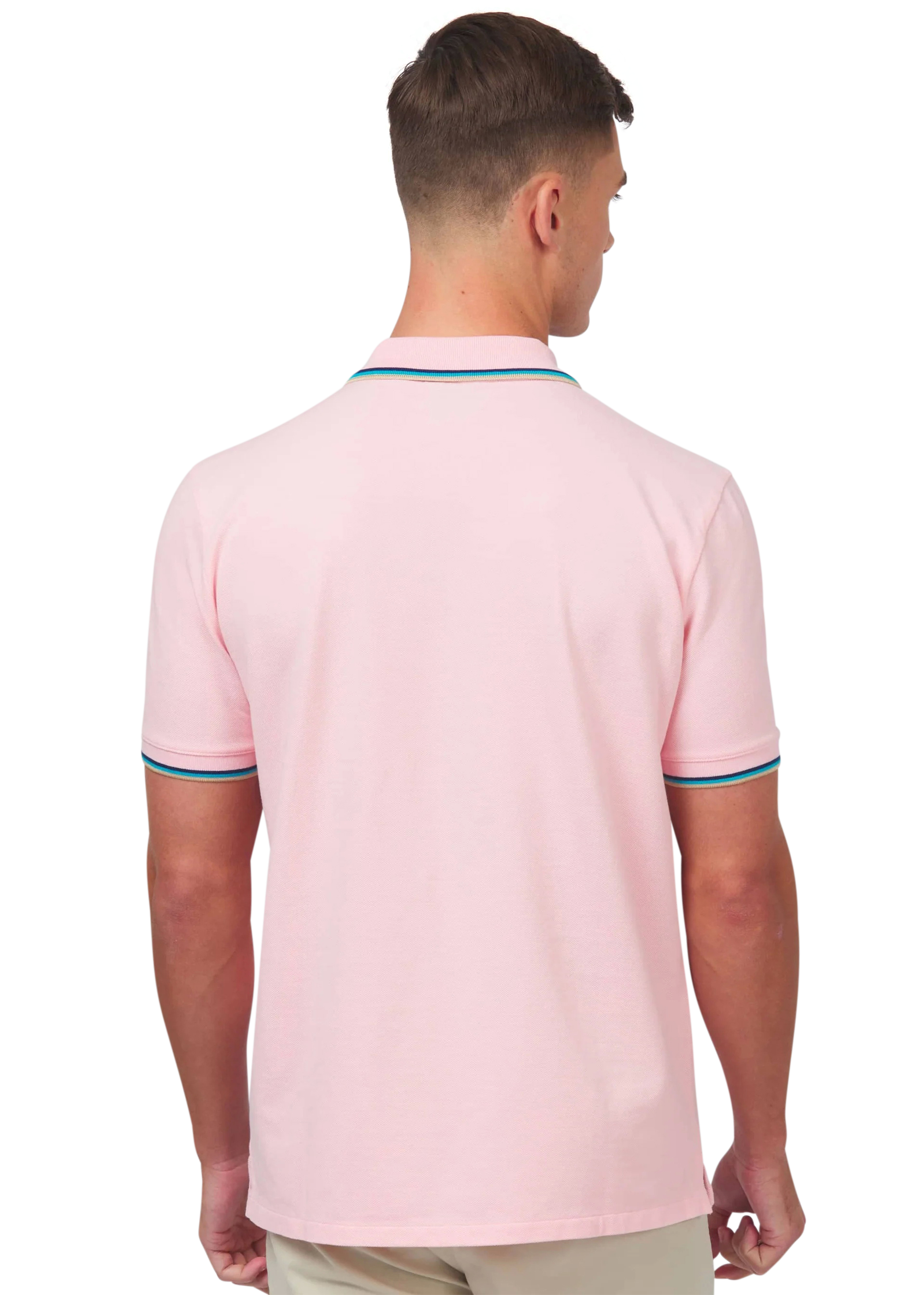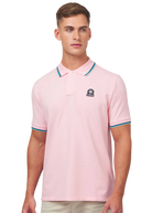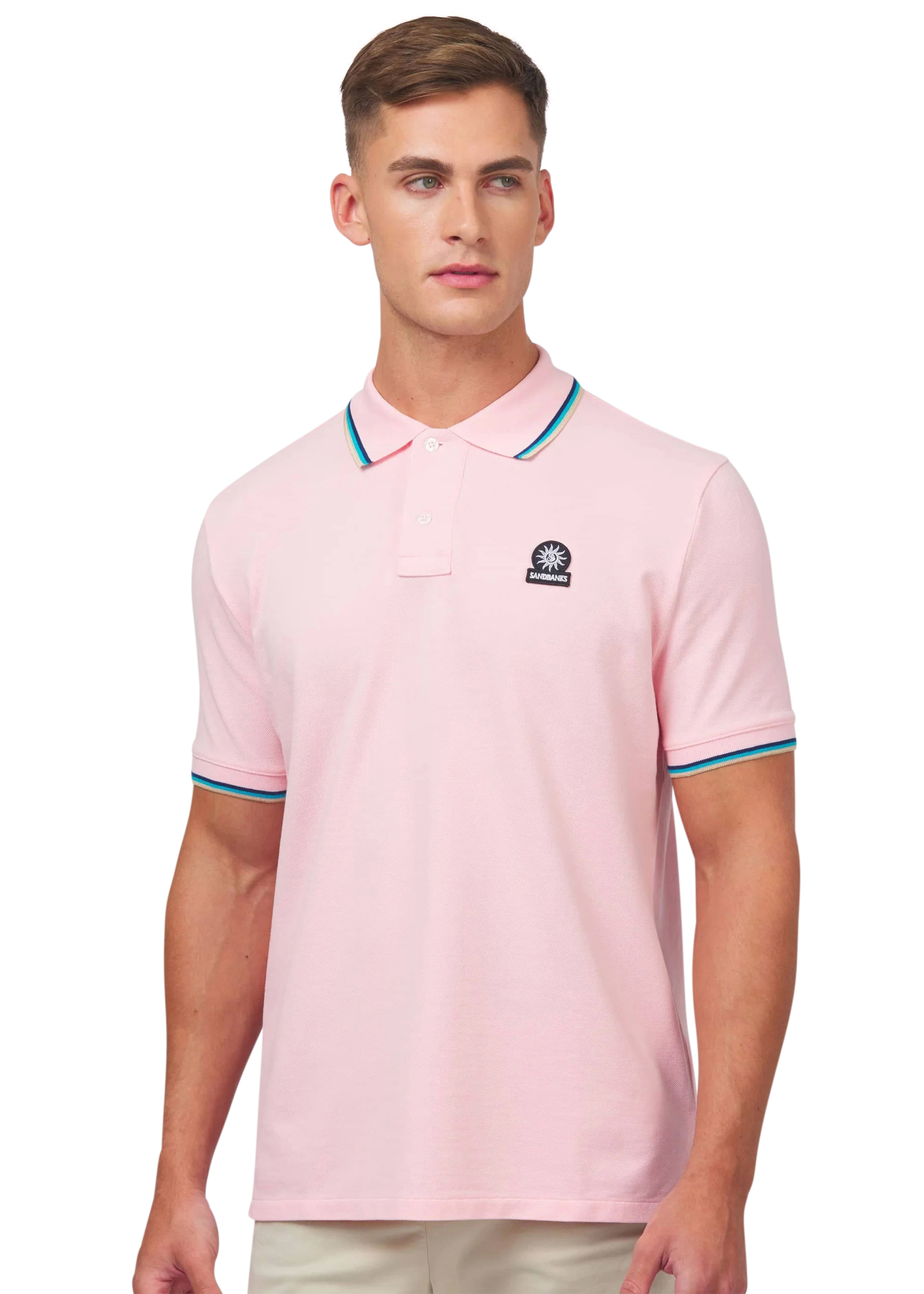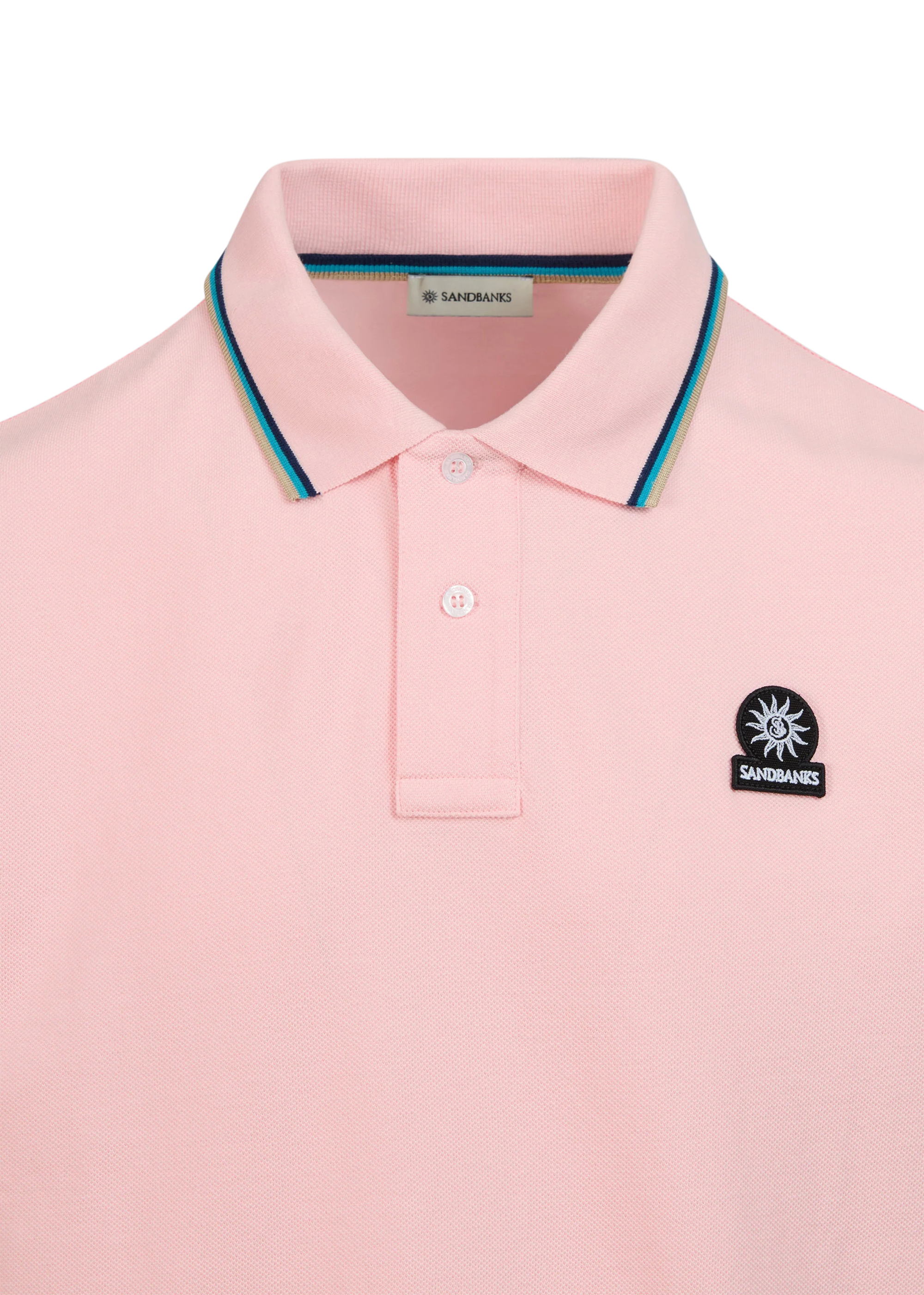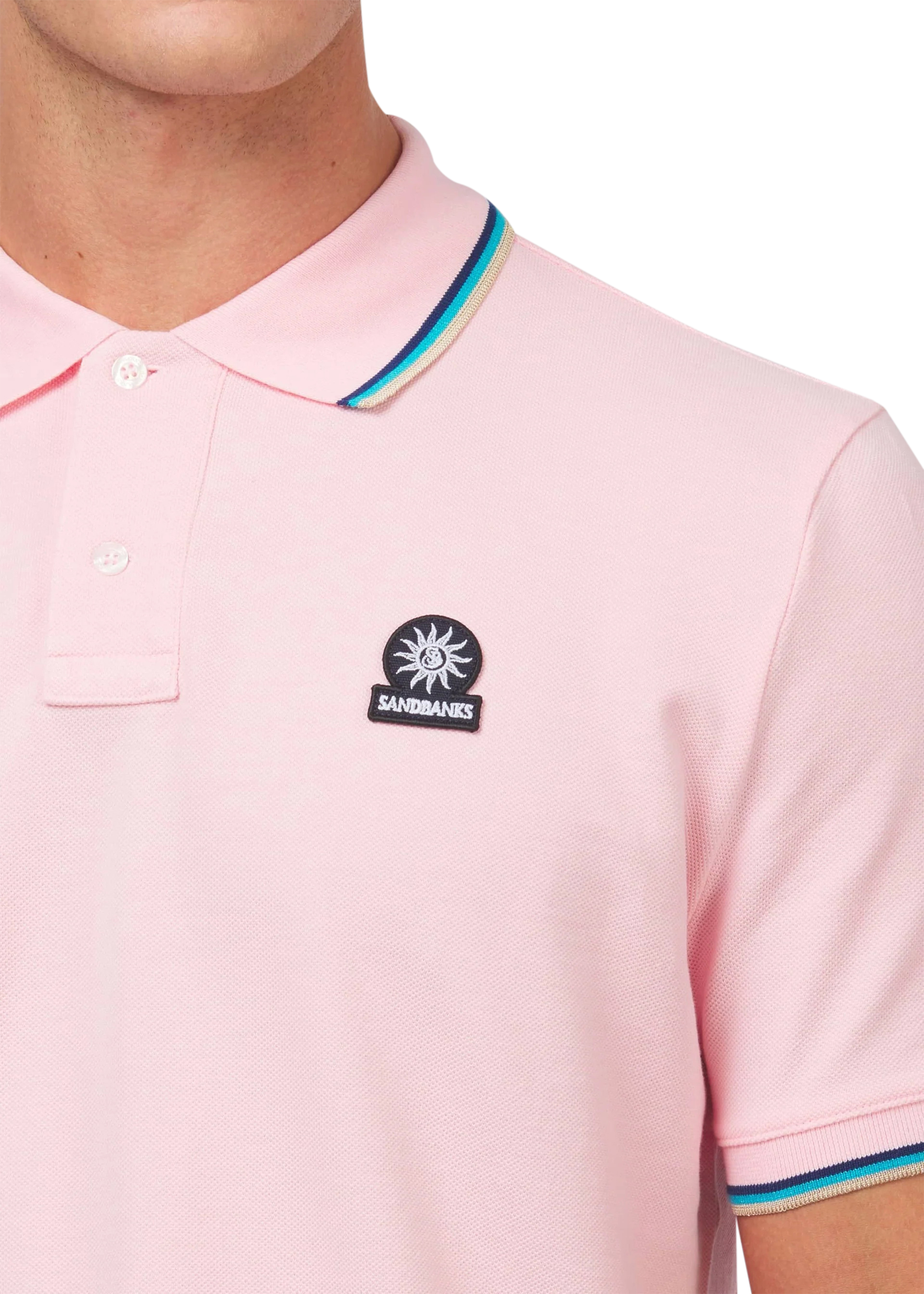 Sandbanks men's badge logo polo shirt in crystal rose, made from 100% organic cotton. This classic fitting 2 button polo shirt features an embroidered badge logo on the chest, tri-colour tipped ribbed collar, cuff and back neck binding.