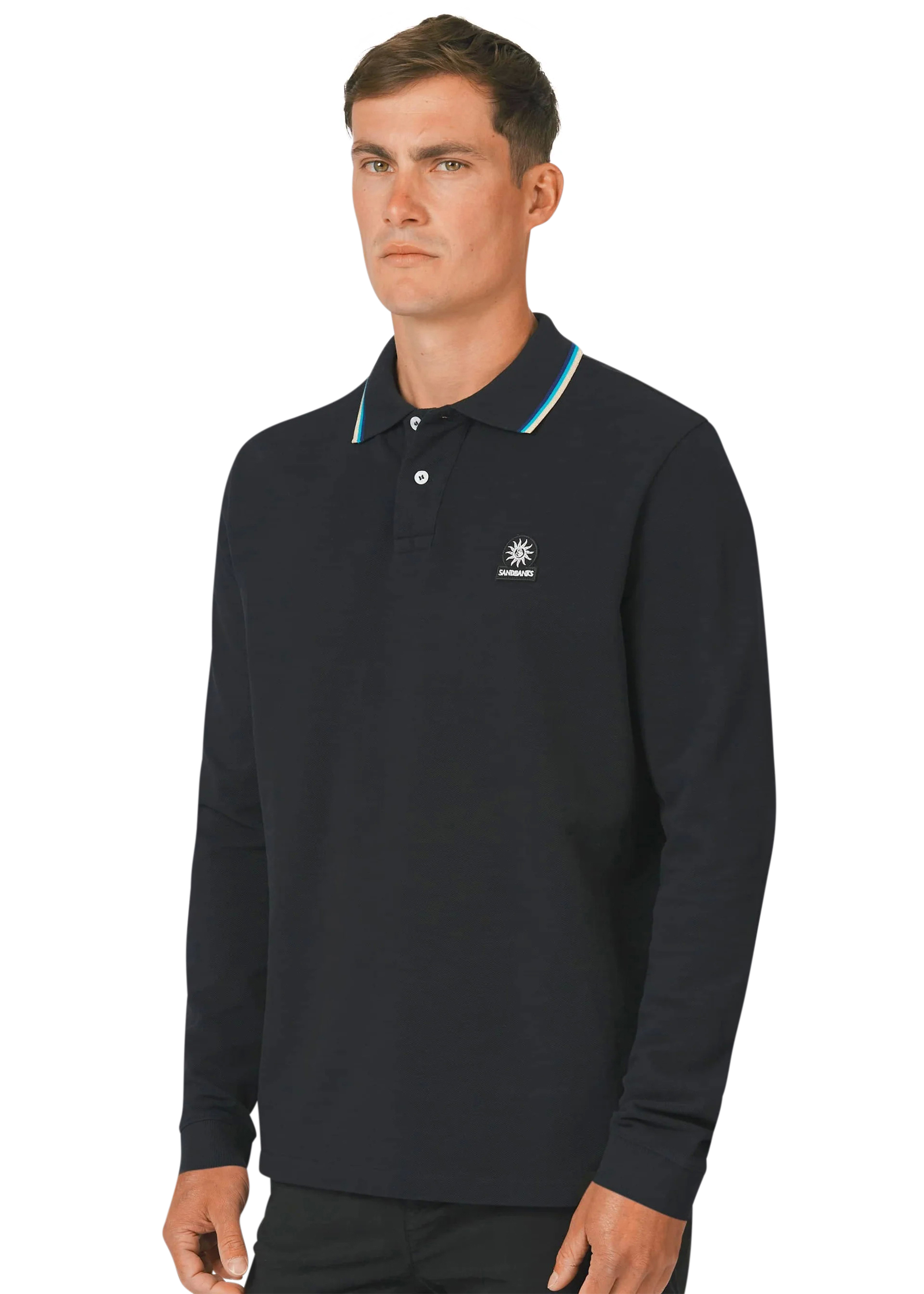 Sandbanks men's badge logo long sleeve polo shirt in black, made from 100% organic cotton. This classic fitting 2 button polo shirt features an embroidered badge logo on the chest, tri-colour tipped ribbed collar, cuff and back neck binding.