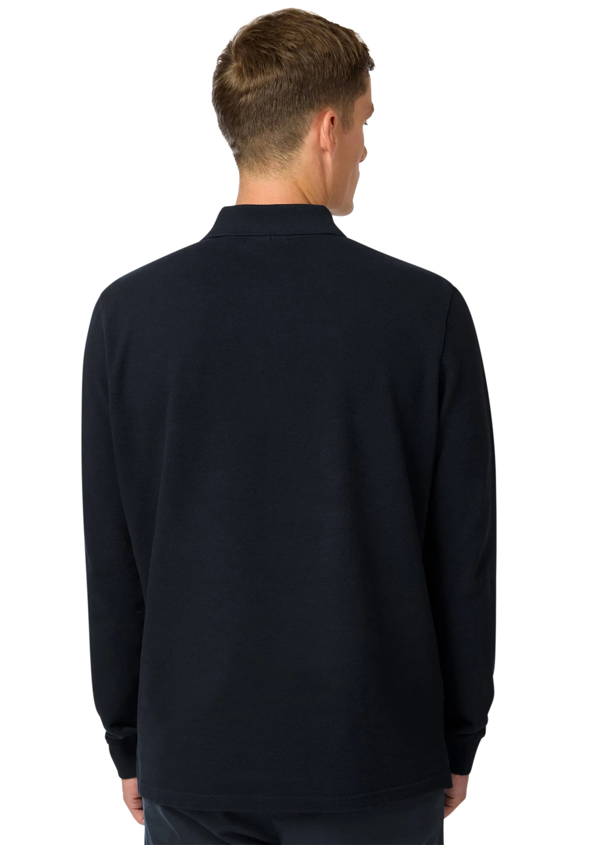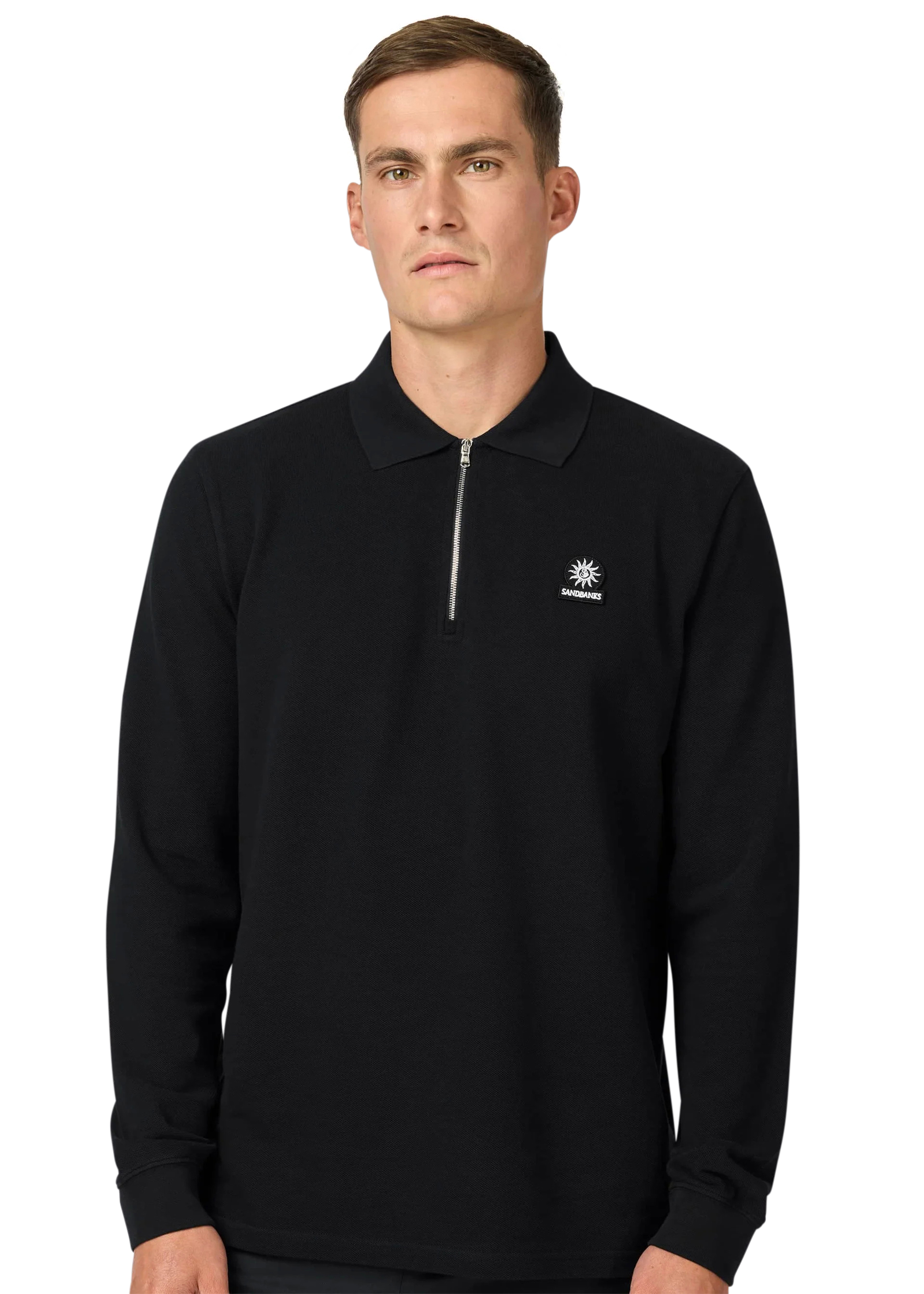 Sandbanks men's badge logo long sleeve polo shirt in black, made from 100% organic cotton. This classic fitting zip polo shirt features an embroidered badge logo on the chest, tri-colour tipped ribbed collar, cuff and back neck binding