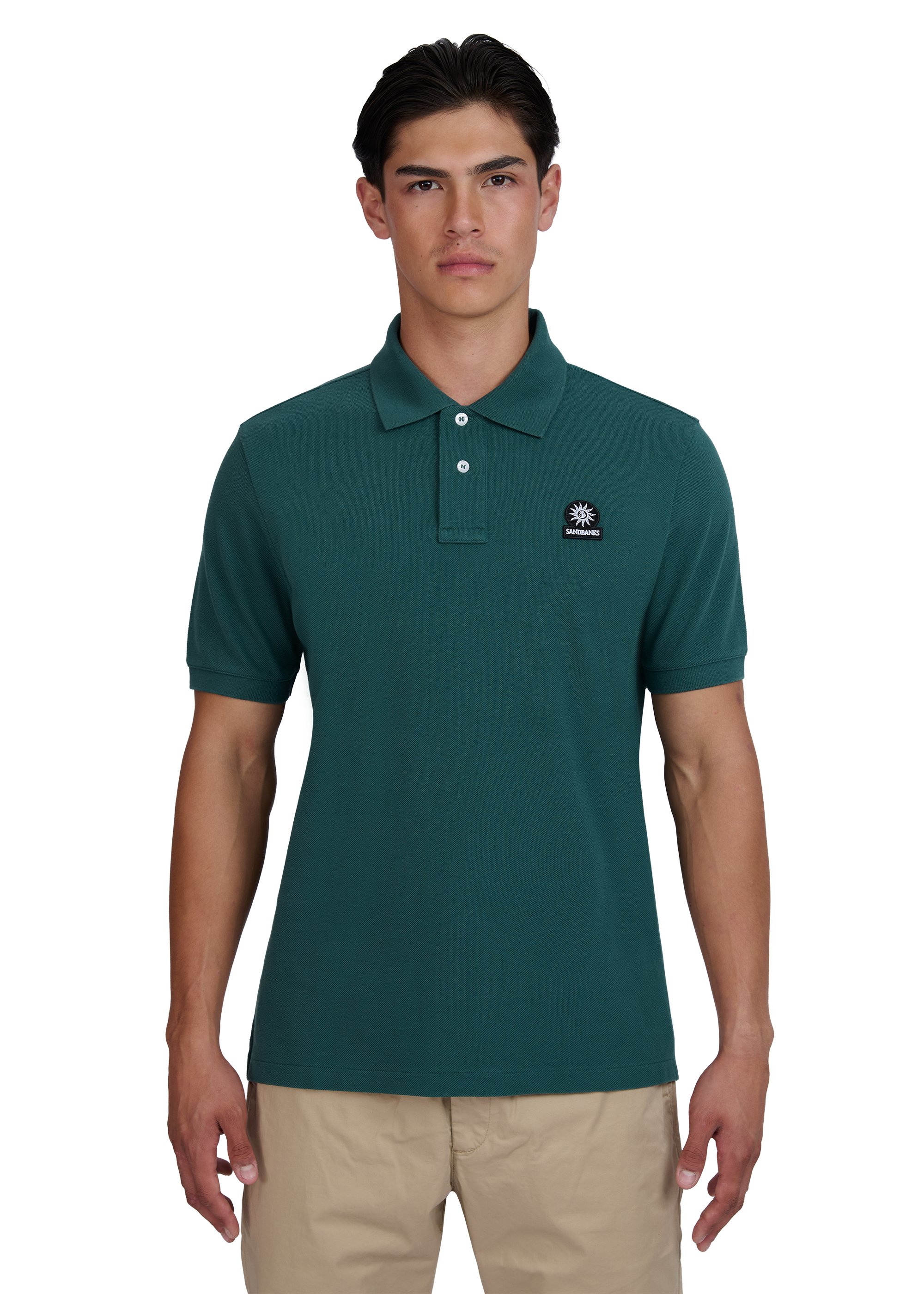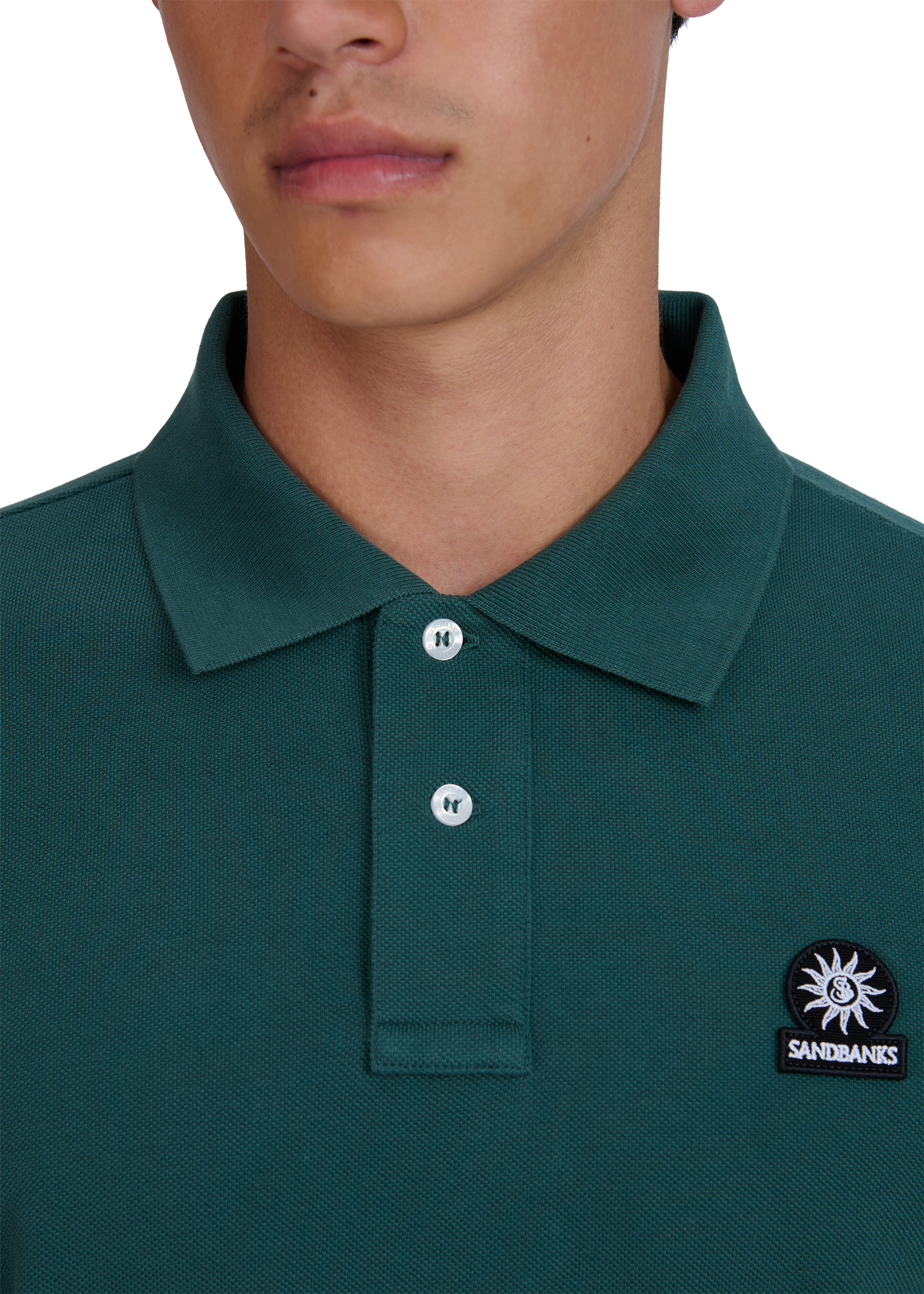 Sandbanks men's badge logo polo shirt in emerald green, made from 100% mercerised organic cotton. This classic fitting 2 button polo shirt features an embroidered badge logo on the chest, ribbed collar and cuff, and tri-colour back neck binding.