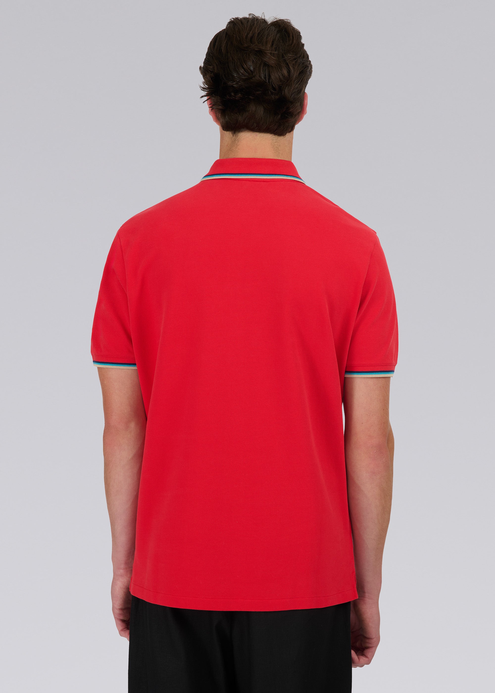• Tri-colour tipped collar, cuff and back neck binding