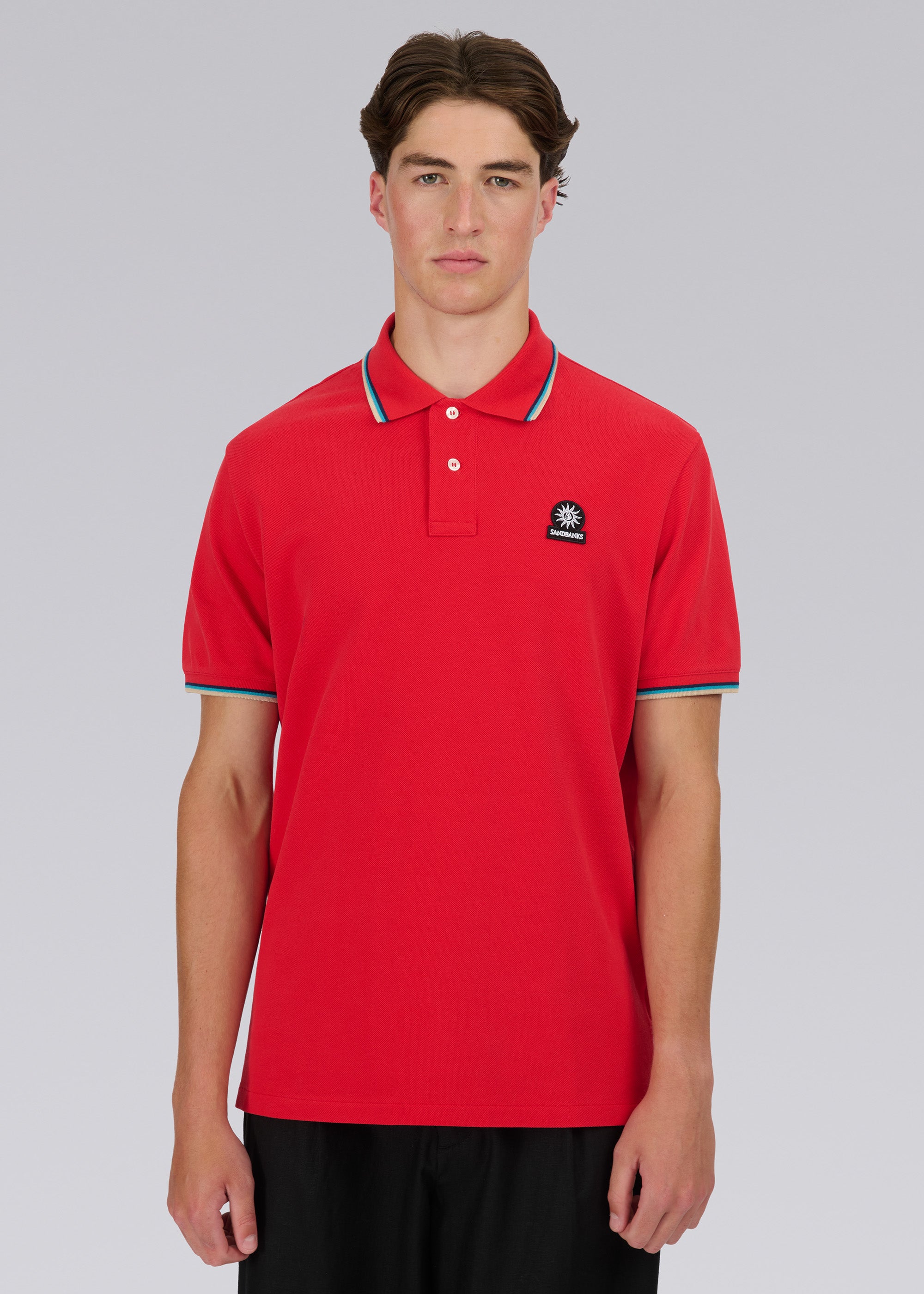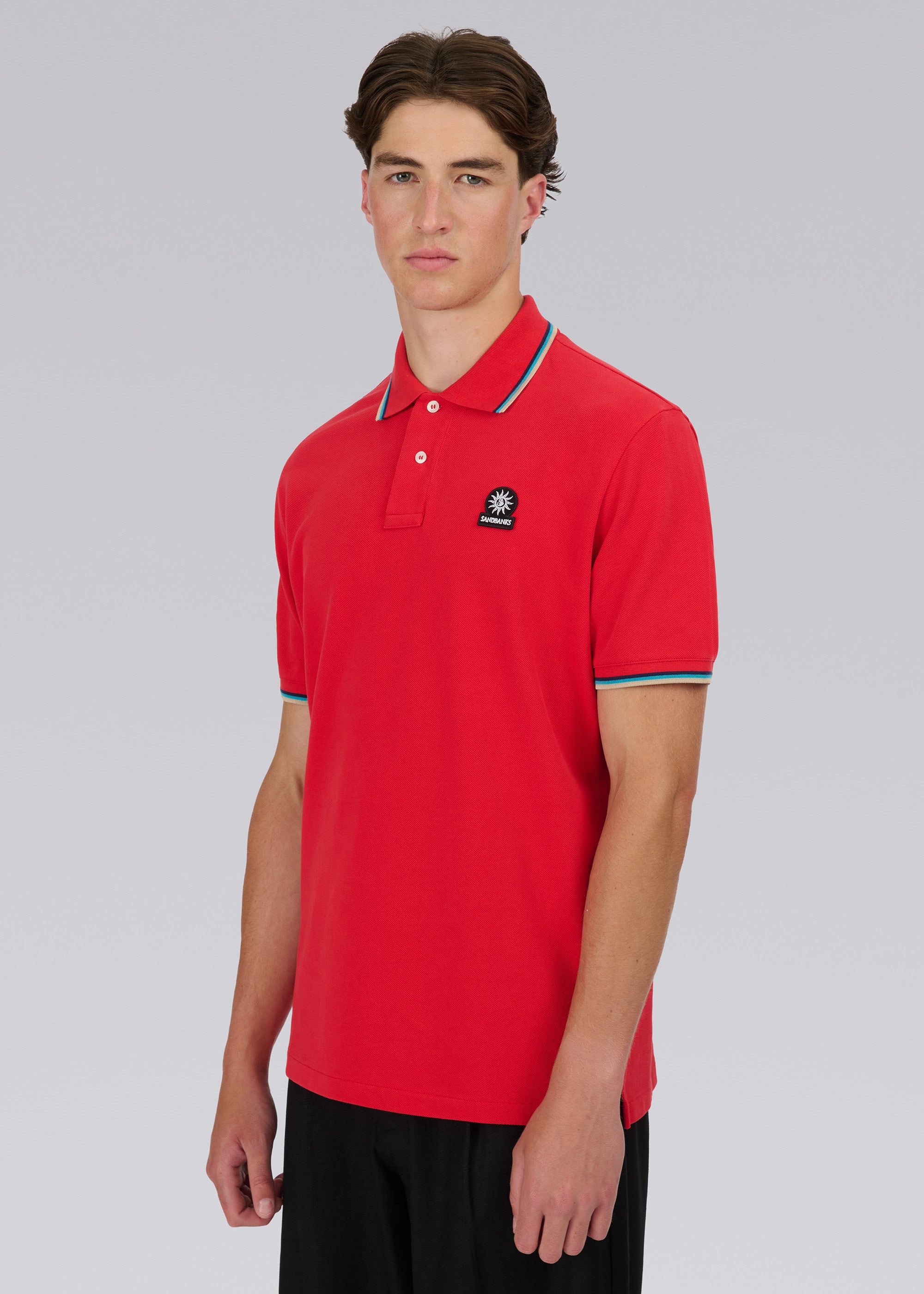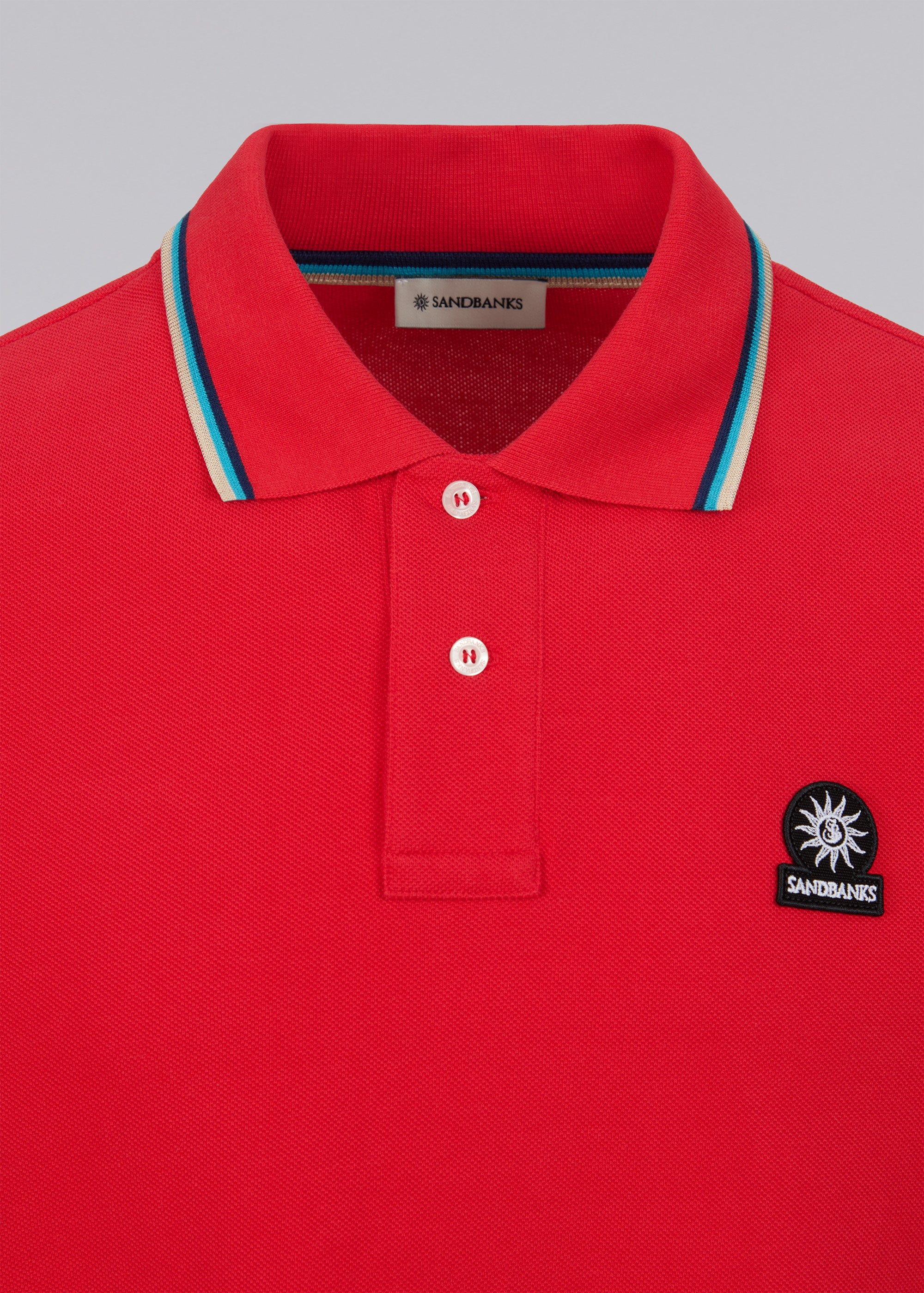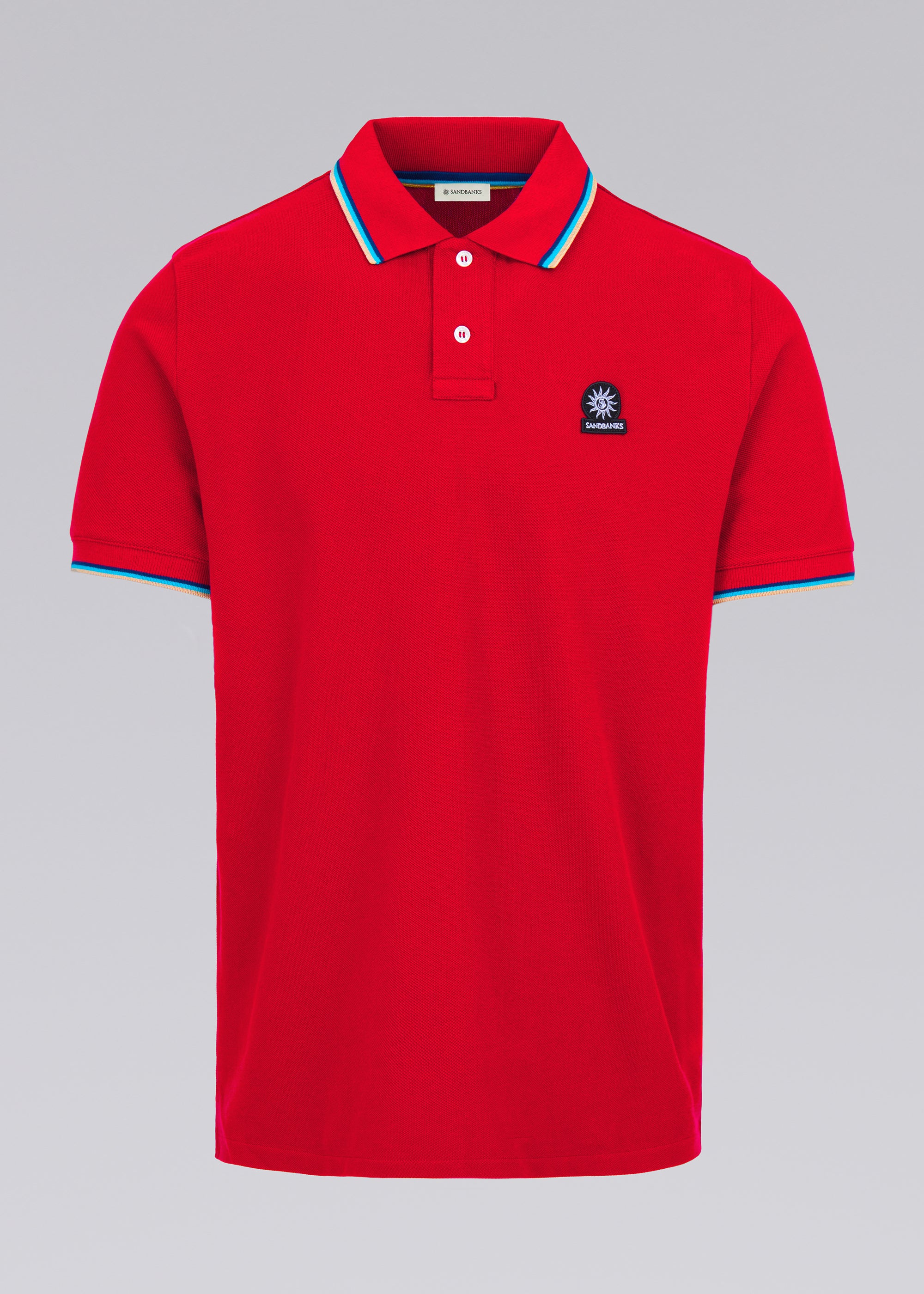 Sandbanks men's badge logo polo shirt in red, made from 100% organic cotton. This classic fitting 2 button polo shirt features an embroidered badge logo on the chest, tri-colour tipped ribbed collar, cuff and back neck binding.