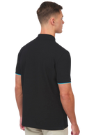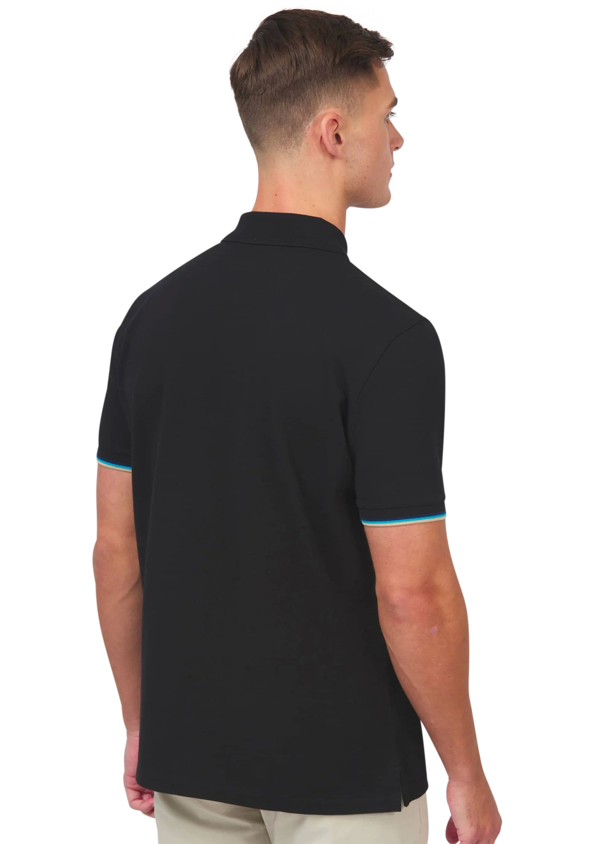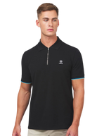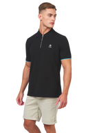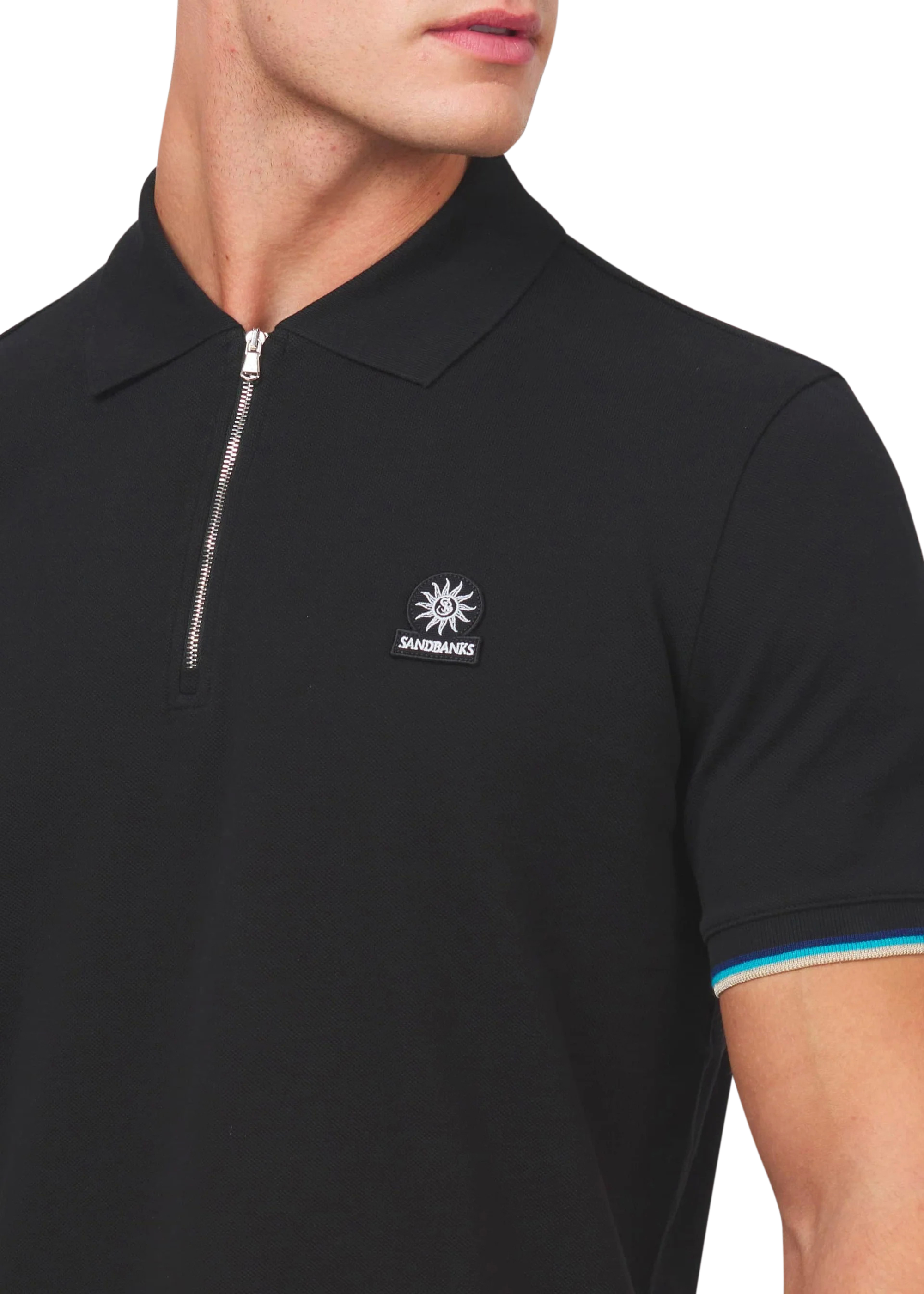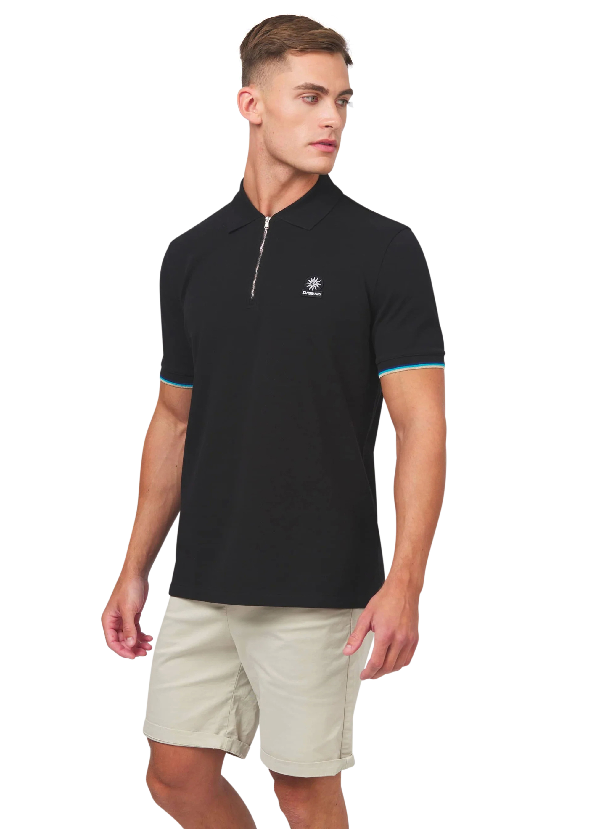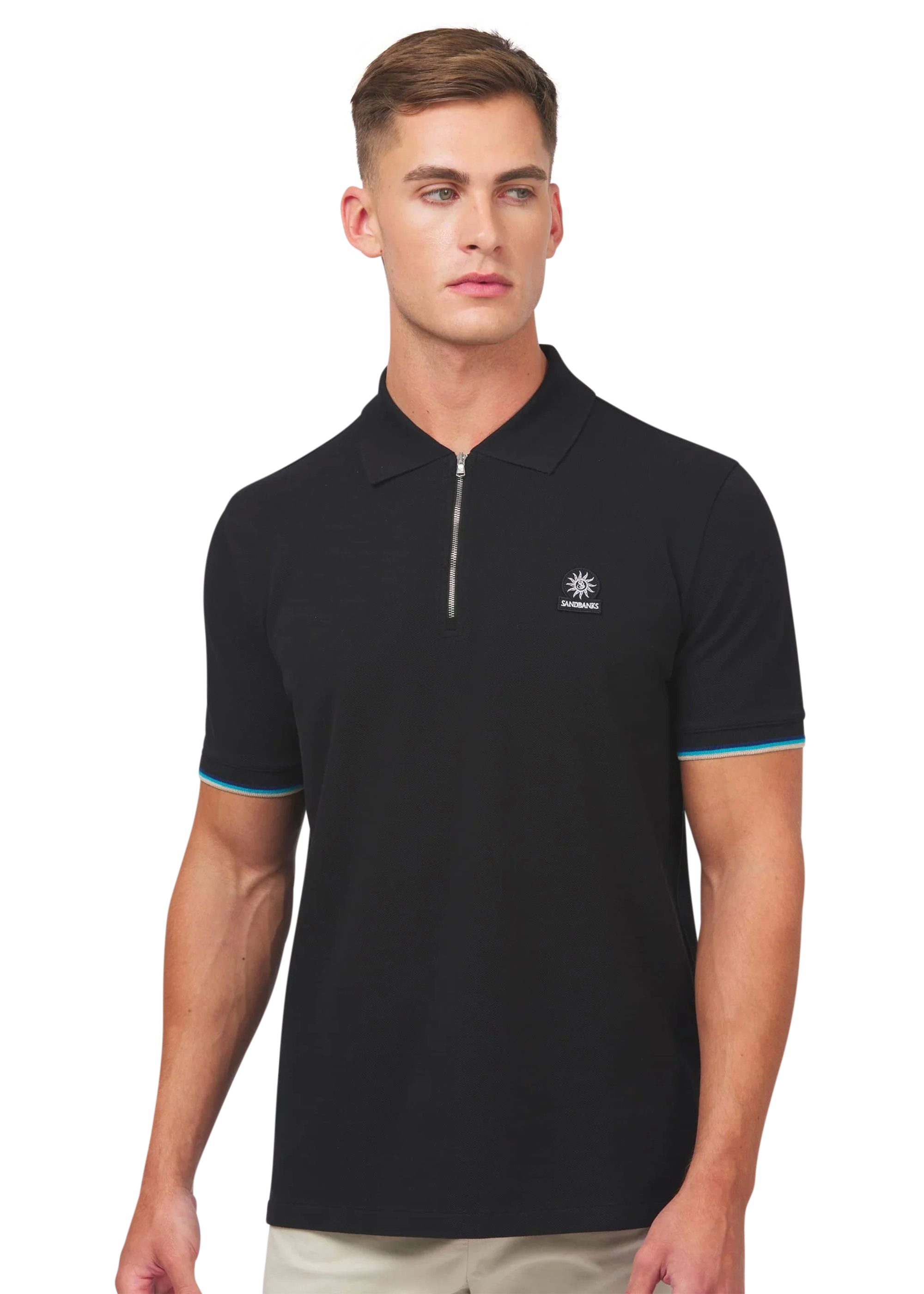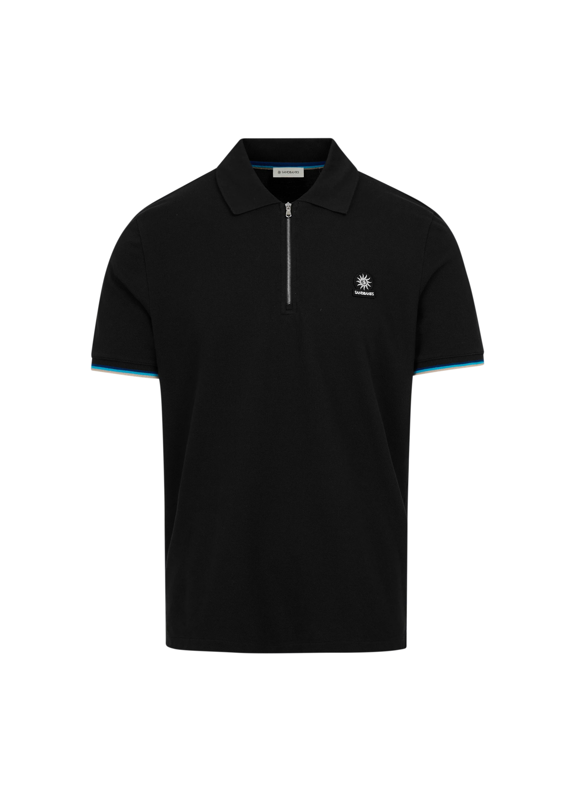 Sandbanks men's badge logo zip polo shirt in black, made from 100% organic cotton. This classic fitting zip polo shirt features an embroidered badge logo on the chest, tri-colour tipped knitted cuff and back neck binding.