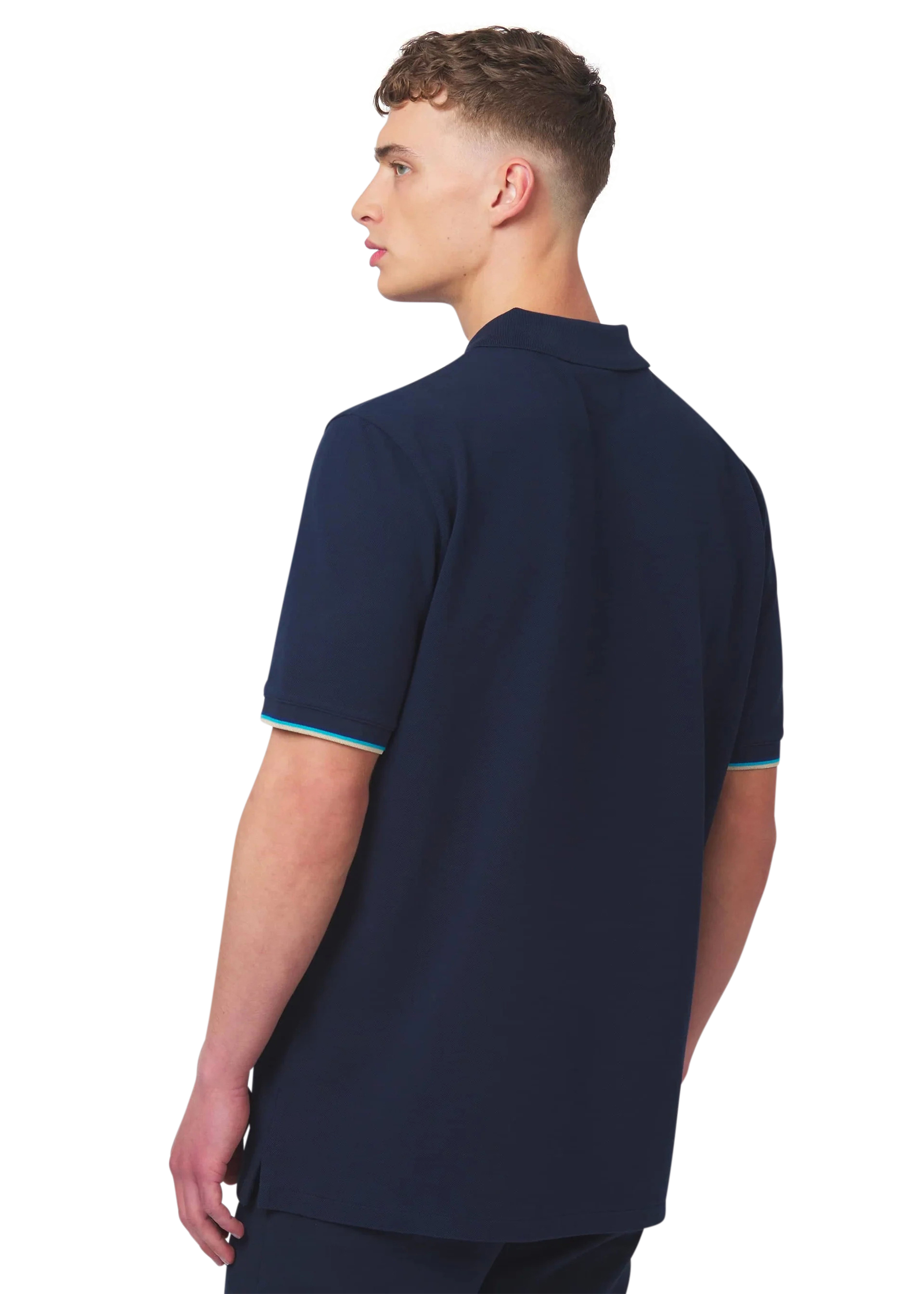 - Tri-colour tipped cuff and back neck binding
