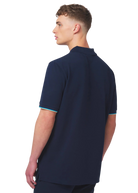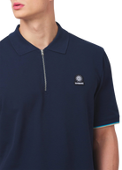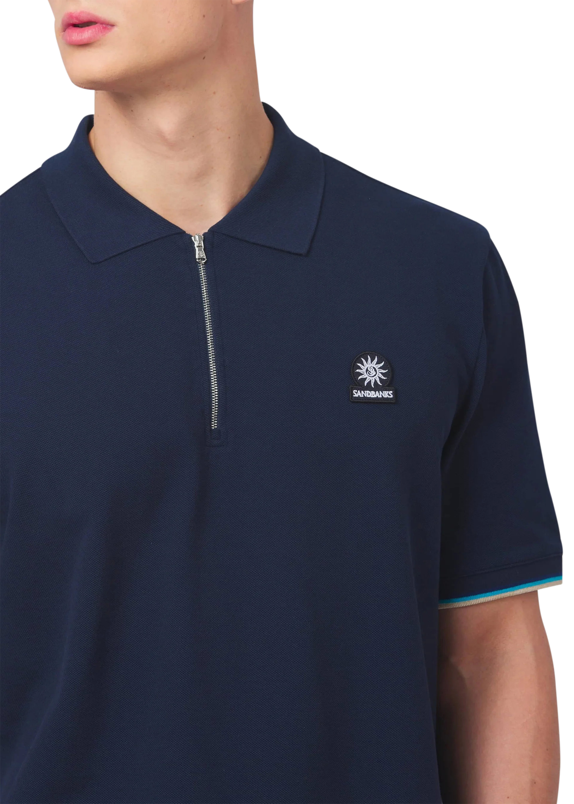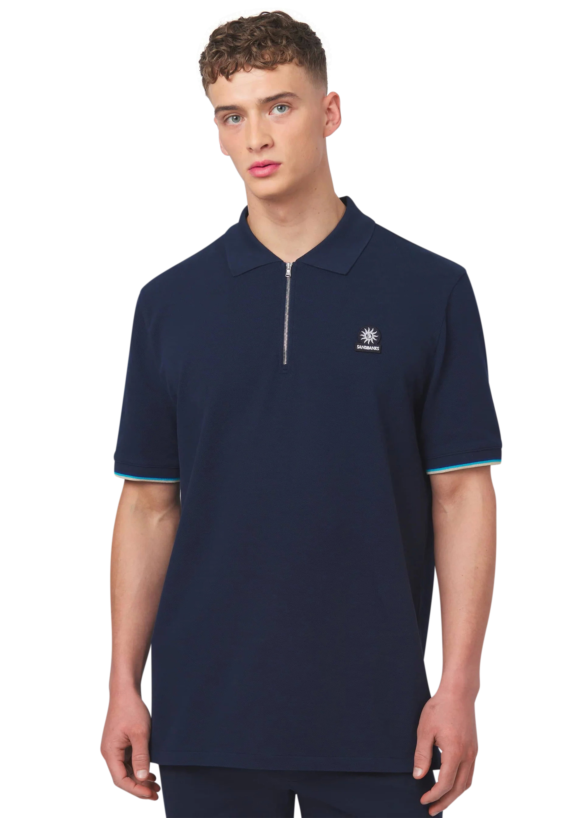 Sandbanks men's badge logo zip polo shirt in navy, made from 100% organic cotton. This classic fitting zip polo shirt features an embroidered badge logo on the chest, tri-colour tipped knitted cuff and back neck binding.